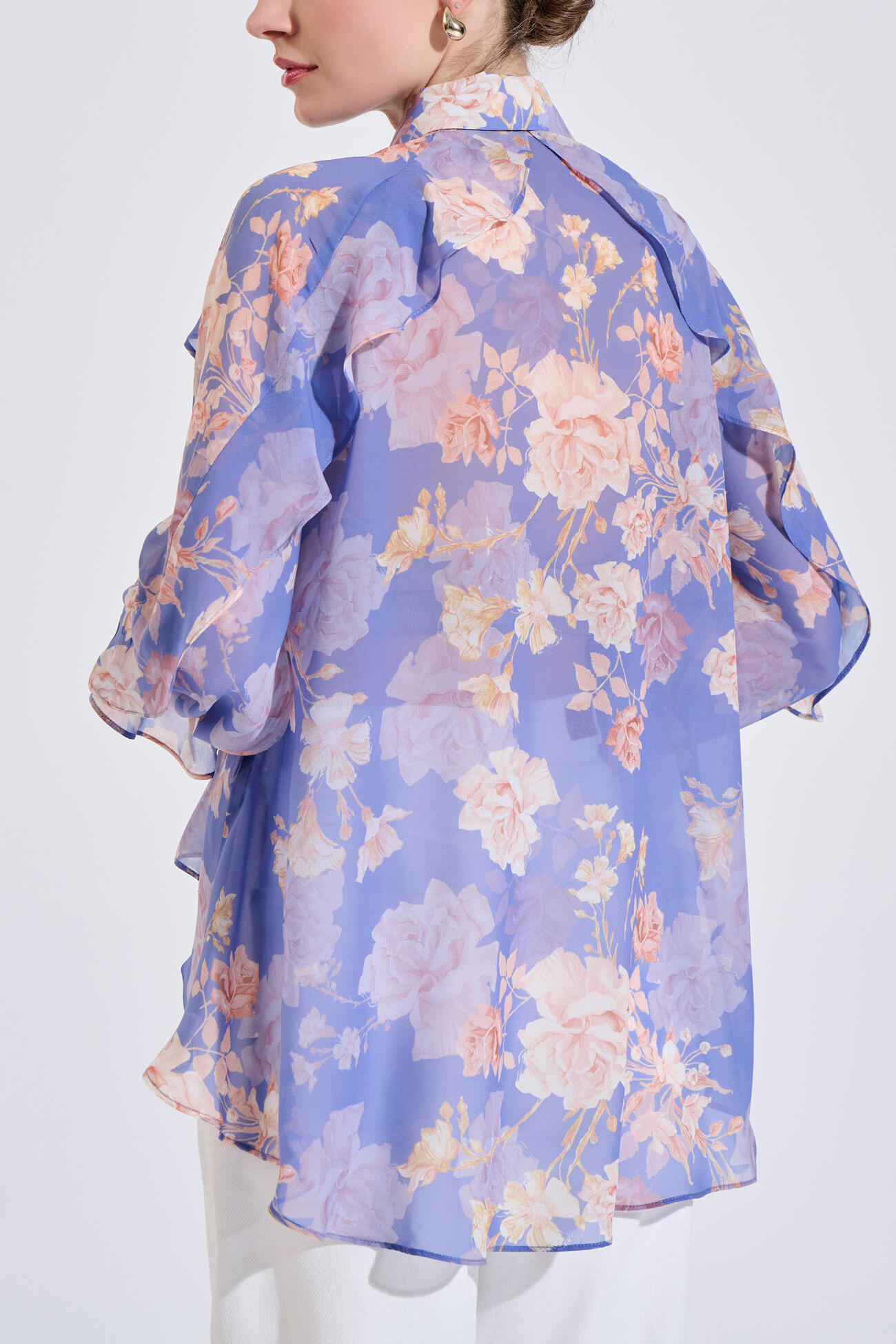 Printed shirt made of lightweight, sheer fabric. Features a classic collar and button fastening. Ruffle details on the shoulders and sleeves, long sleeves with elasticated cuffs. Relaxed fit.