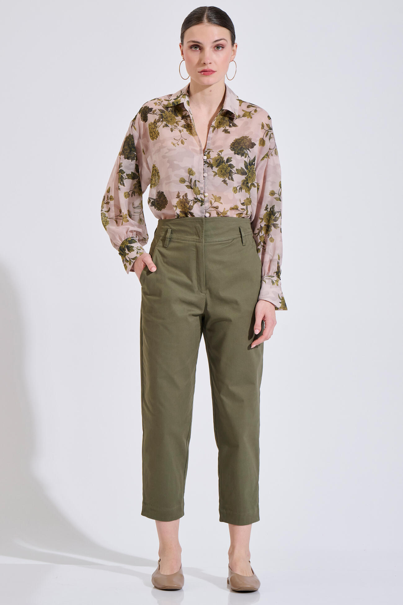 Printed shirt with V-neck and fabric-covered buttons