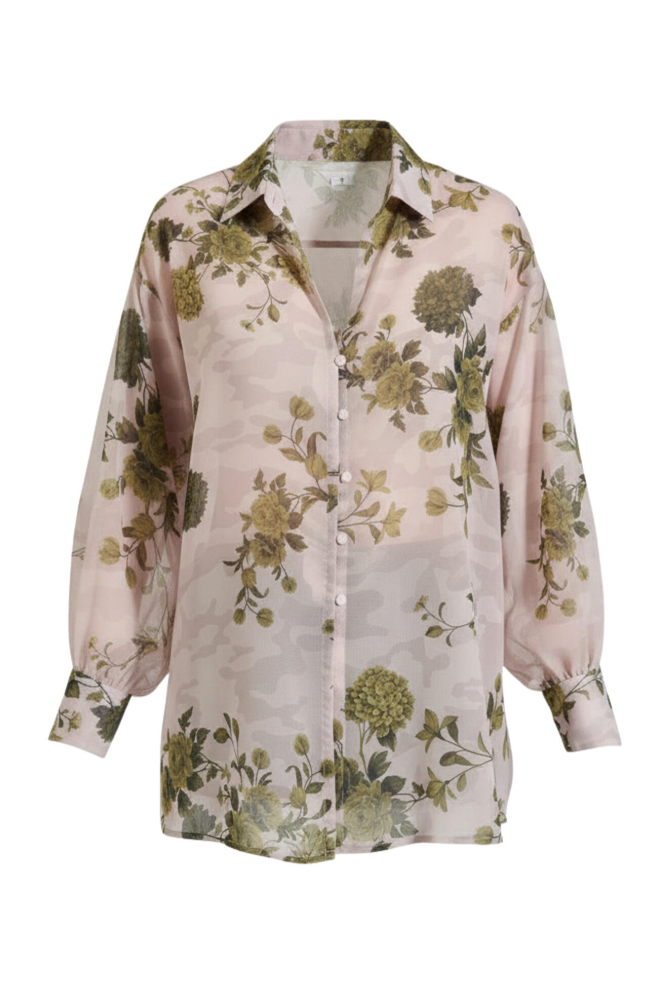 Printed shirt with a V-neck and front fastening with fabric-covered buttons. Features long sleeves with cuffs and a relaxed fit.