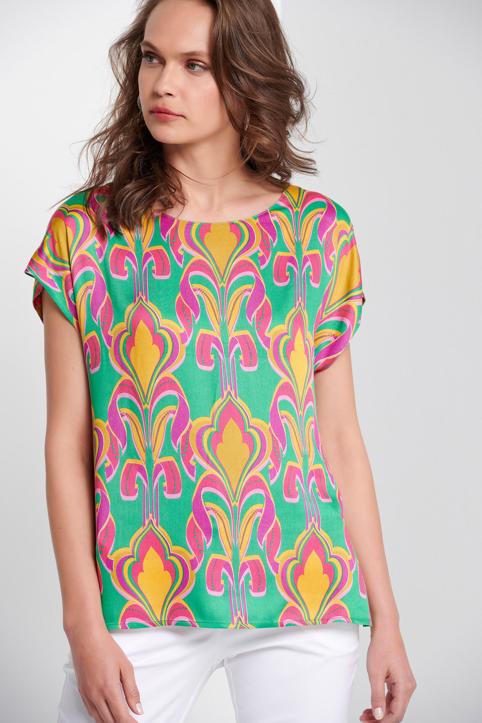 Blouse with bright colors SKU 10-341785-0 Description Satin blouse with round neckline. It has a combination with bright colors. Synthesis 100% viscose