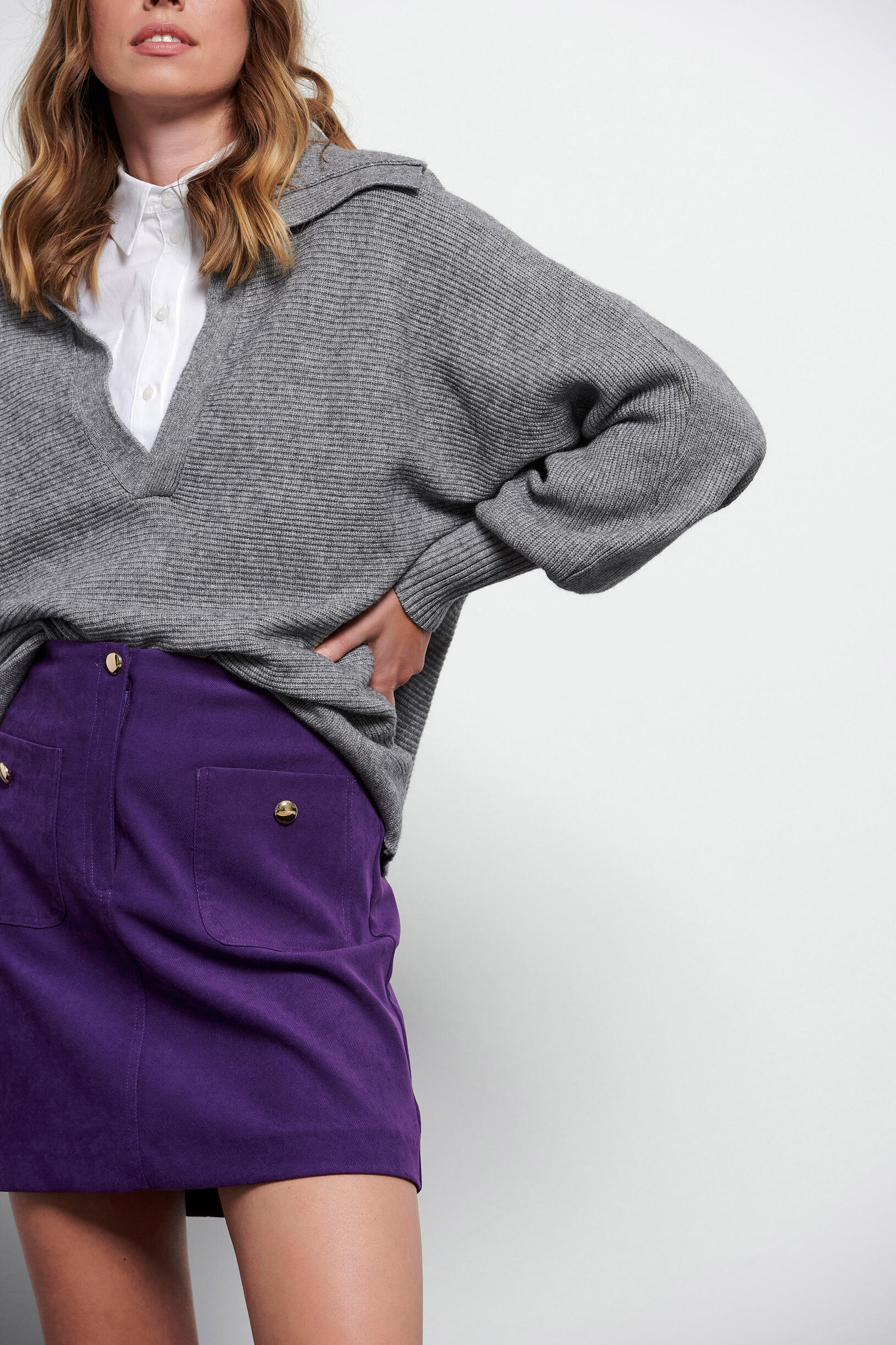 Suede mini skirt SKU 10-060743-0 Description Suede mini skirt with back zip closure and front pockets with decorative buttons. Synthesis 98% polyester 2% spandex