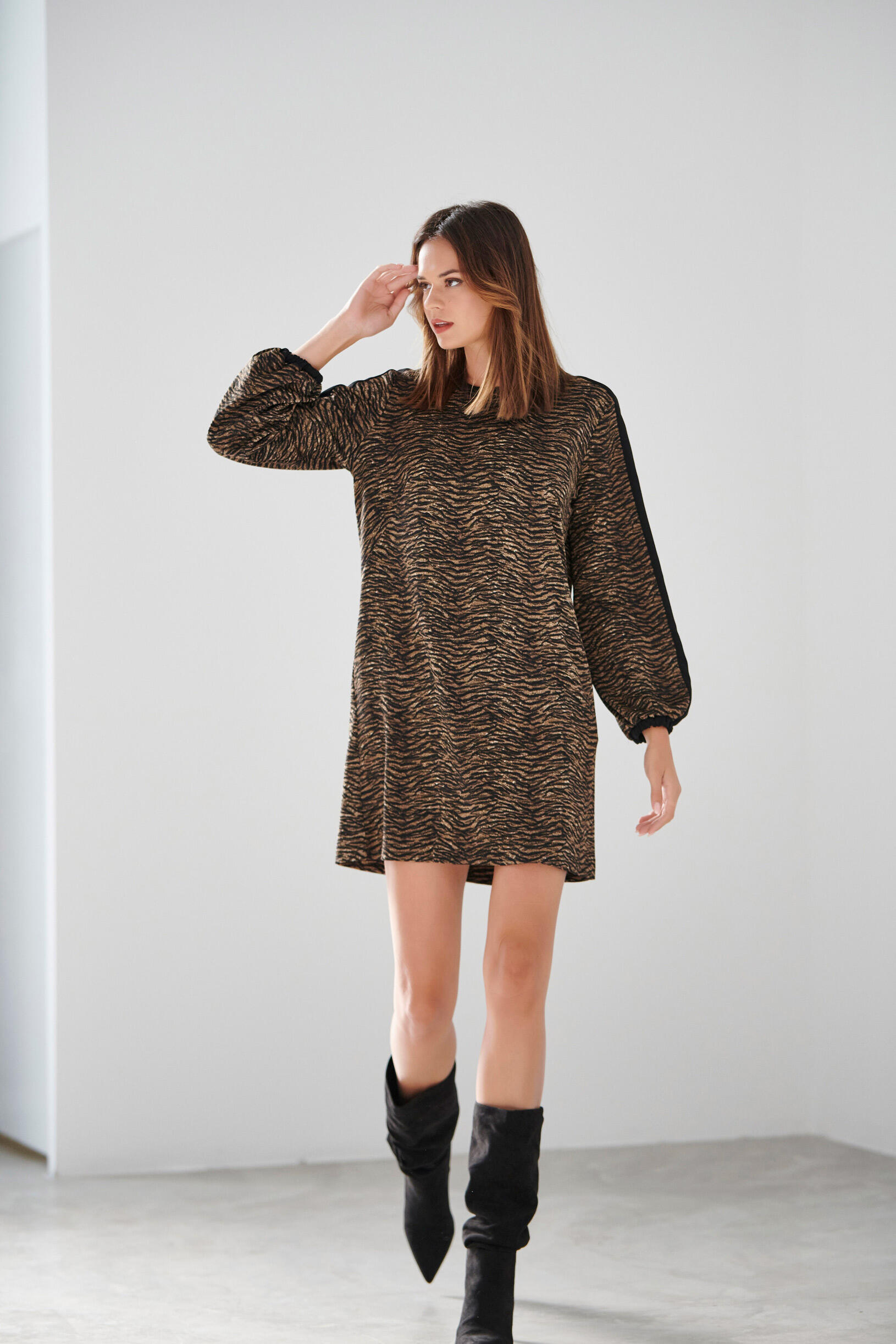 Φόρεμα animal print Κωδικός 10-341704-0 Περιγραφή Φόρεμα λαιμόκοψη σε φαρδιά γραμμή.Διαθέτει μακριά μανίκια με μονόχρωμο λάστιχο στο τελείωμα οπως και κούμπωμα στο πίσω μέρος. Σύνθεση 96% polyester 4% elastane