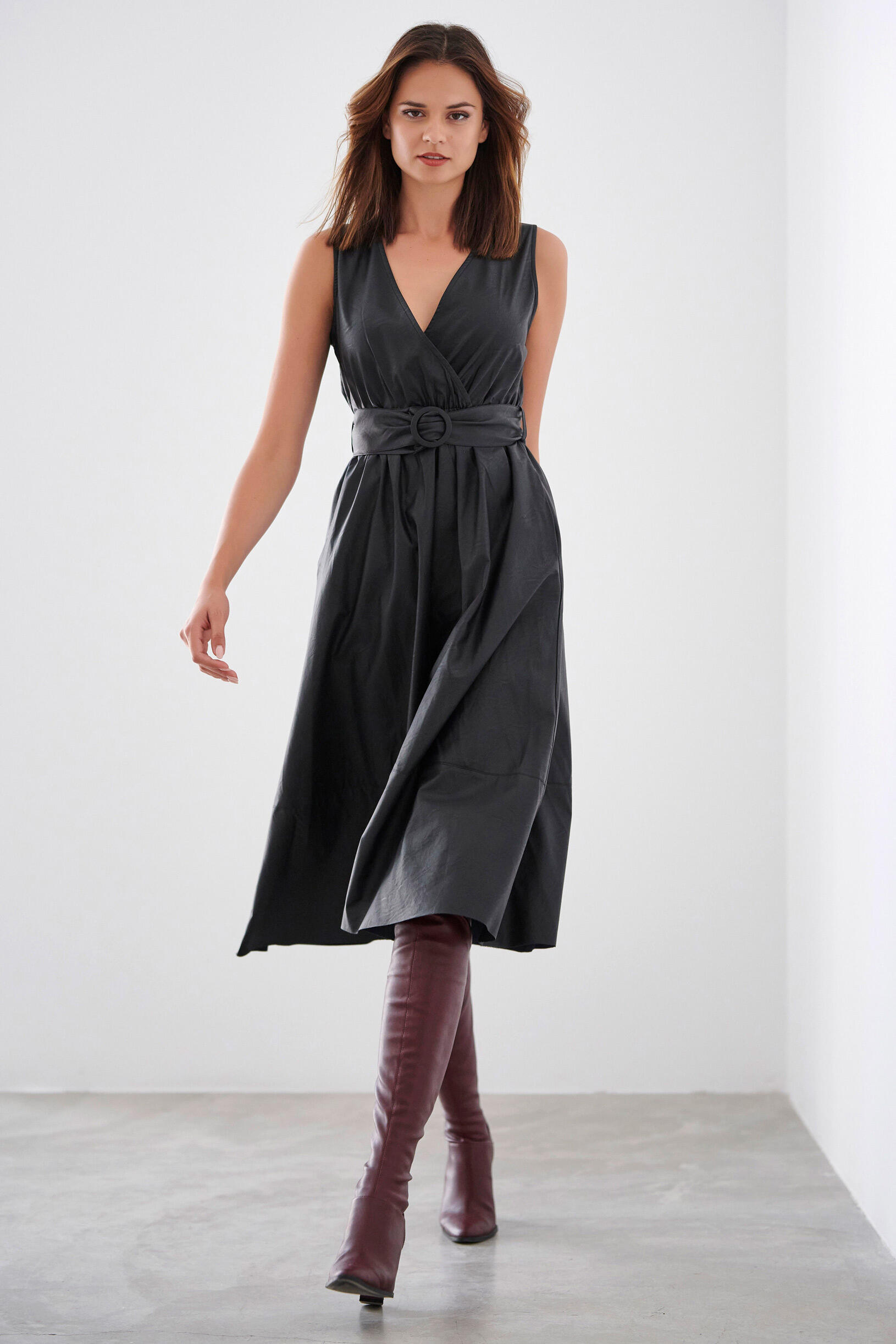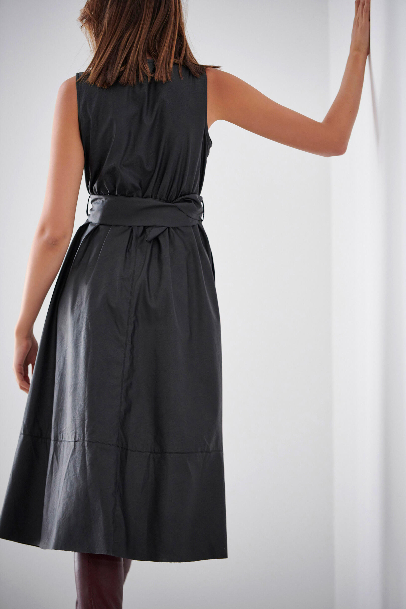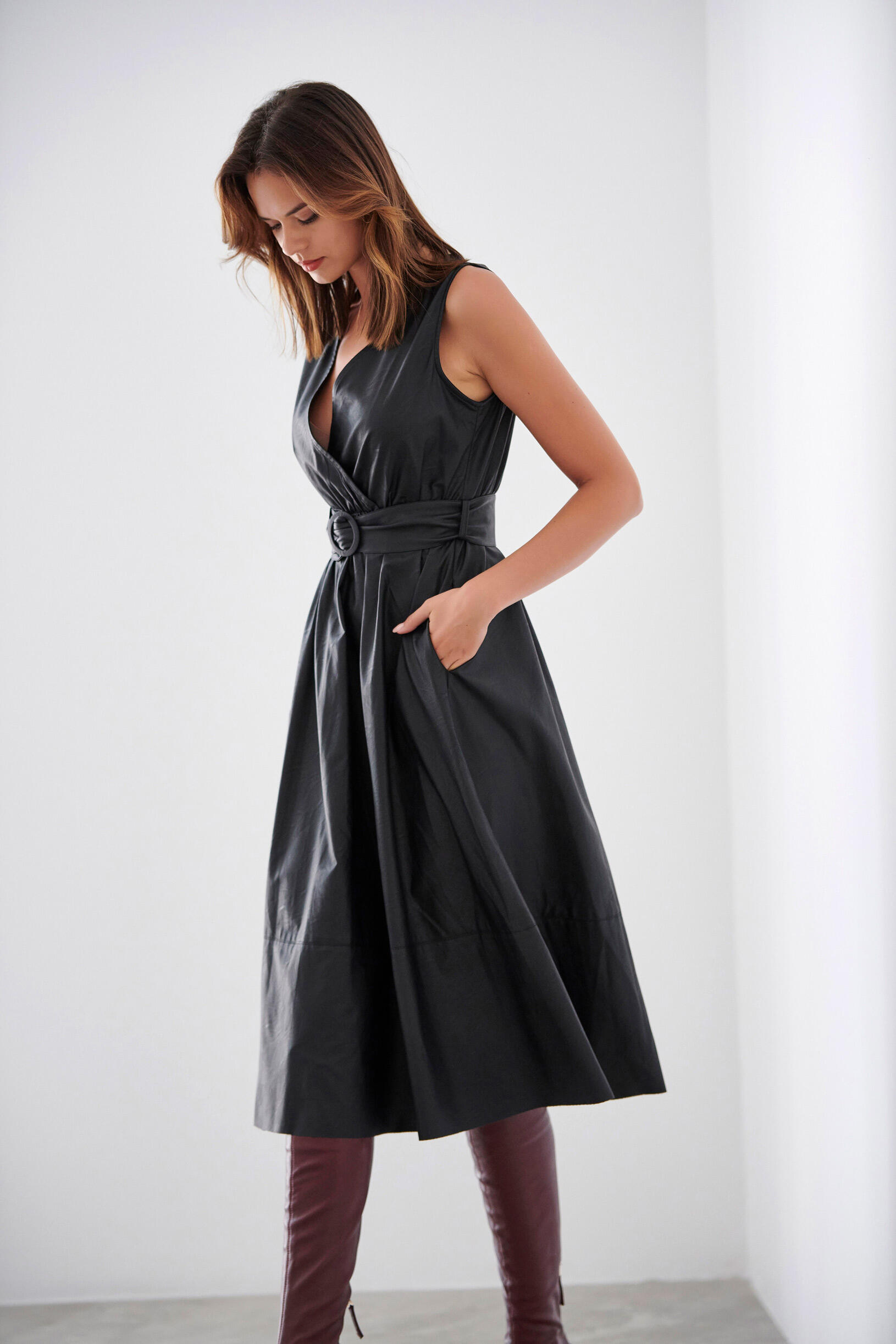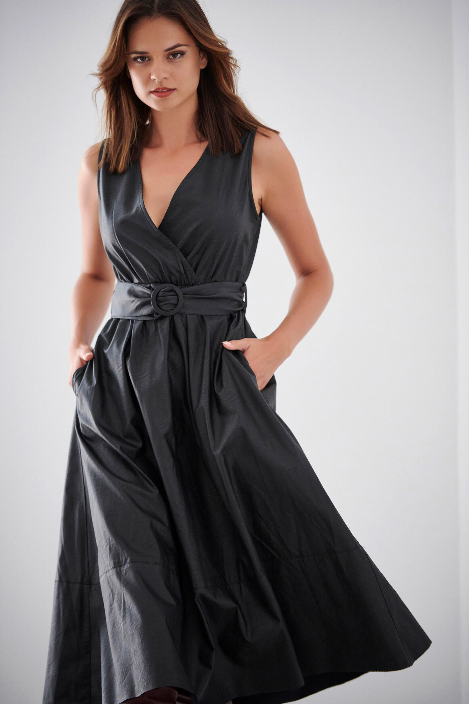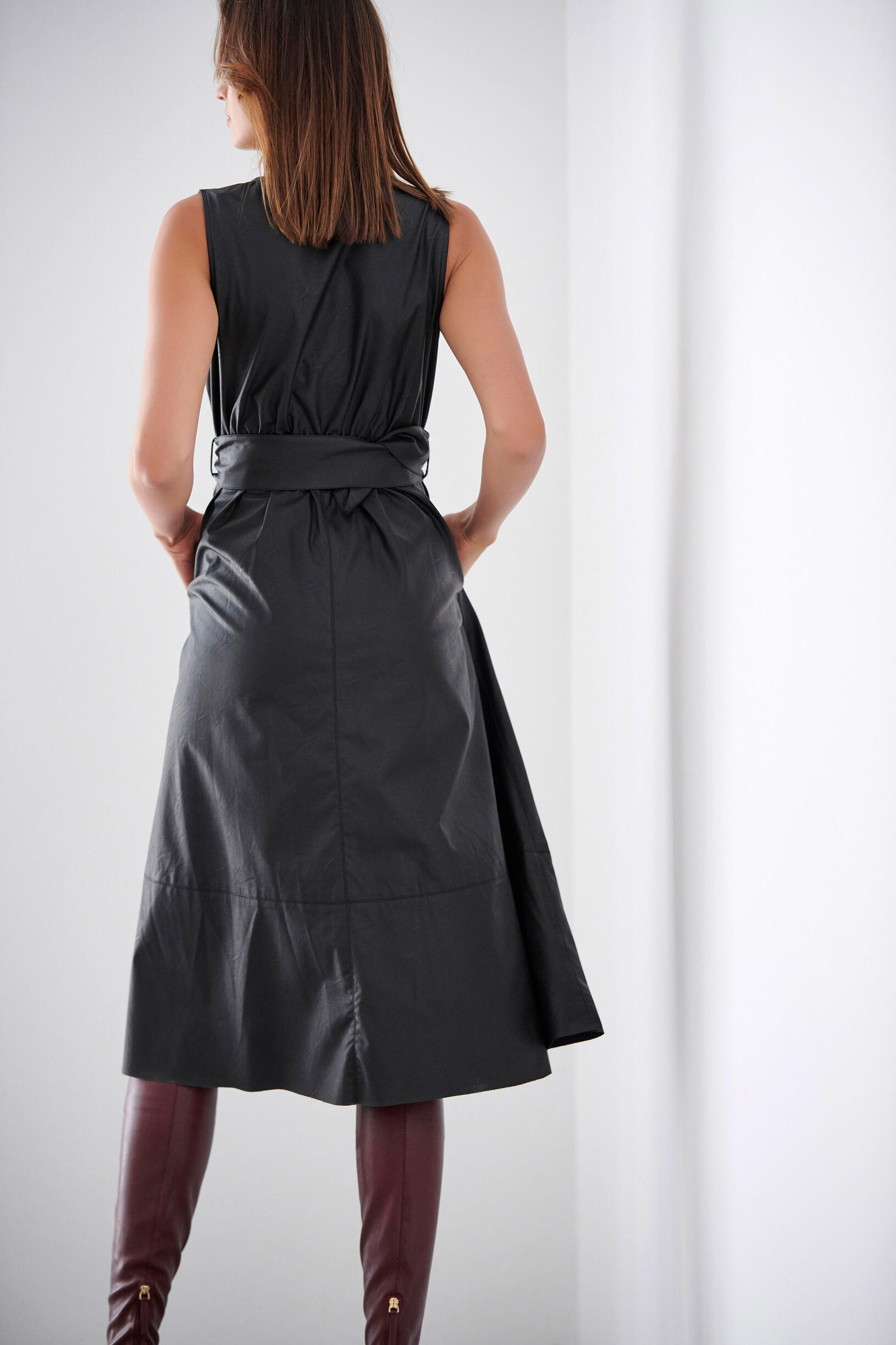 Φόρεμα κρουαζέ Κωδικός 10-010128-0 Περιγραφή Φόρεμα αμάνικο σε υφή δερματίνης.Διαθέτει λάστιχο και αποσπώμενη ζώνη στην μέση για καλύτερη εφαρμογή όπως και πλαϊνές τσέπες. Σύνθεση 100% polyurethane