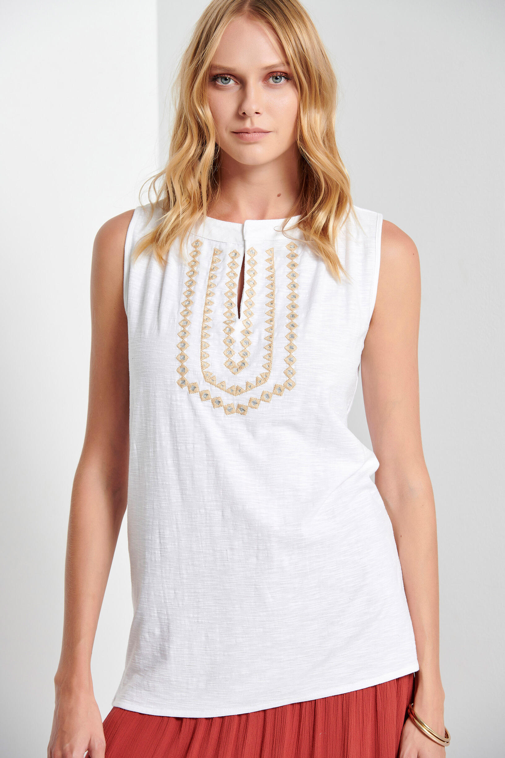 Μπλούζα αμάνικη με κέντημα Κωδικός 20-121449-0 Περιγραφή Αμάνικη βαμβακερή μπλούζα με κέντημα μπροστα. Διαθέτει στρογγυλή λαιμόκοψη με άνοιγμα μπροστά και σούρες στο πίσω μέρος. Σύνθεση 100% cotton