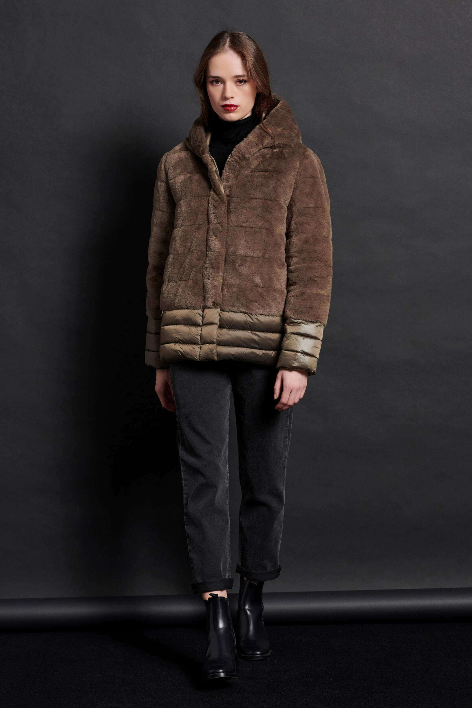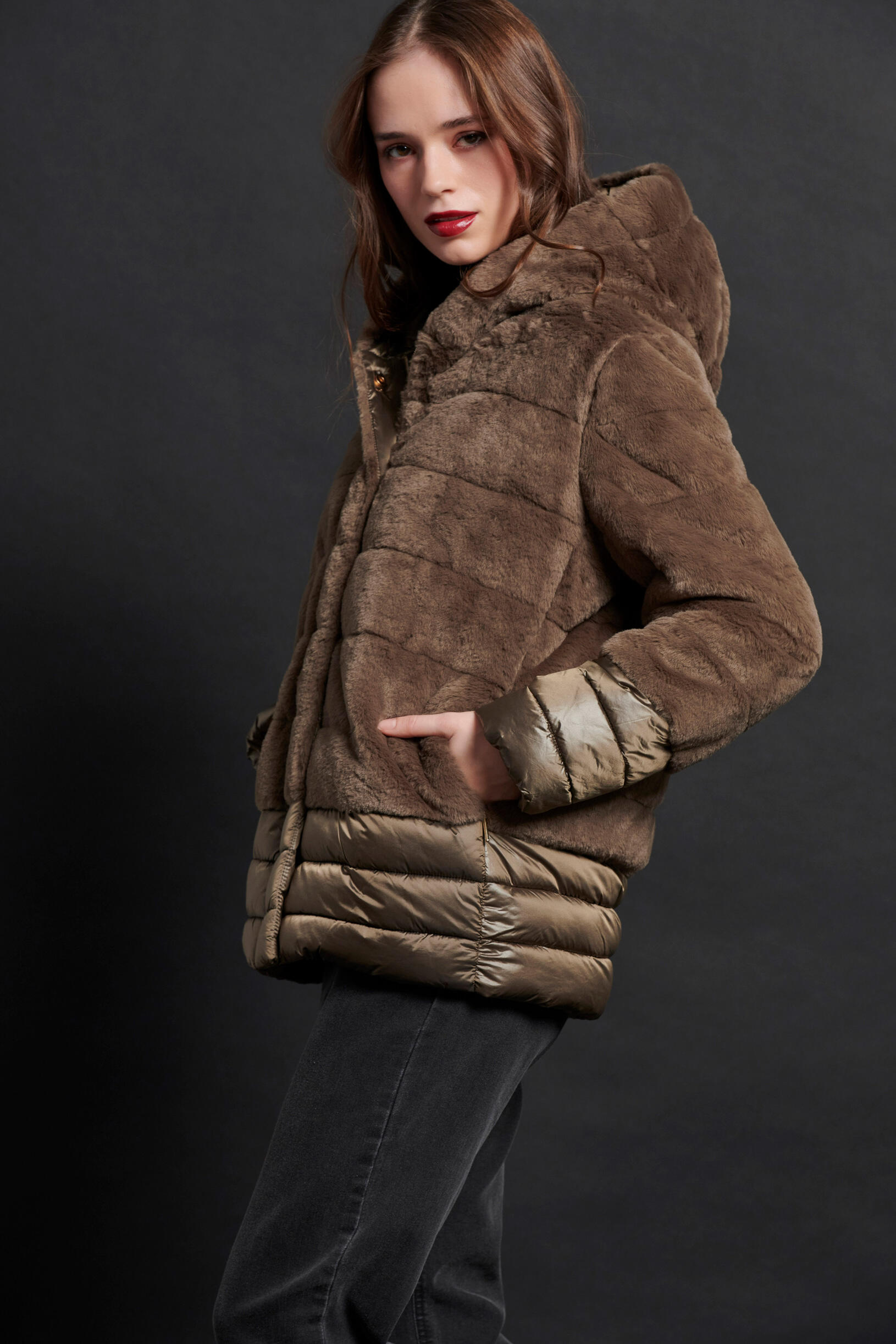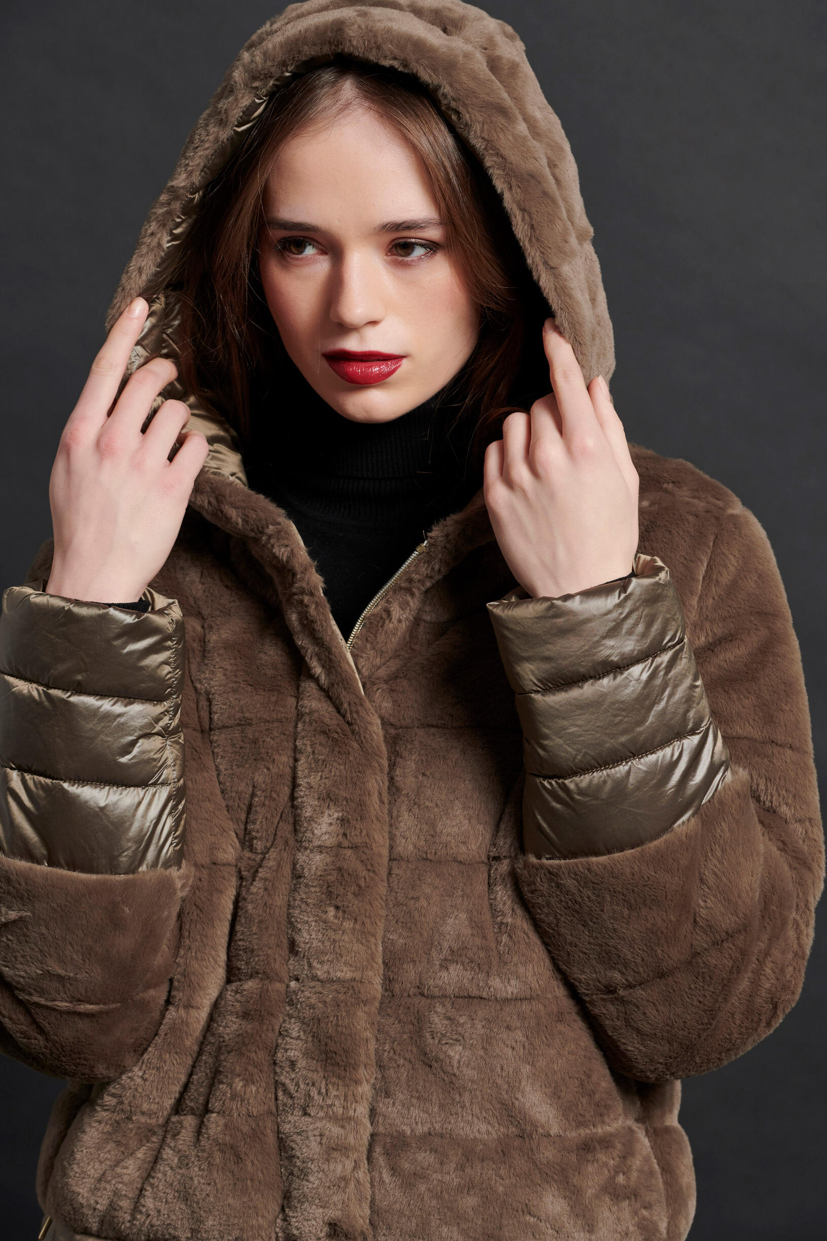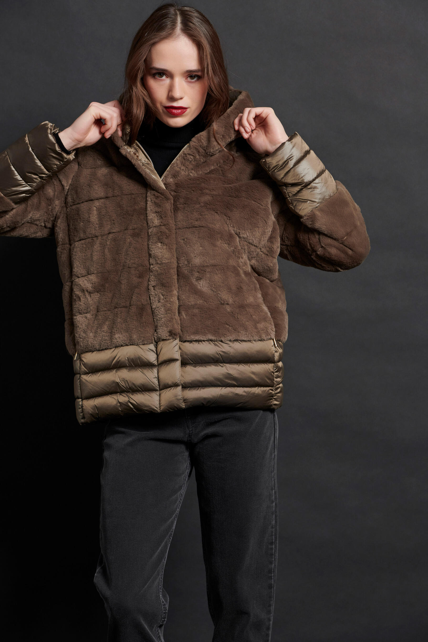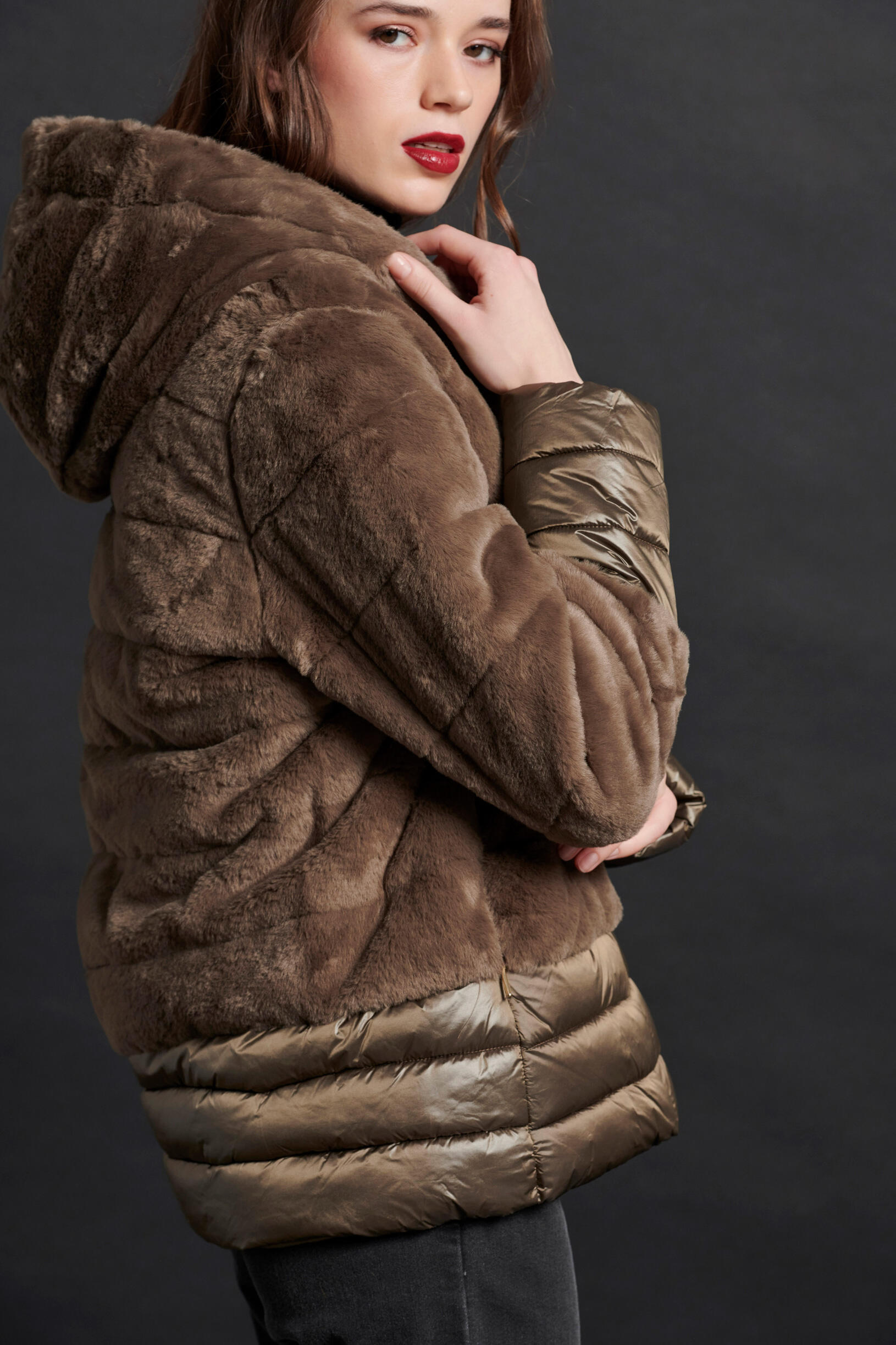 Μπουφάν καπιτονέ με κουκούλα Κωδικός 20-380832-0 Περιγραφή Μπουφάν από οικολογική γούνα με κουκούλα, πλαινές τσέπες και φερμουάρ που κλείνει μπροστά. Σύνθεση 100% polyamide