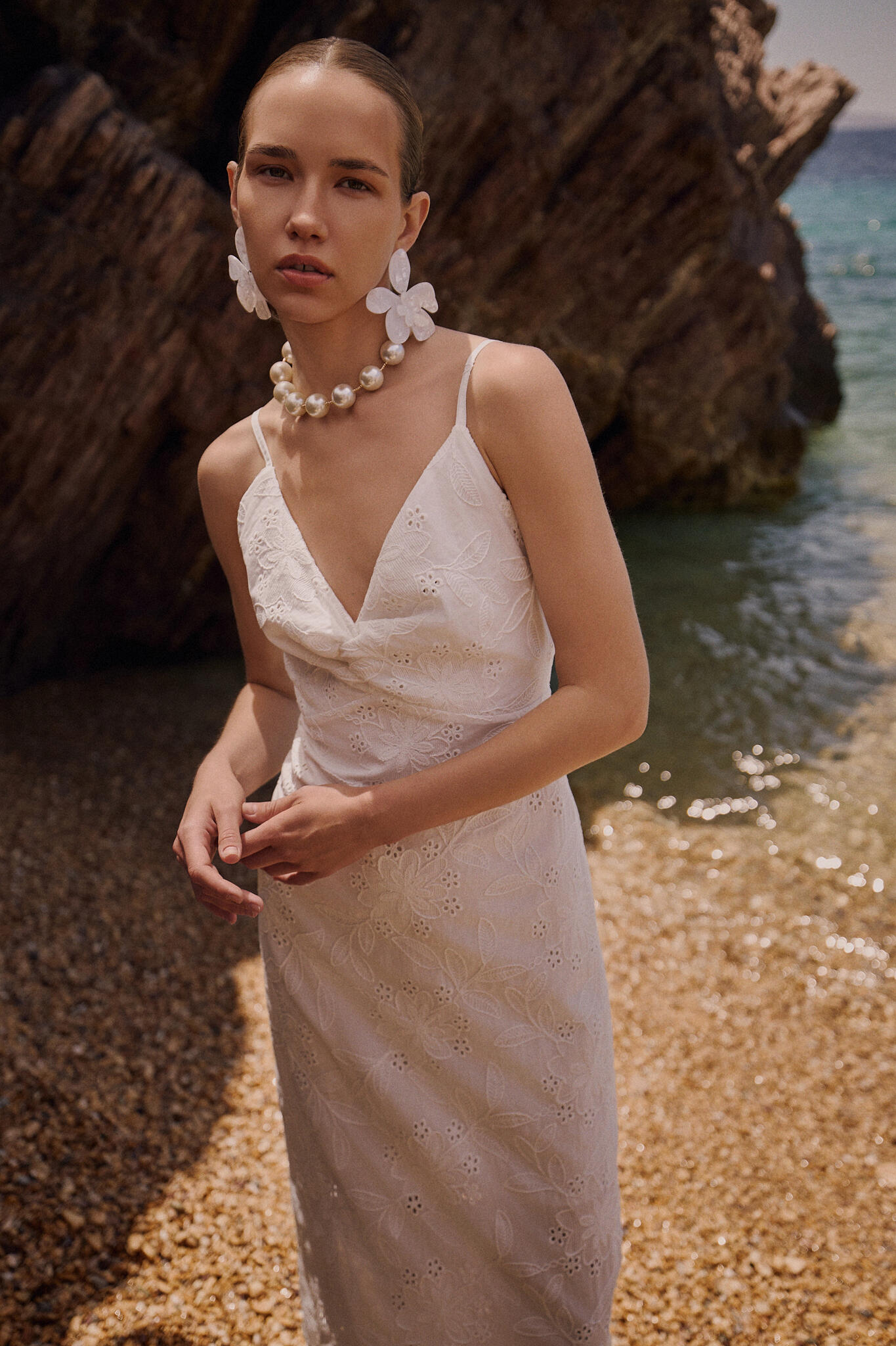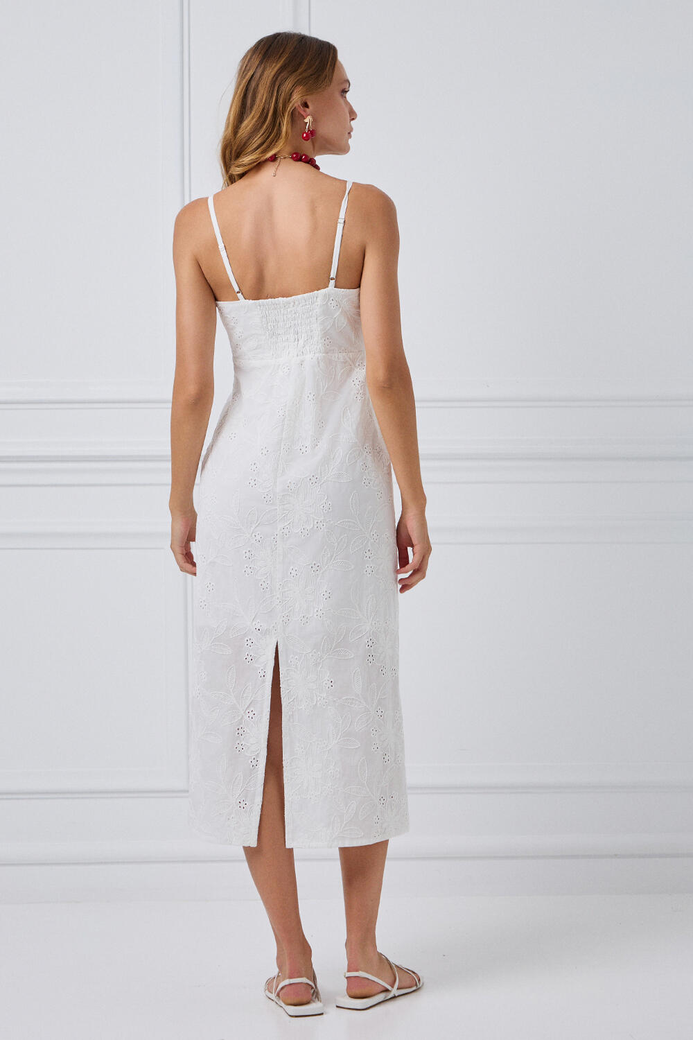Φόρεμα broderie Κωδικός 10-350461-0 Περιγραφή Φόρεμα broderie με κόμπο στο ντεκολτέ, λεπτή τιράντα και φερμουάρ που κλείνει στο πλάι. Σύνθεση 100% cotton