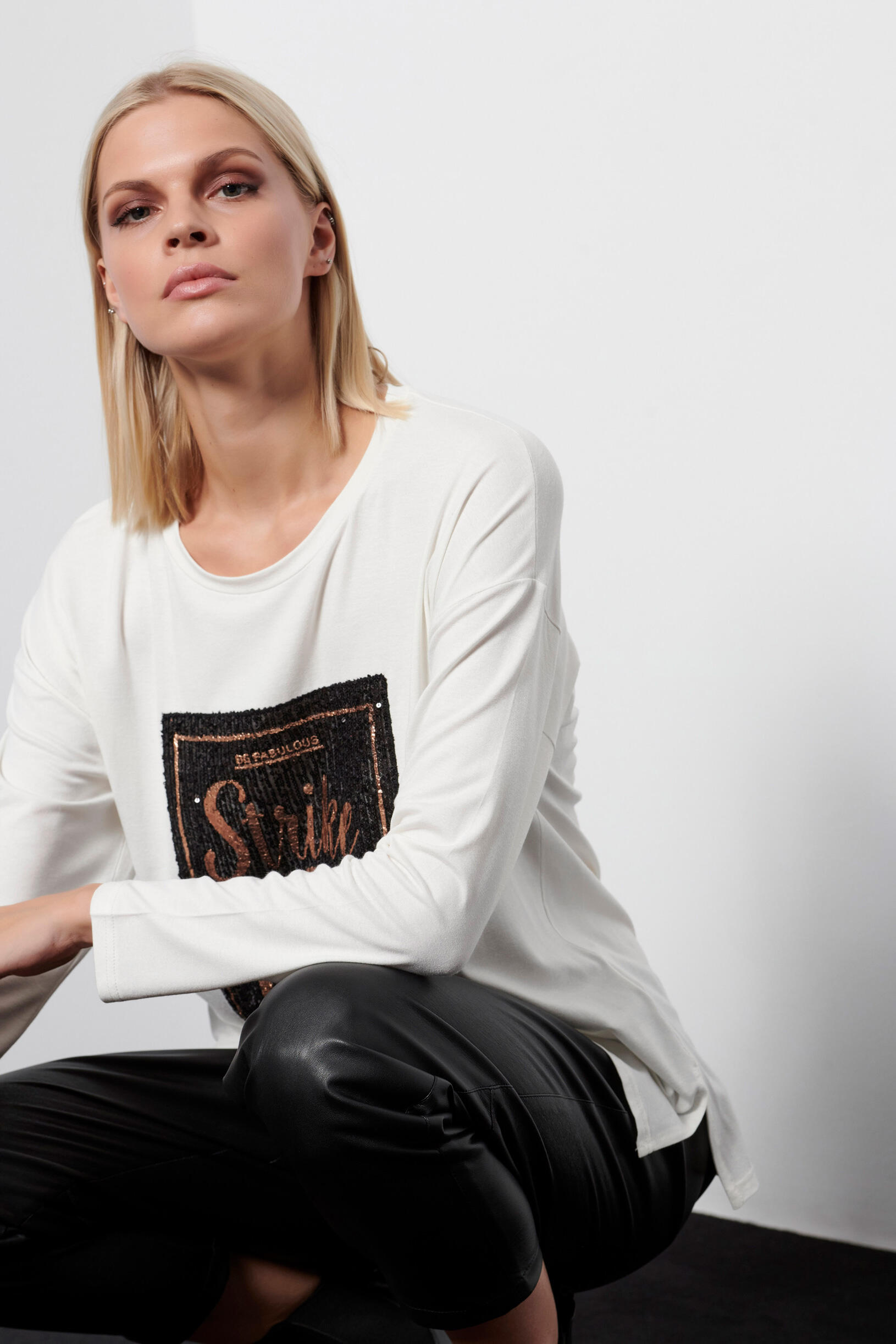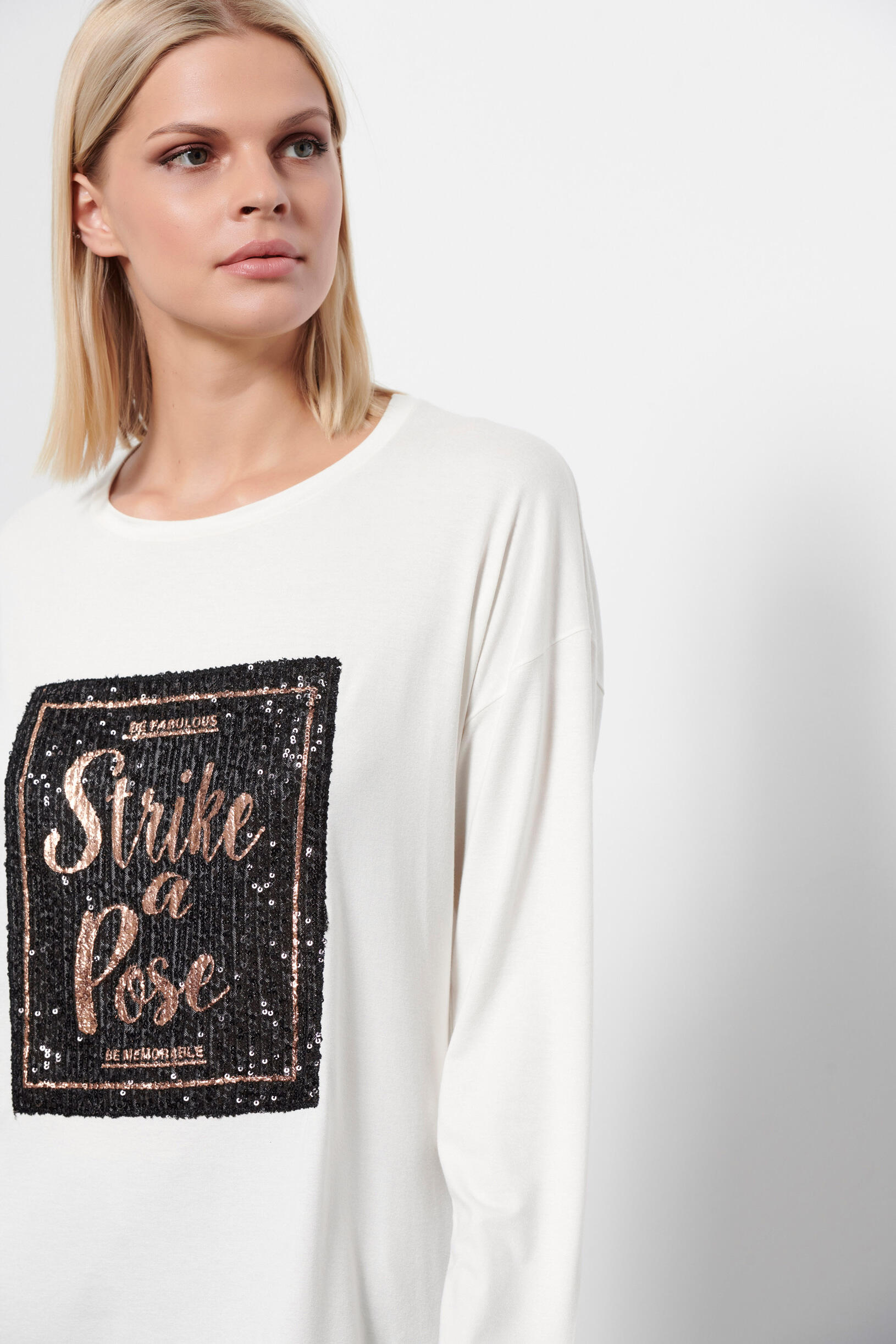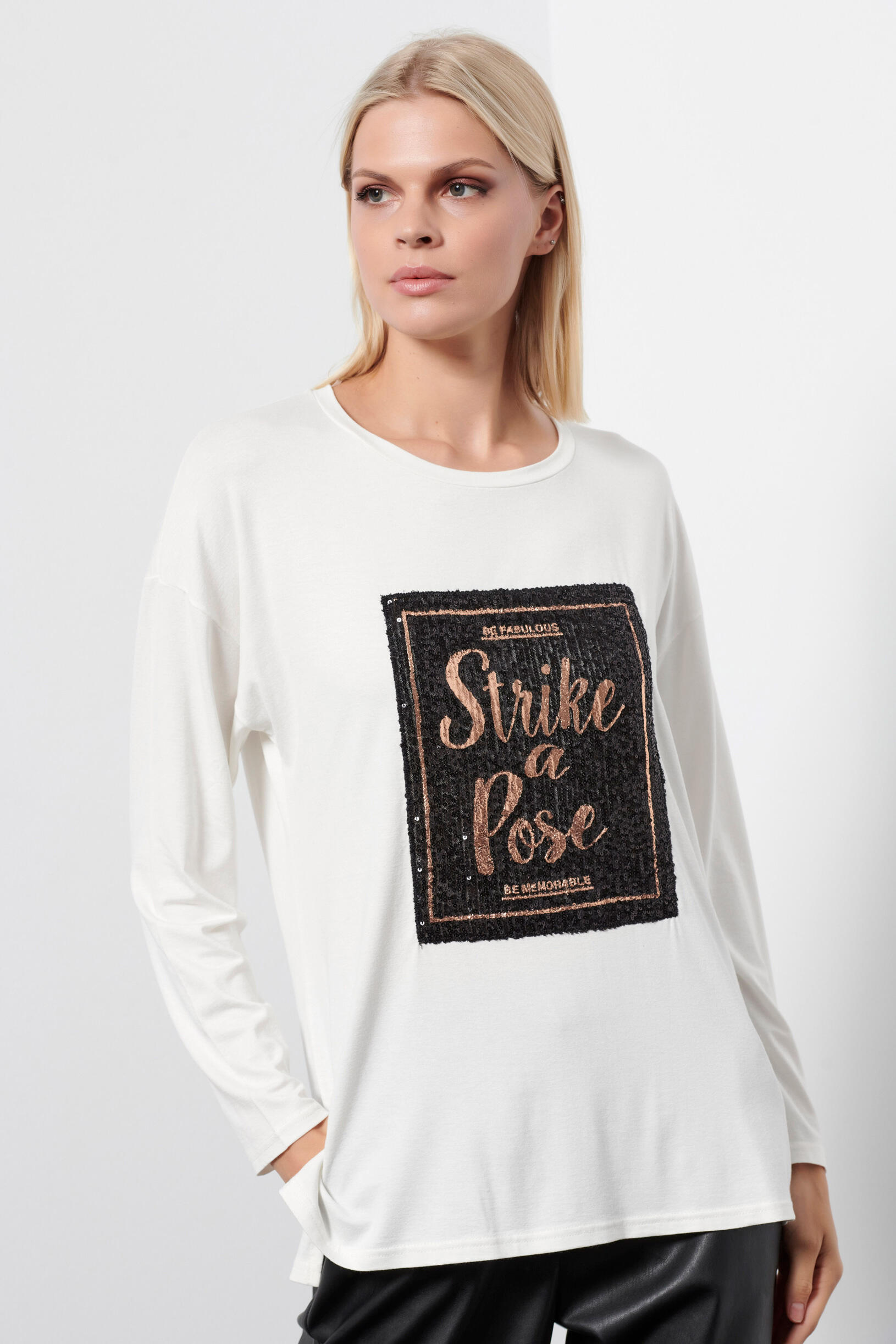 Μακρυμάνικη μπλούζα με σχέδιο με παγιέτα Κωδικός 10-120596-0 Περιγραφή Μακρυμάνικη μπλούζα με διακοσμητικό σχέδιο με παγιέτα στο μπροστινό μέρος. Στρογγυλή λαιμόκοψη. Σύνθεση 92% viscose 8% elastane