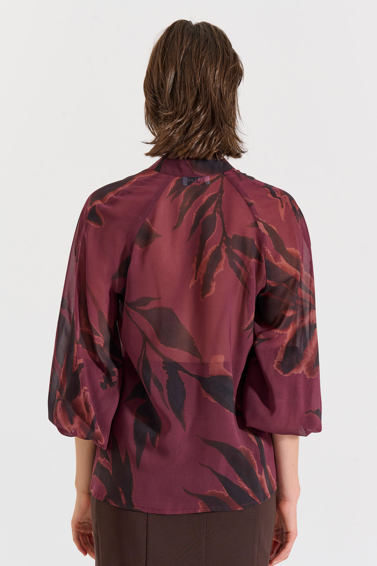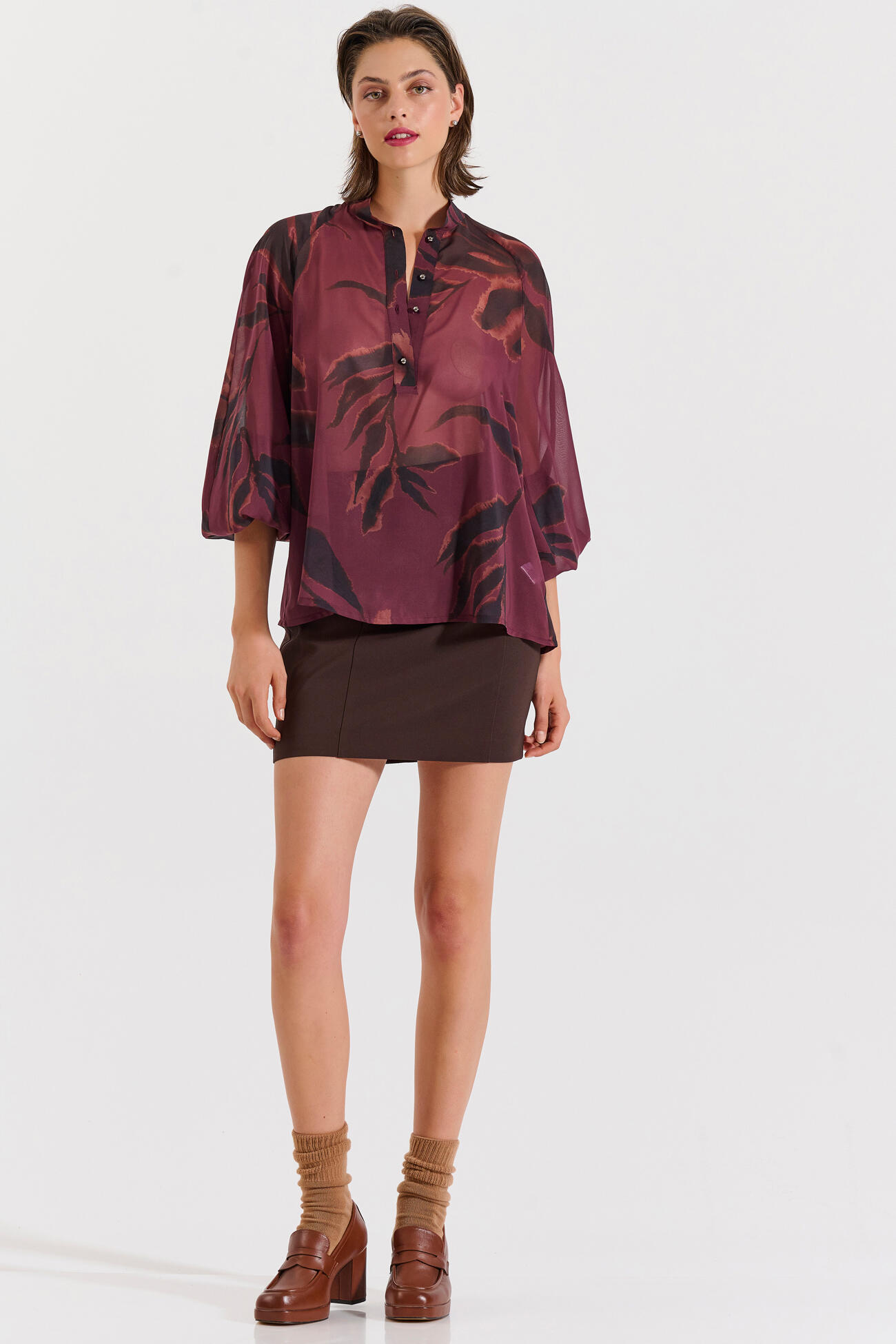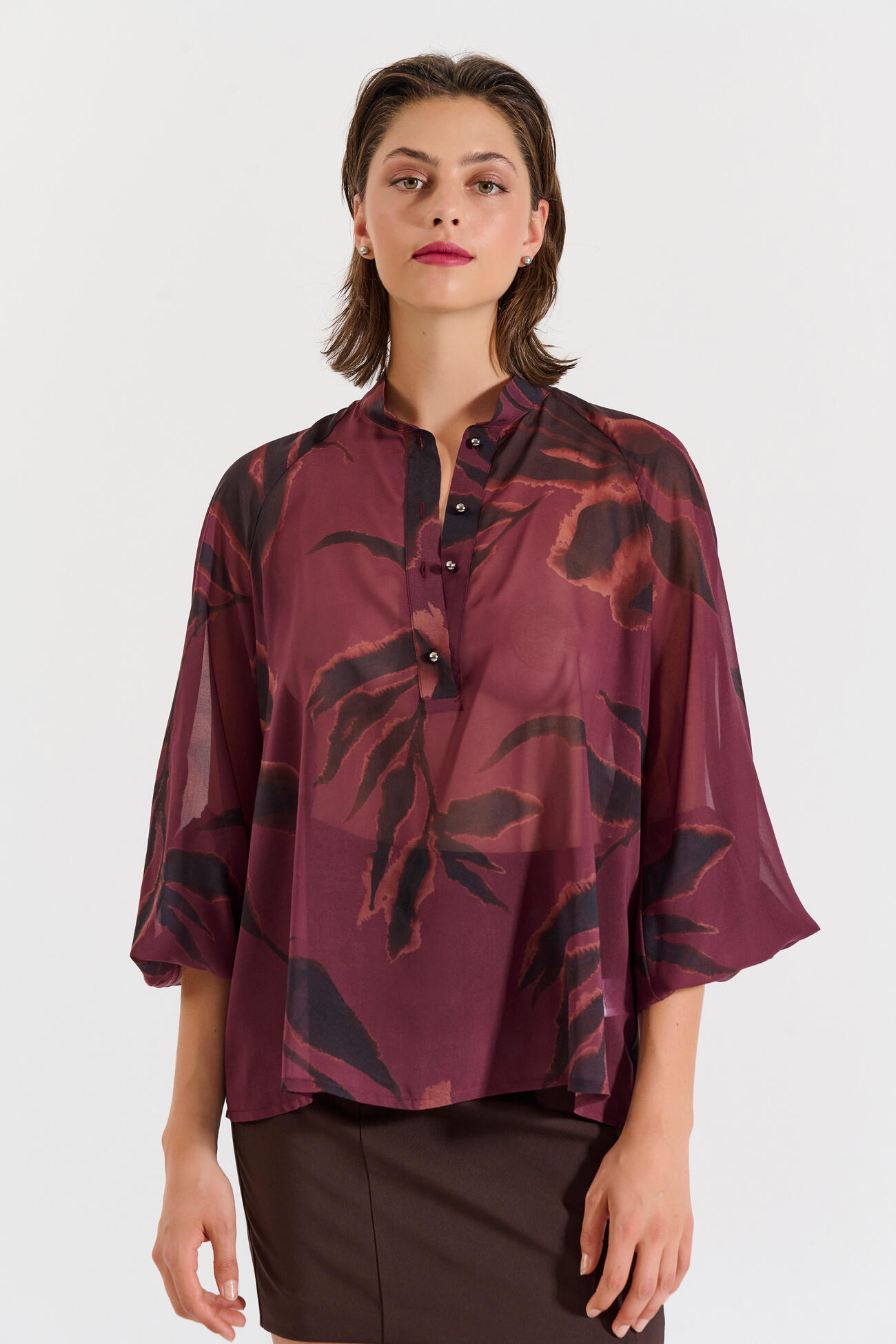 Αέρινο τοπ με εντυπωσιακό εμπριμέ μοτίβο και όρθιο γιακά με κουμπιά. Τα μανίκια 3/4 και η χαλαρή γραμμή του το καθιστούν ιδανικό για κομψές και σύγχρονες εμφανίσεις.