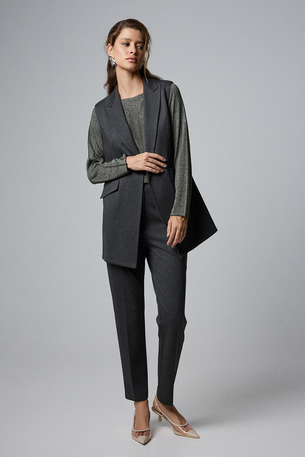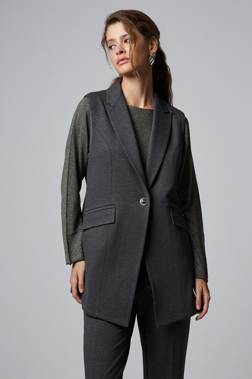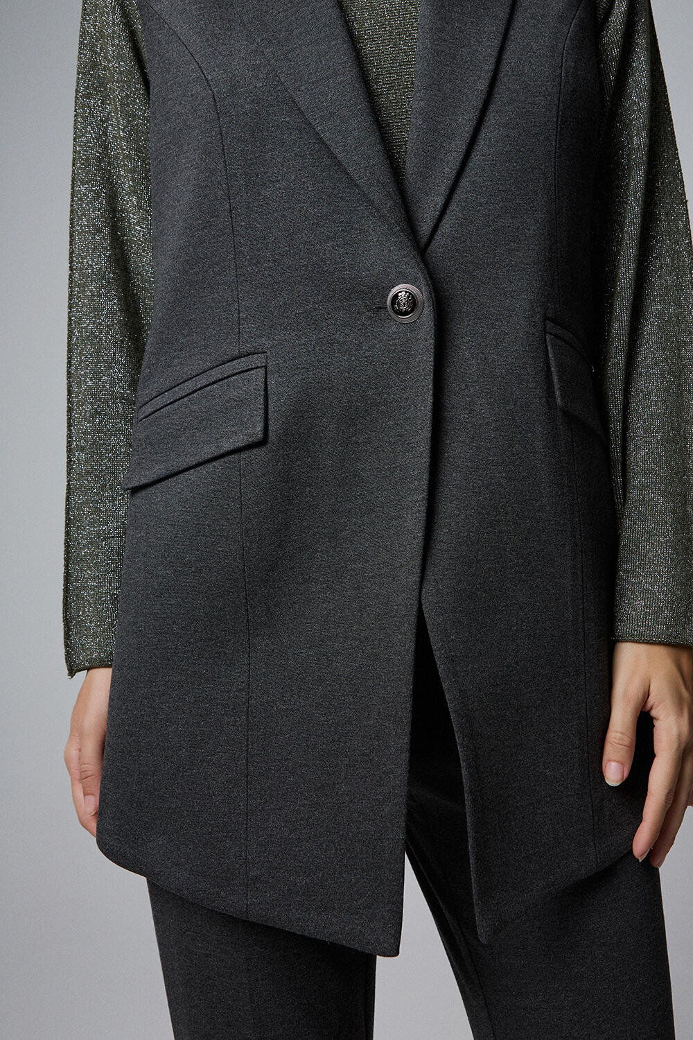 Γιλέκο μακρύ με πέτο γιακά και κόσμημα κουμπί για κλείσιμο μπροστά. Συνδυάστε το με το παντελόνι10-120664-0 ή τη φούστα 10-120667-0 για να εντυπωσιάσετε .