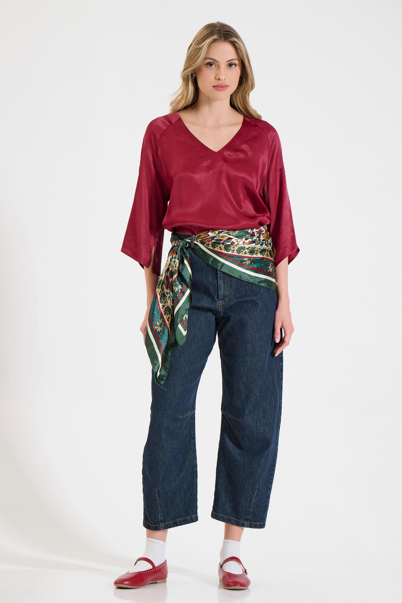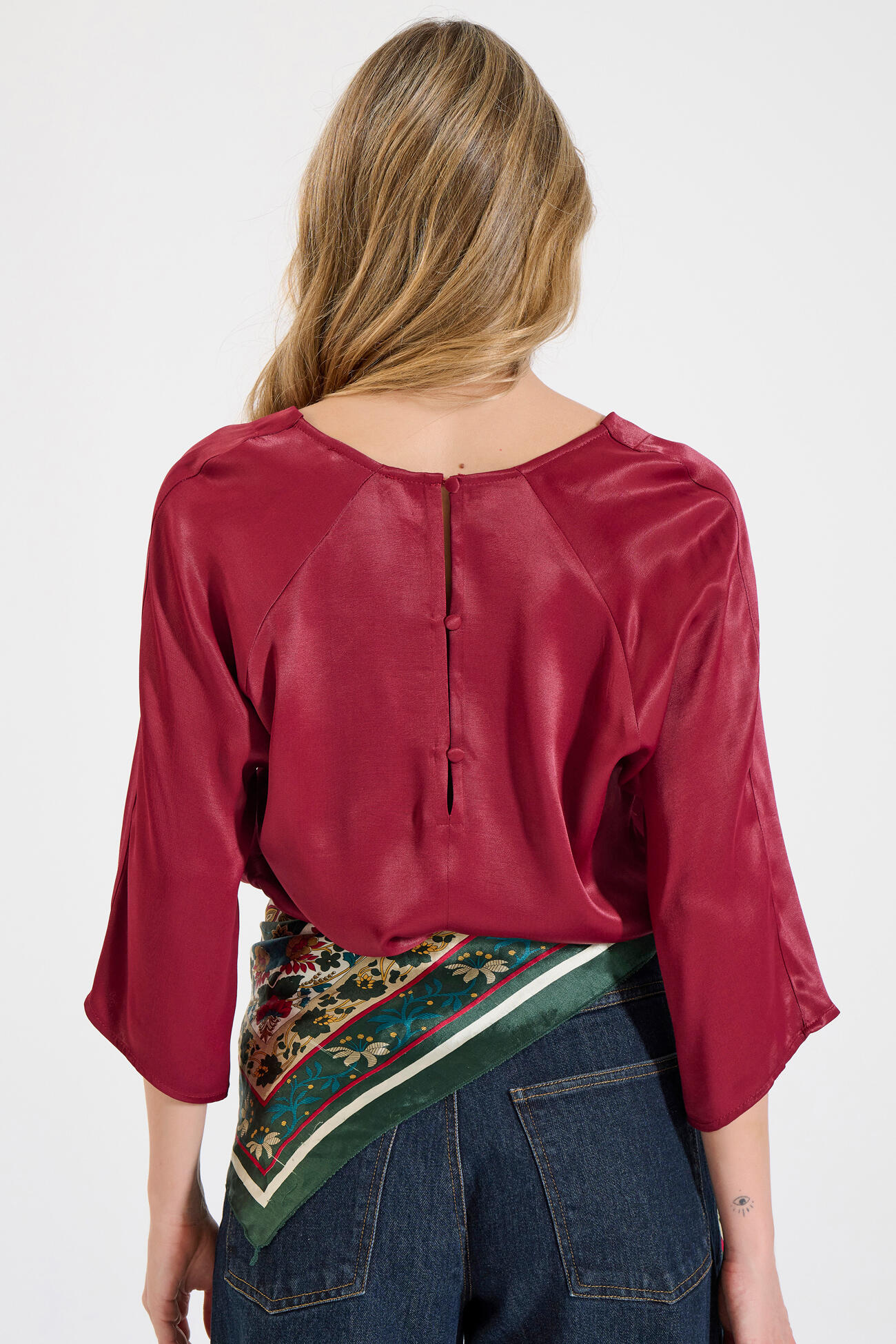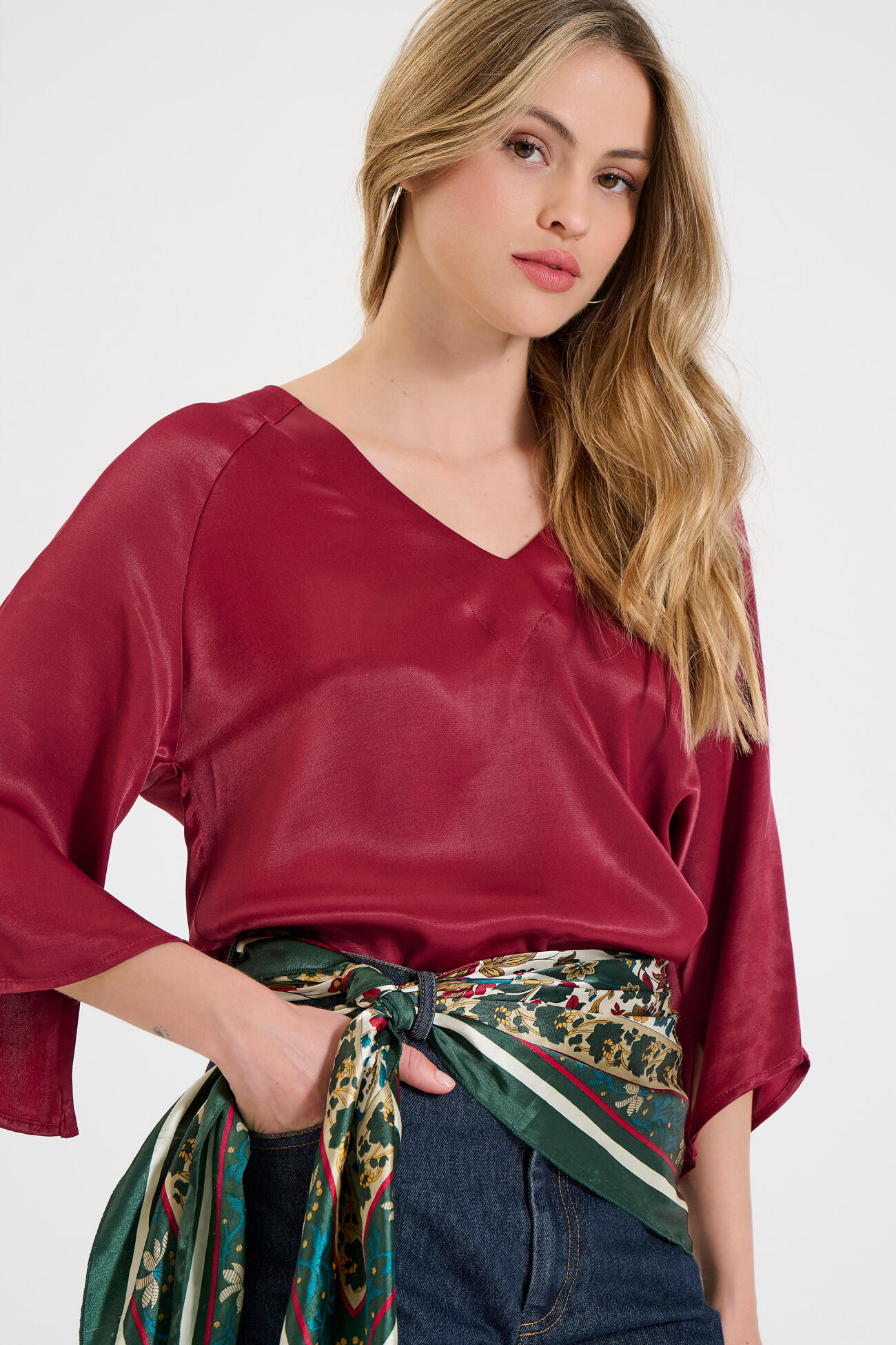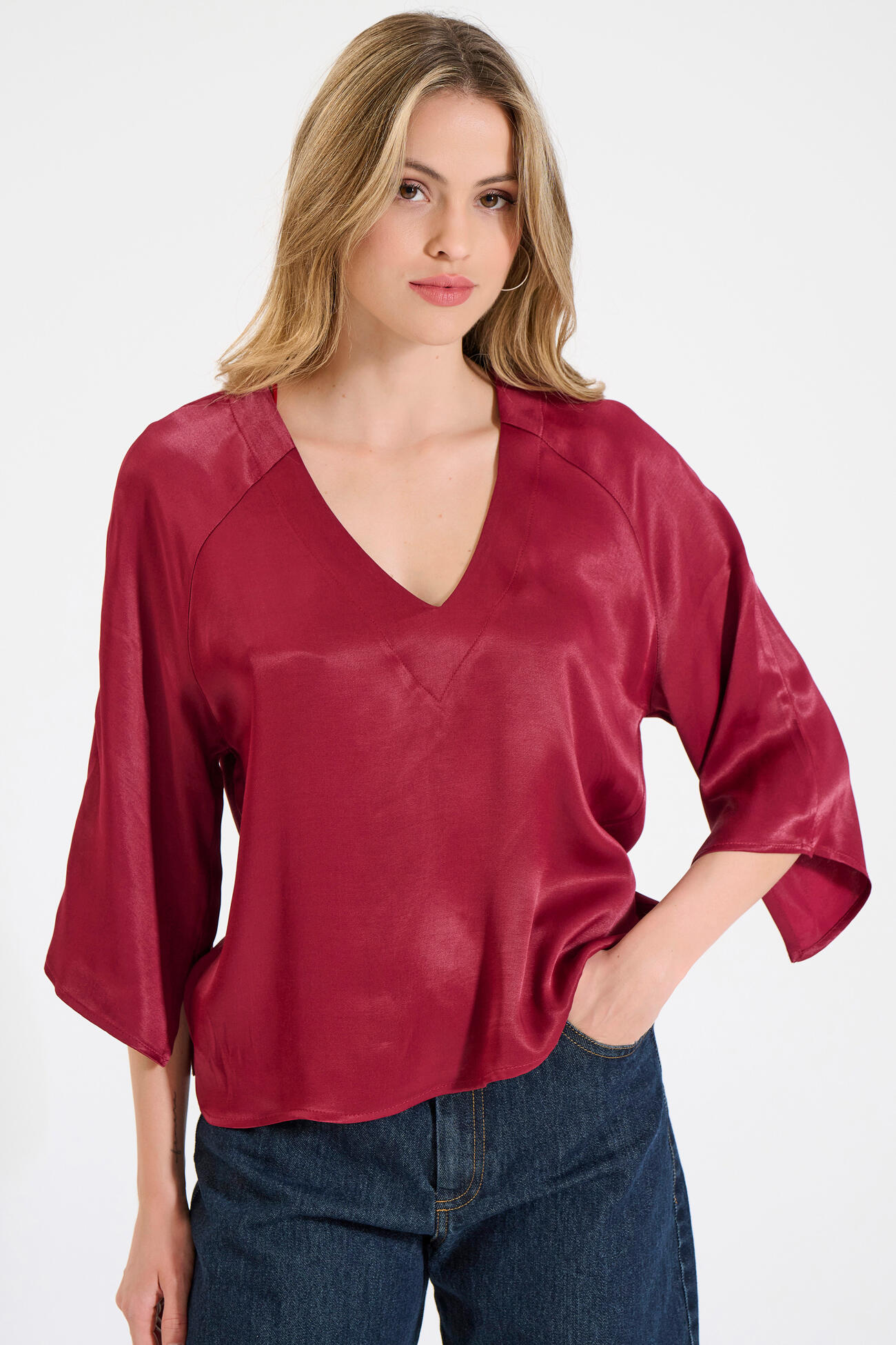 Μια διαχρονική και εκλεπτυσμένη μπλούζα που αποπνέει διακριτική πολυτέλεια. Το σατέν φινίρισμά της χαρίζει διακριτική λάμψη, ενώ η καθαρή γραμμή της και η V λαιμόκοψη αναδεικνύουν τη σιλουέτα. Διαθέτει φαρδιά μανίκια 3/4 και κομψή λεπτομέρεια με κουμπιά στην πλάτη.