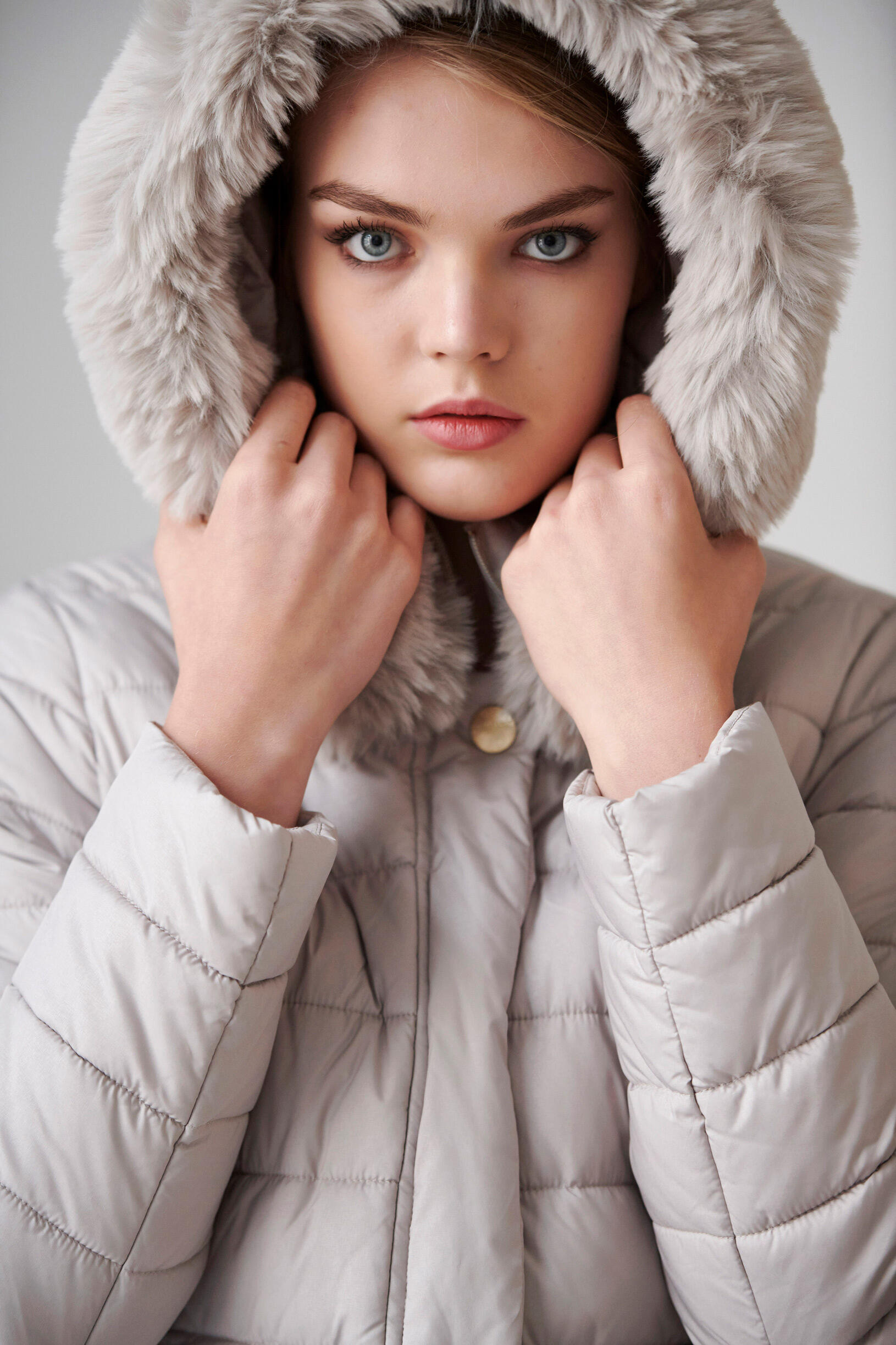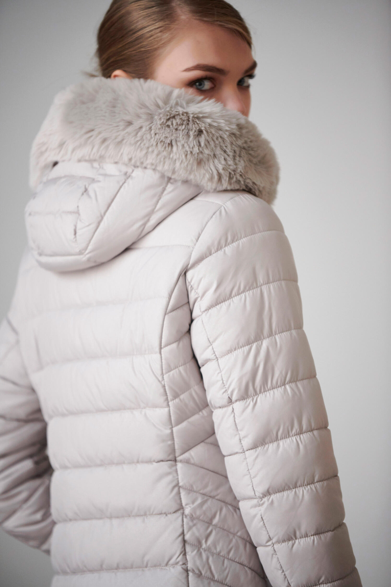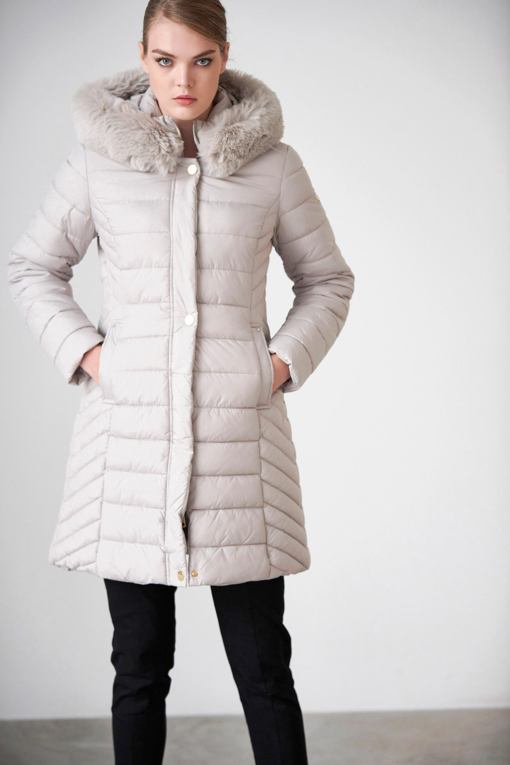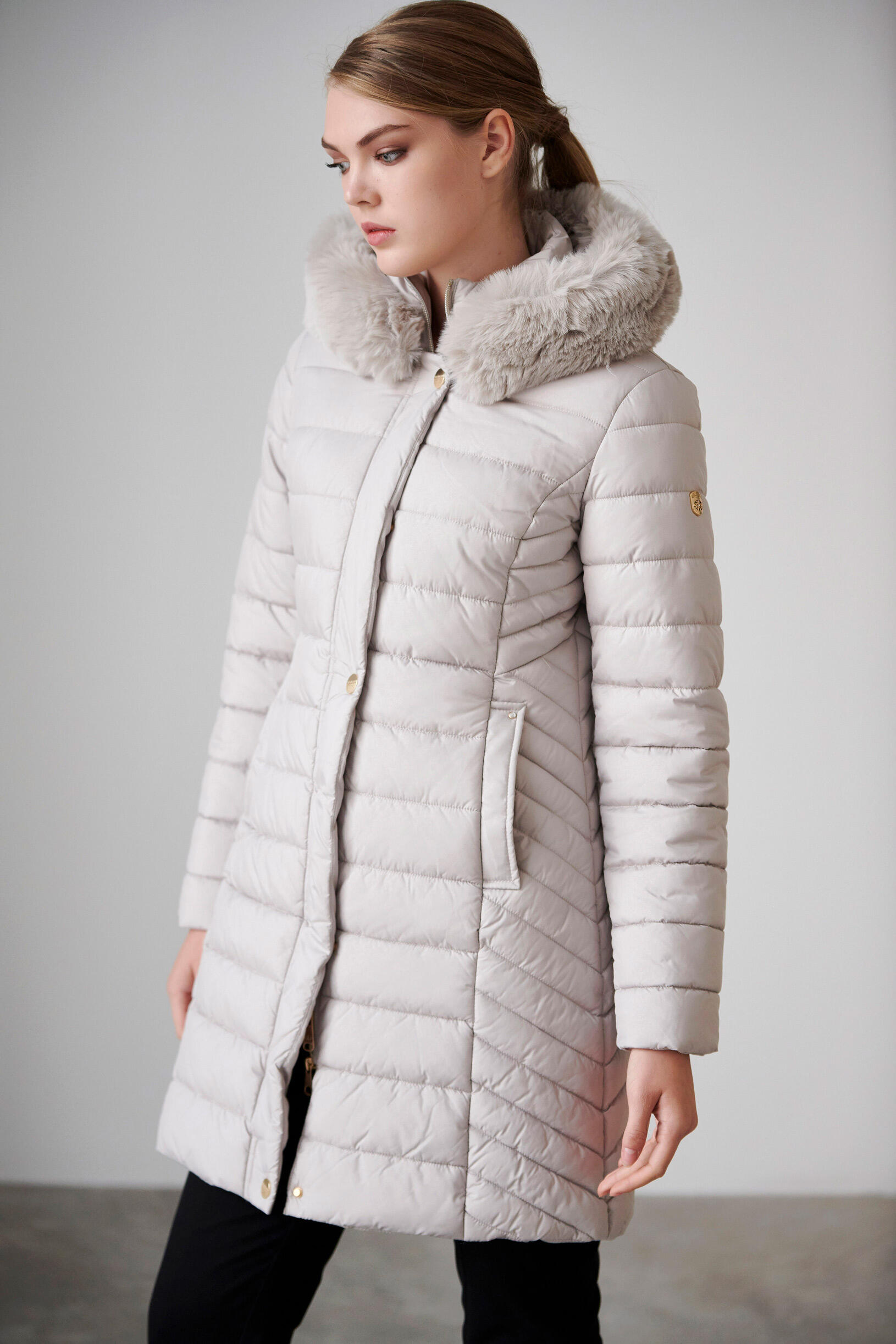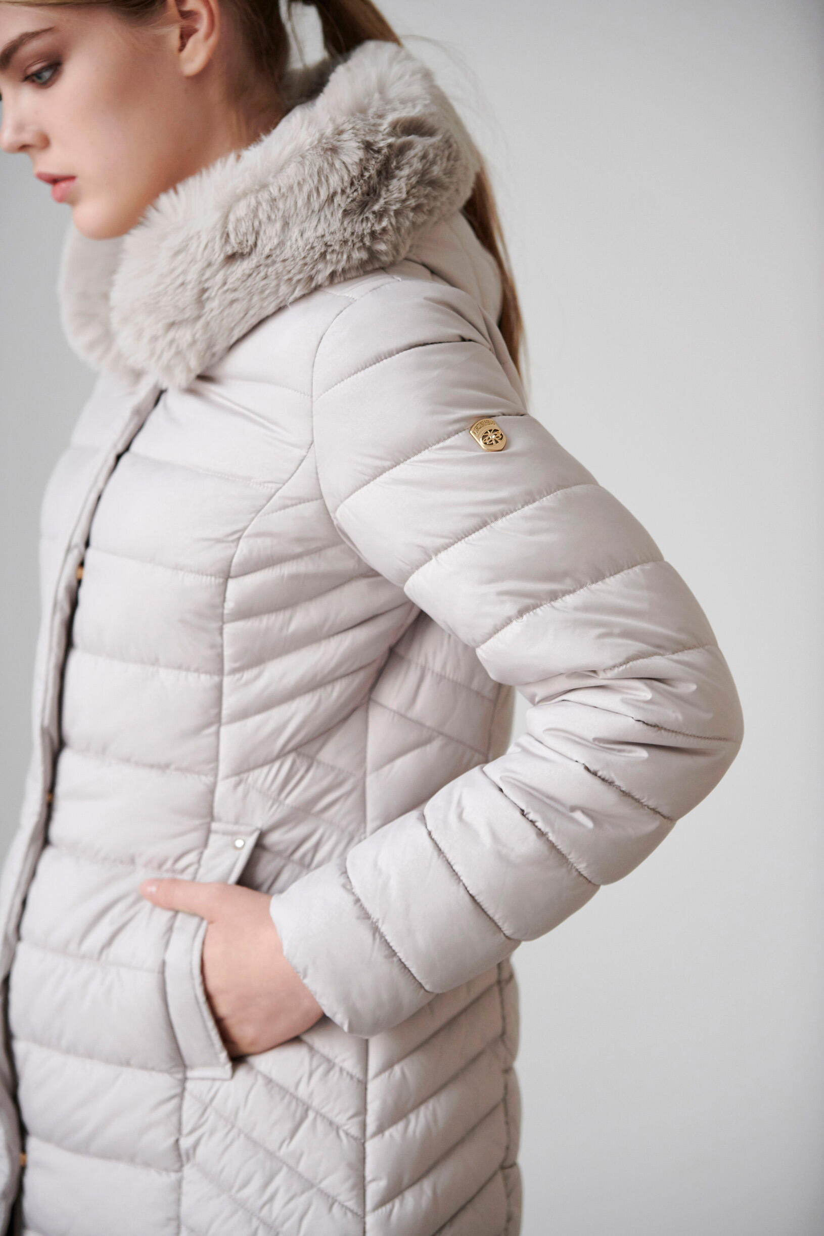 Μακρυμάνικο μπουφάν καπιτονέ.Διαθέτει μπροστινές πλαϊνές τσέπες και αποσπώμενη κουκούλα με συνθετική γούνα.Κλείσιμο με κουμπί και φερμουάρ.