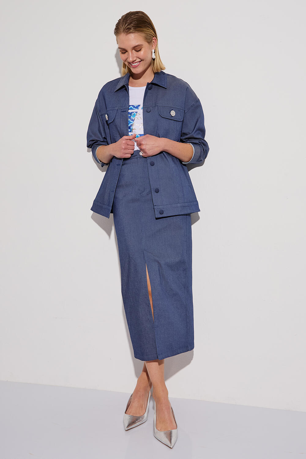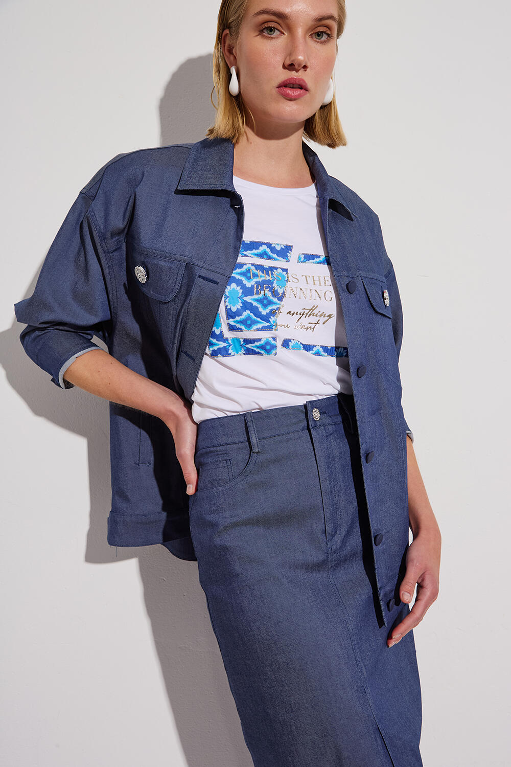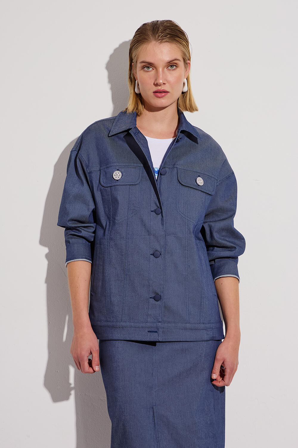Μπουφάν τζιν Κωδικός 10-060778-0 Περιγραφή Μπουφάν τζιν με κουμπιά κόσμημα στις τσέπες. Συνδυάστε το με τη 10-060777-0 φούστα για ένα ολοκληρωμένο denim look. Σύνθεση 67% cotton 29% polyester 4% spandex