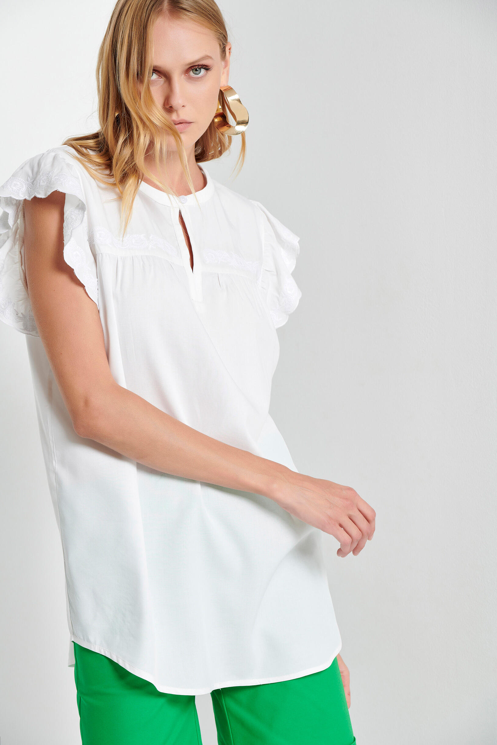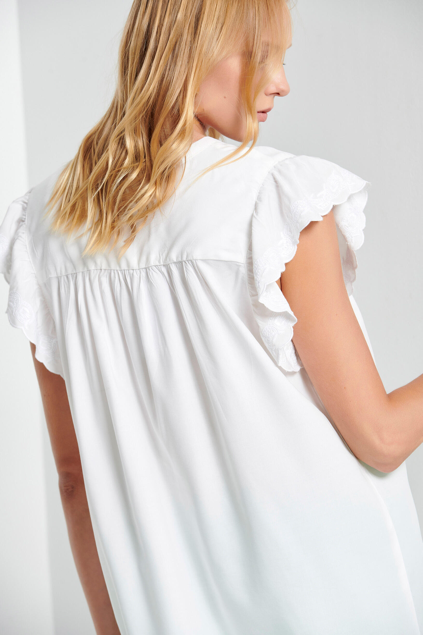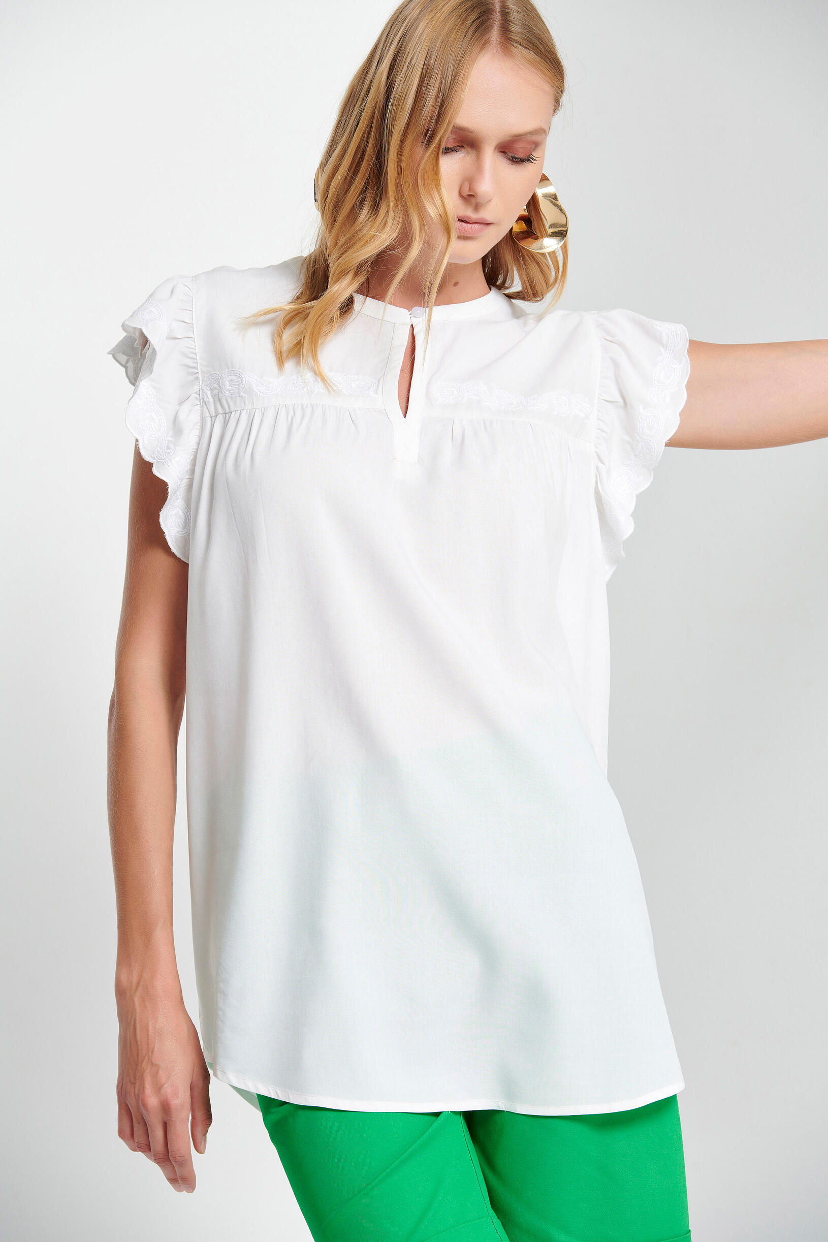 Κοντομάνικη μπλούζα με ανάγλυφα κεντήματα μπροστά και στα μανίκια. Διαθέτει στρογγυλή λαιμόκοψη και μικρό άνοιγμα μπροστα που κλείνει με κουμπί.