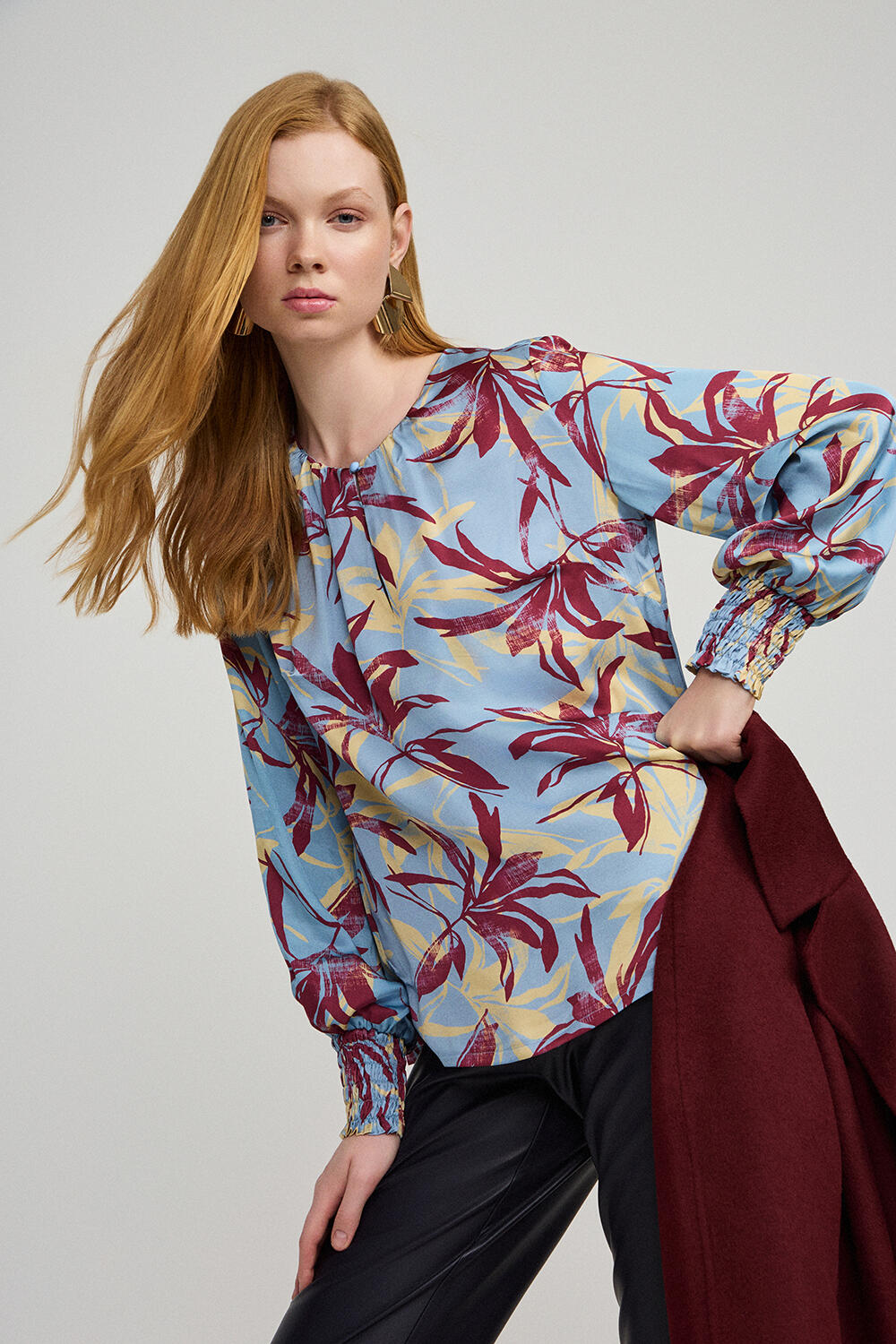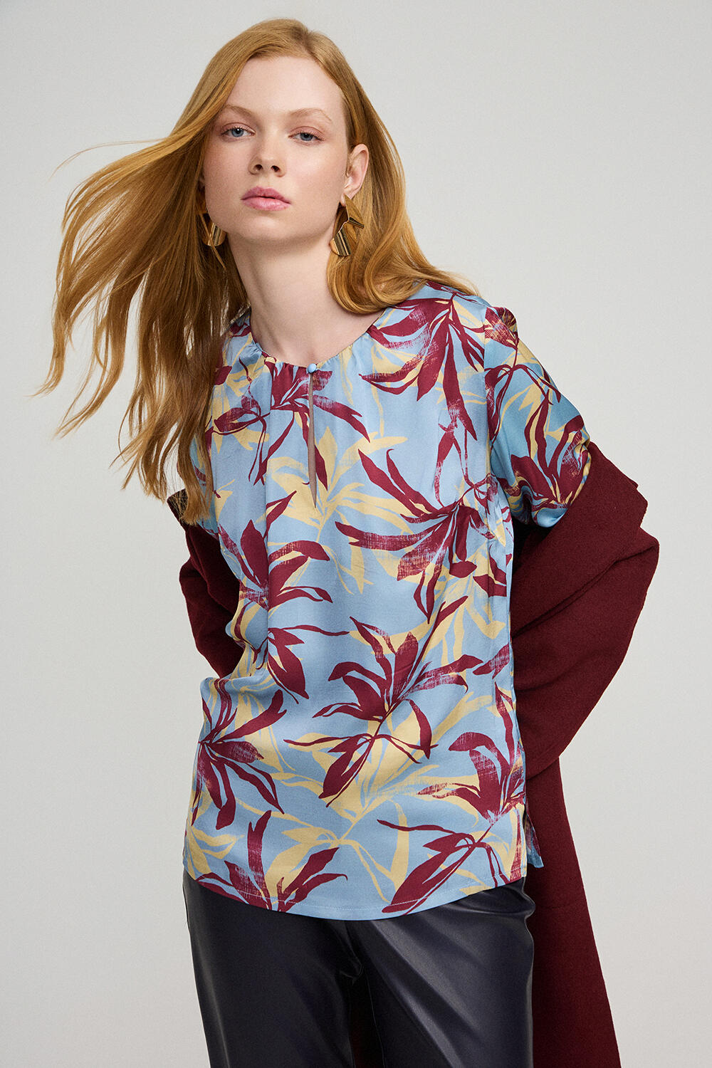 Μπλούζα με μοτίβο φύλλα Κωδικός 10-342264-0 Περιγραφή Μπλούζα εμπριμέ με στρογγυλή λαιμόκοψη και τελείωμα με λάστιχο στο μανίκι. Σύνθεση 51% viscose ecovero 49% rayon