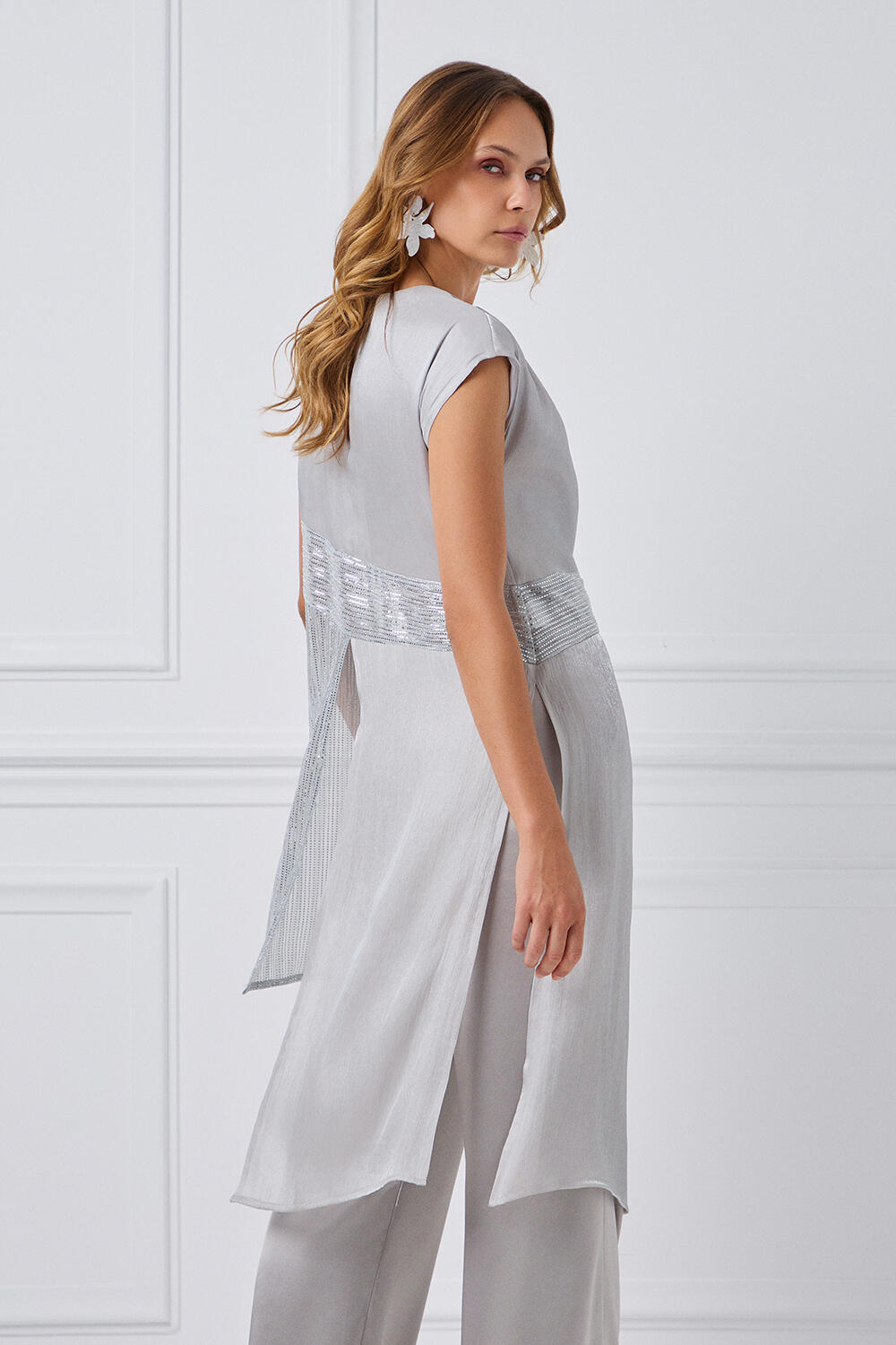 Τουνικ με συνδυασμό υφασμάτων και έντονες γυαλάδες. Άνισο το κάτω μέρος και V ντεκολτέ στη λαιμόκοψη. Συνδυάστε τη με τη 10-050448-0 παντελόνα για ένα εντυπωσιακό look.