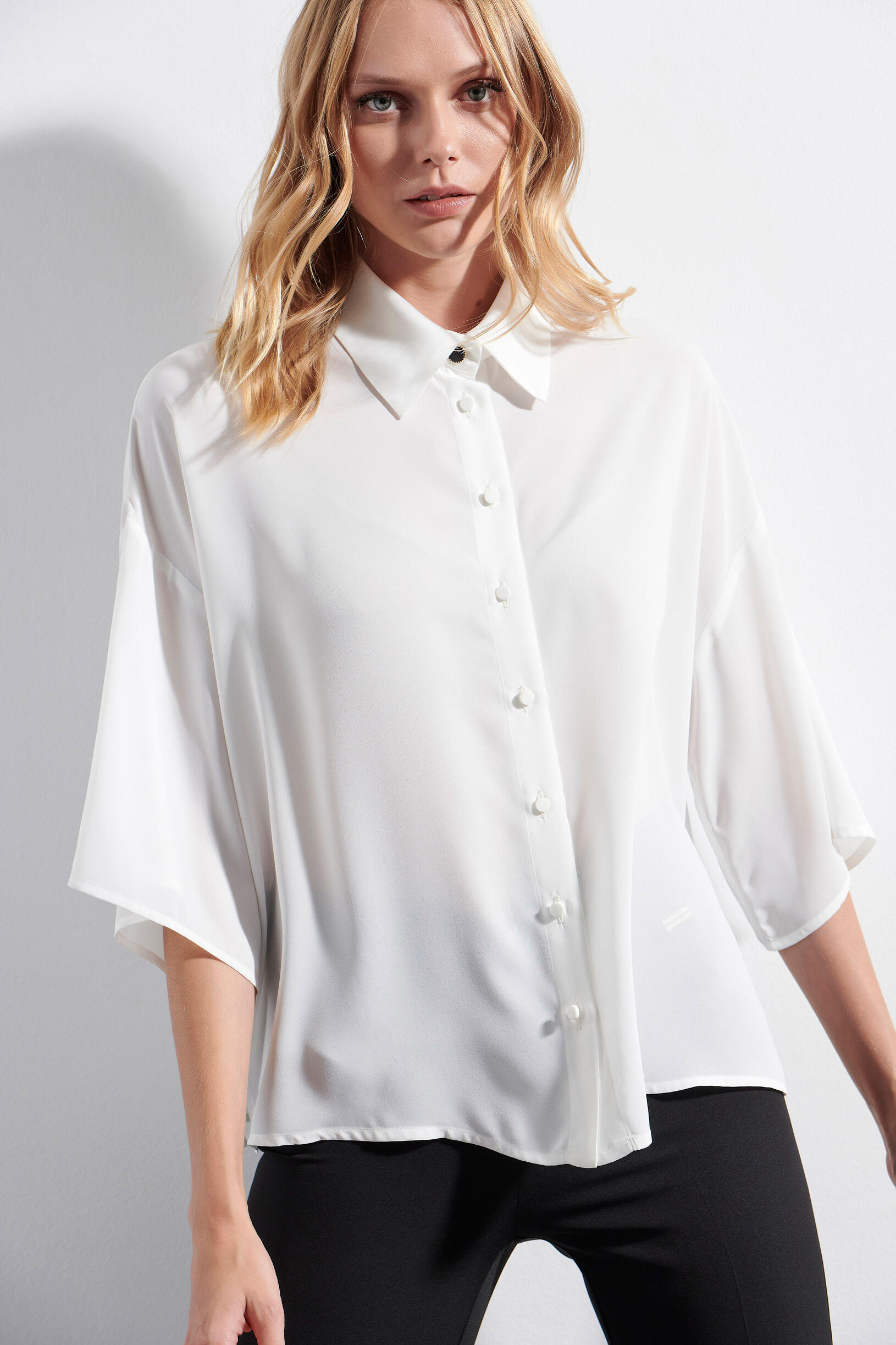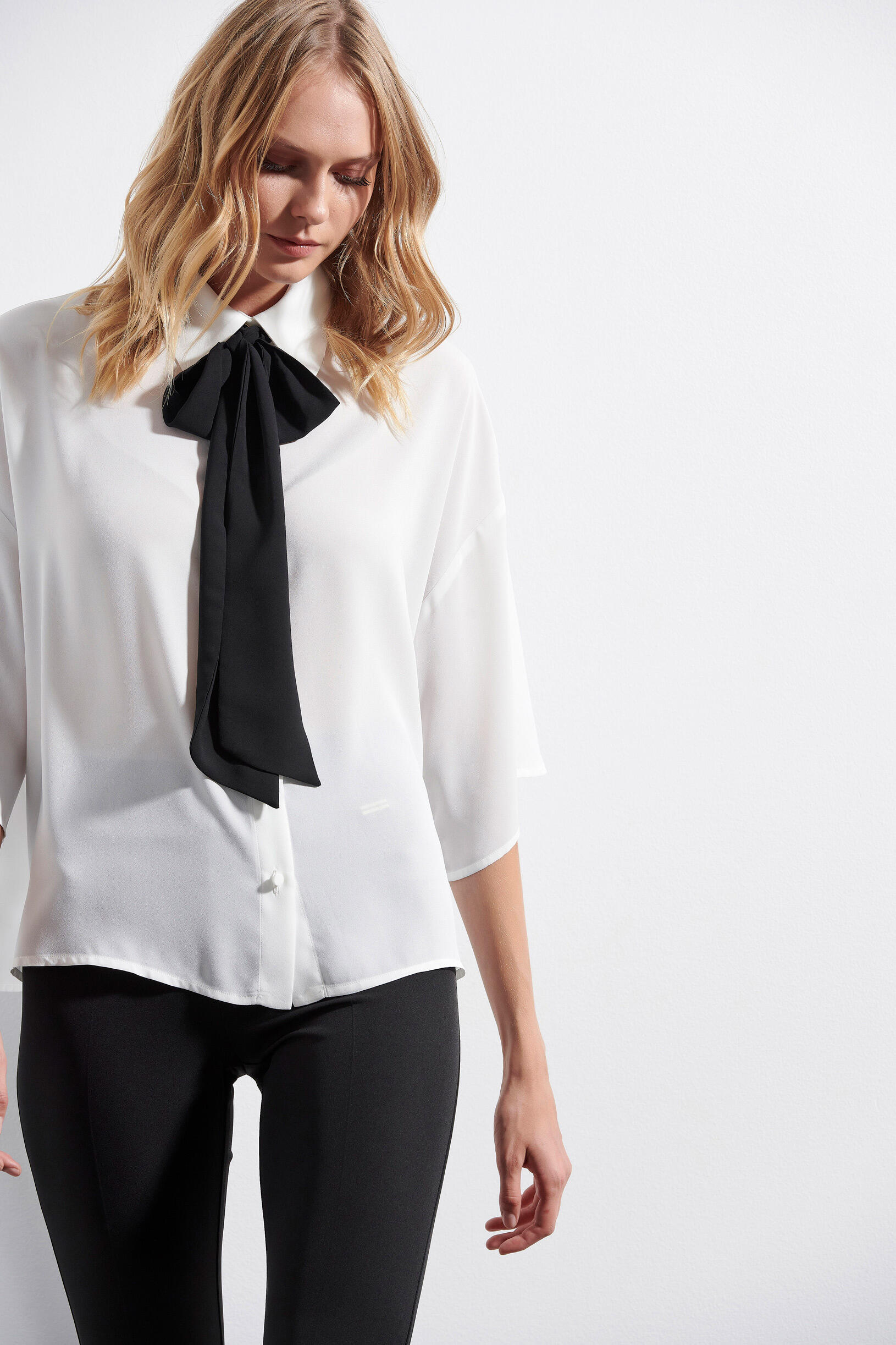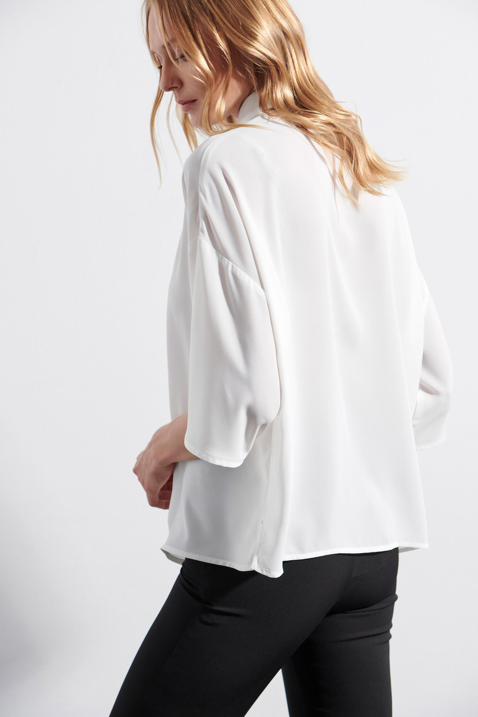 Πουκάμισο με γιακά που κλείνει με διακοσμητικό κουμπί. Μανίκια με τελείωμα σε βολάν. Έχει αποσπώμενο φουλάρι για να φορίεται με διαφορετικούς τρόπους για μία πιο elegant εμφάνιση.