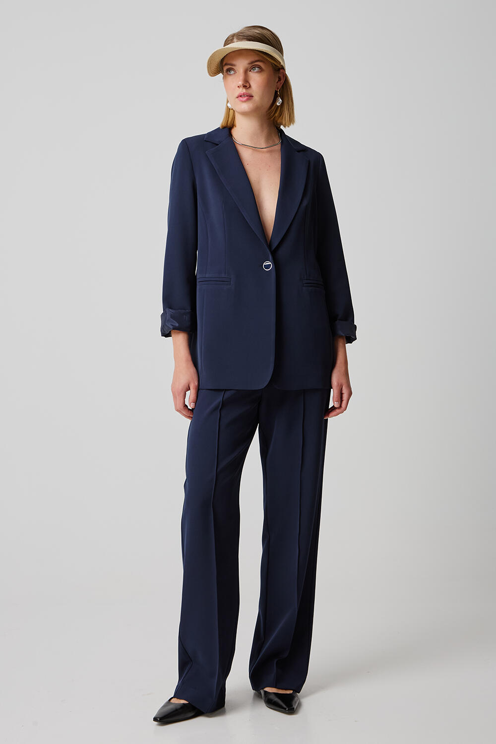 Μεσάτο μονόκουμπο σακάκι με πέτο γιακά και βάτες.Συδυάστε με το αντοίστιχο παντελόνι