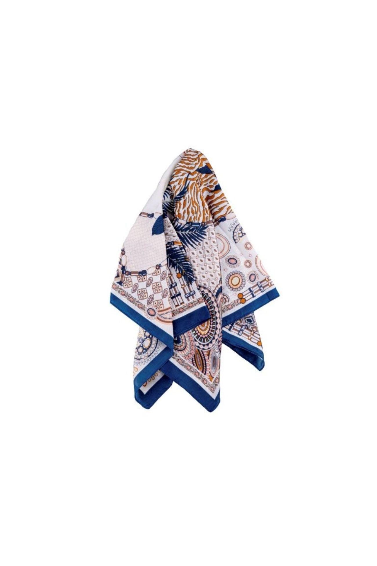 Φουλάρι με σύνθετο εμπριμέ σχέδιο και κομψούς χρωματικούς συνδυασμούς. Ιδανικό για να δώσει μια διακριτική αλλά ξεχωριστή πινελιά σε κάθε σύνολο.