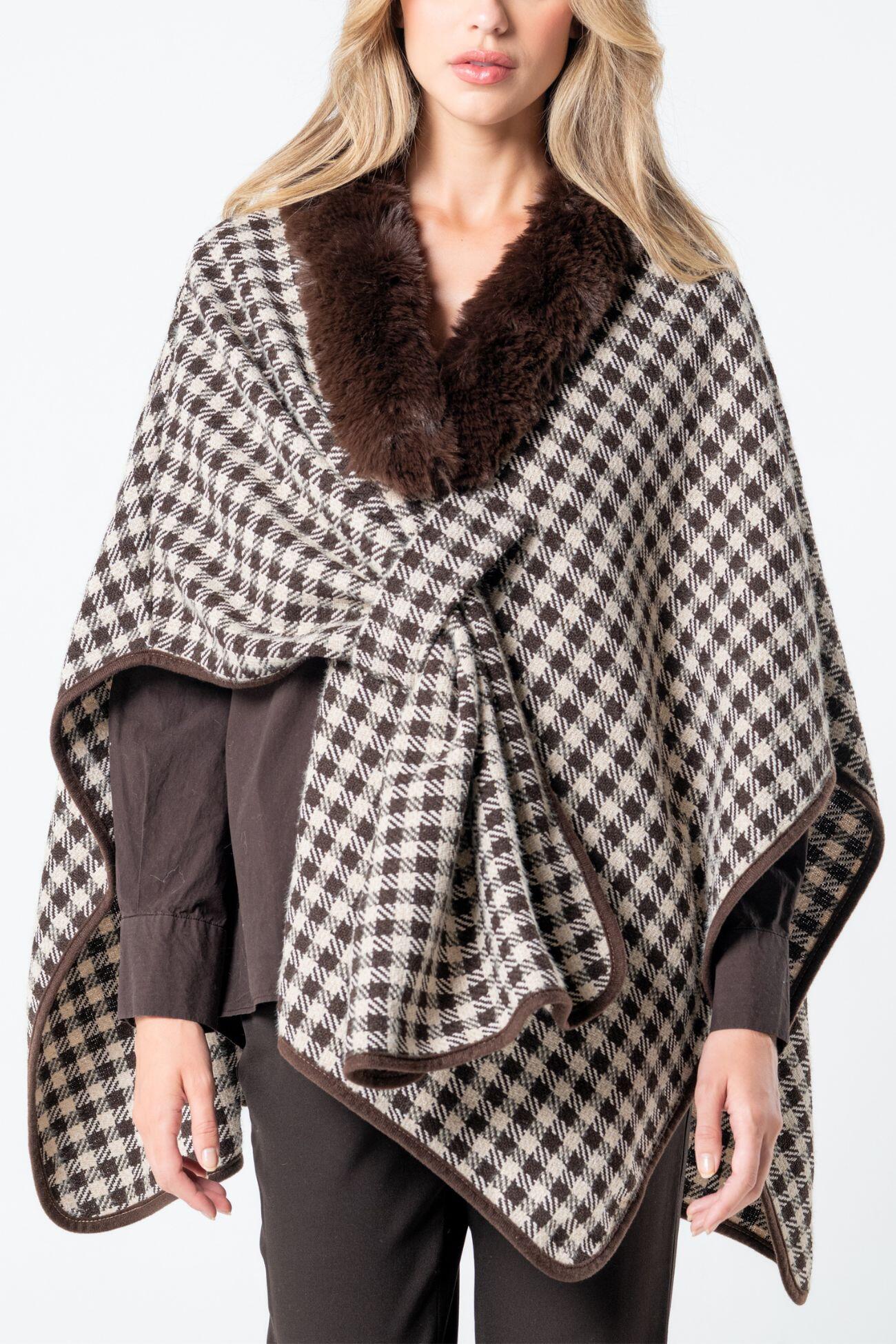 Κομψή κάπα με καρό μοτίβο και γιακά από συνθετική γούνα. Ζεστή και άνετη, προσθέτει στυλ σε κάθε εμφάνιση και αποτελεί ιδανική επιλογή για τις κρύες μέρες.
