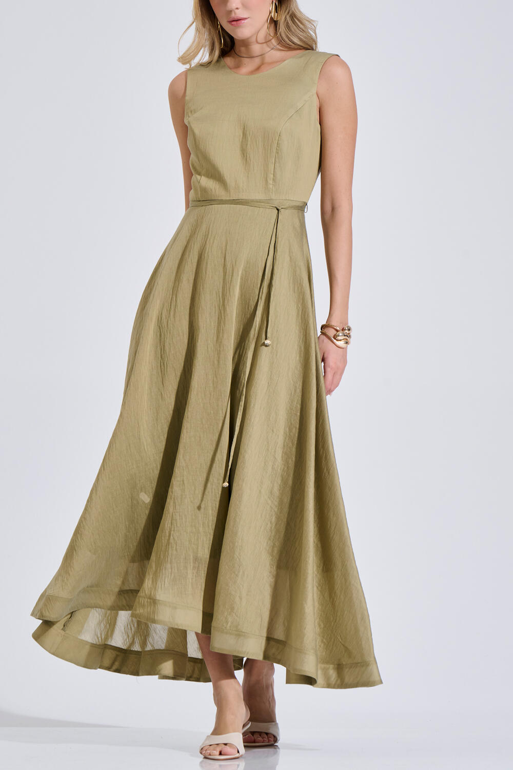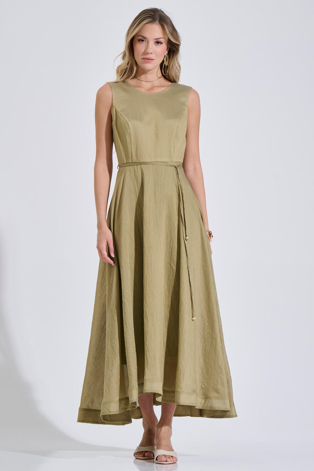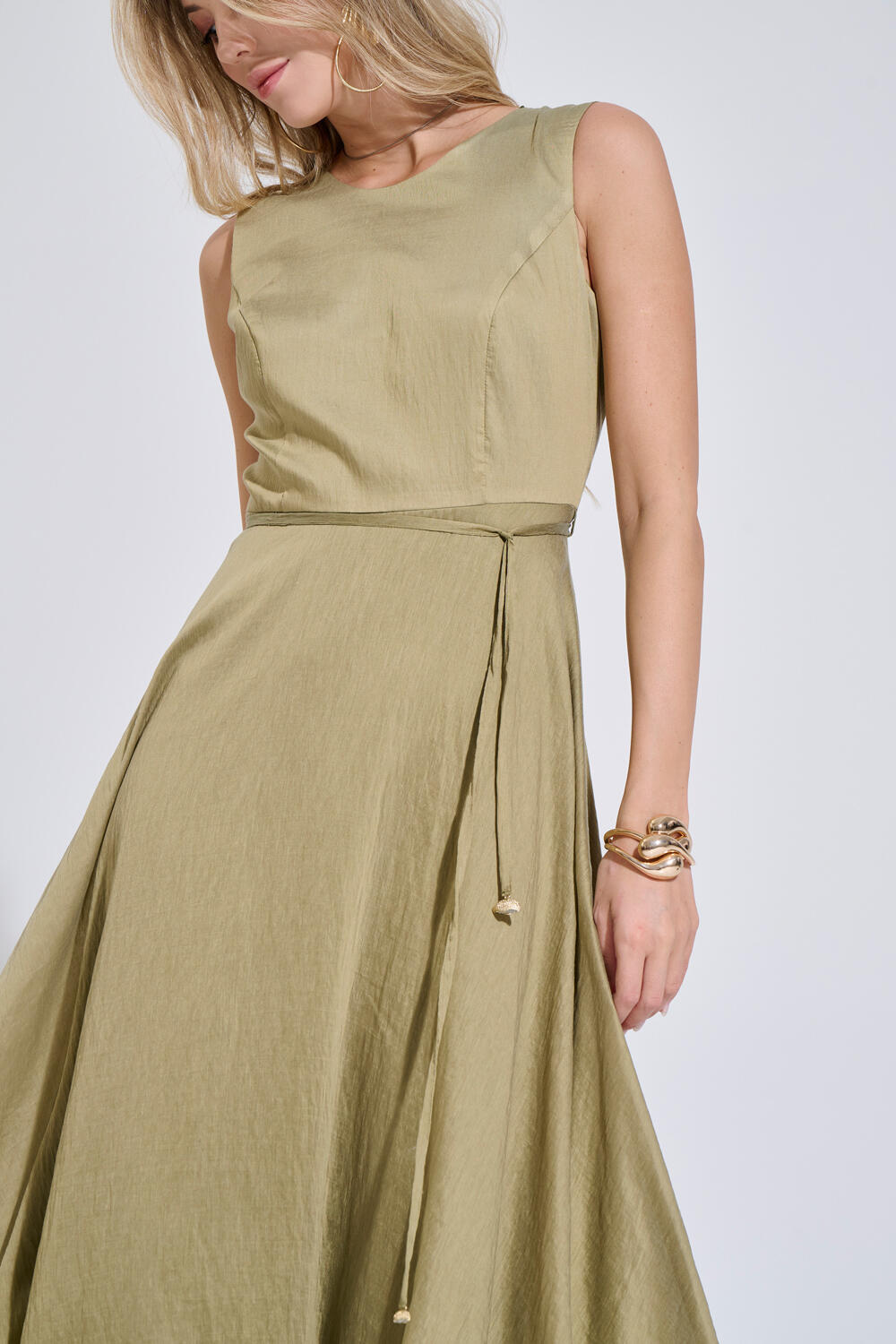 Αέρινο αμάνικο μίντι φόρεμα από lyocell και λινό με στρογγυλή λαιμόκοψη και κομψή γραμμή. Η εφαρμογή ανοίγει απαλά προς τα κάτω, χαρίζοντας φυσική κίνηση, ενώ το λεπτό ζωνάκι στη μέση προσαρμόζεται και τονίζει τη σιλουέτα. Στο πίσω μέρος διαθέτει V άνοιγμα και κλείσιμο με φερμουάρ.