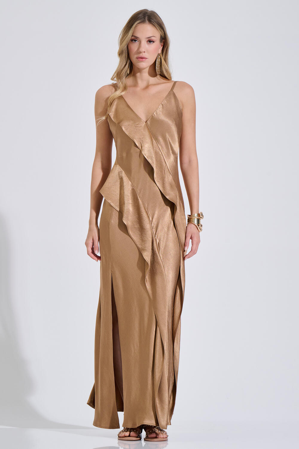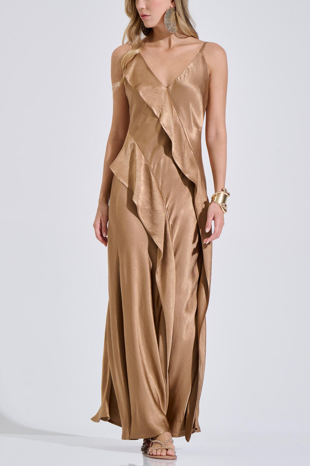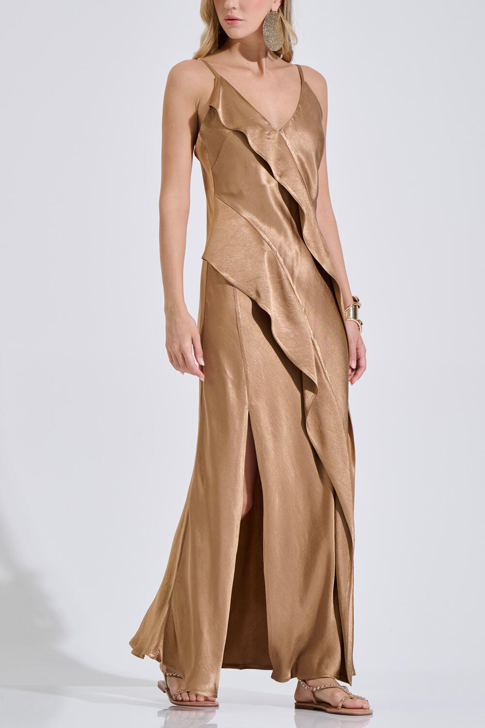 Μάξι σατέν φόρεμα σε κομψή γραμμή με λεπτές τιράντες και V λαιμόκοψη. Ξεχωρίζει για τα εντυπωσιακά βολάν στο μπροστινό μέρος που δημιουργούν κίνηση. Διαθέτει ανοιχτή πλάτη, ενώ το σκίσιμο μπροστά χαρίζει άνεση και κομψότητα σε κάθε βήμα. Ιδανικό για βραδινές και ιδιαίτερες εμφανίσεις.