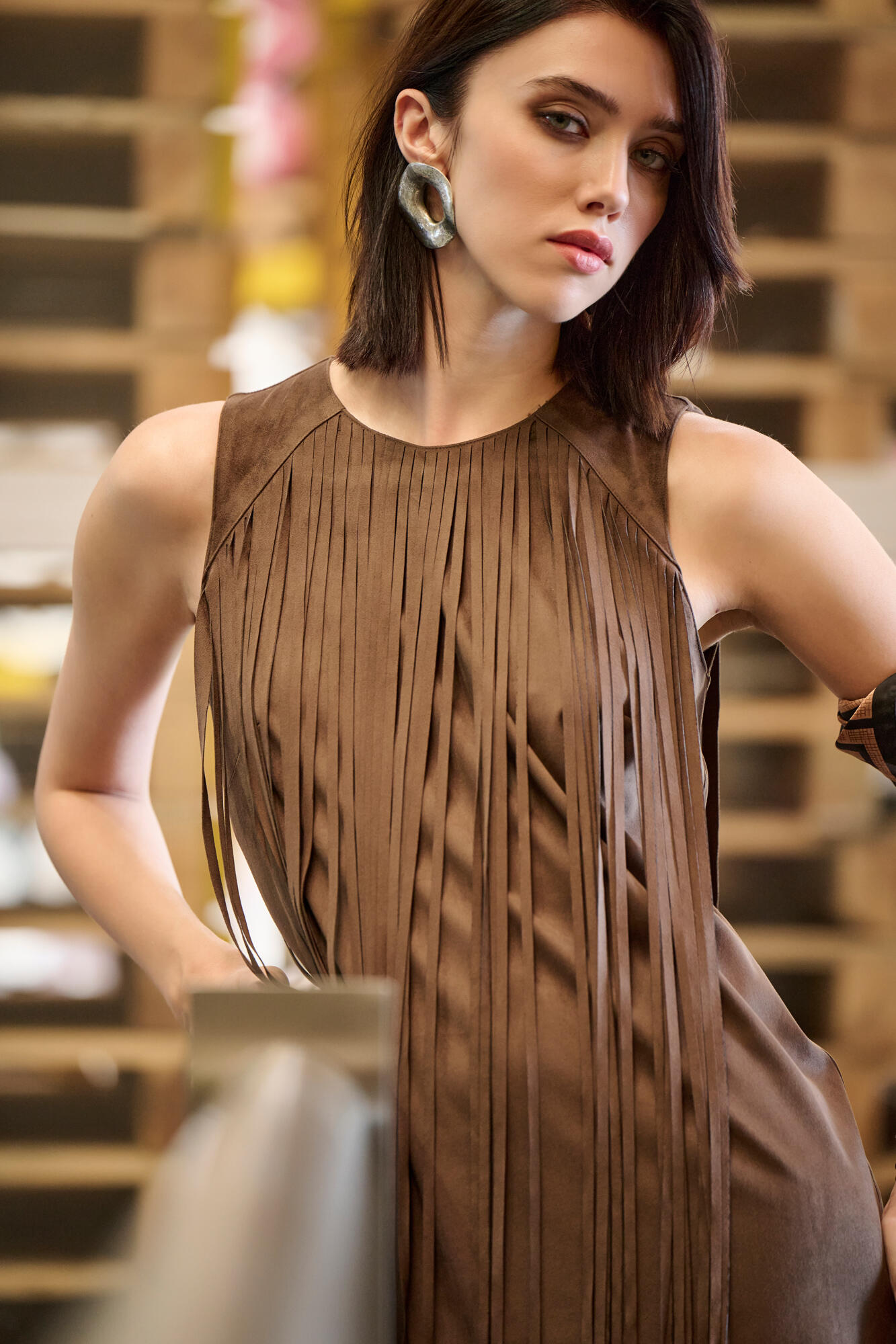 Κομψό mini φόρεμα με υφή σουέτ, με εντυπωσιακά κάθετα κρόσια που χαρίζουν κίνηση και δυναμισμό. Η sleeveless γραμμή του αναδεικνύει τη σιλουέτα, ενώ η υφή του προσδίδει boho-chic χαρακτήρα. Ιδανικό για statement εμφανίσεις από το πρωί έως το βράδυ.