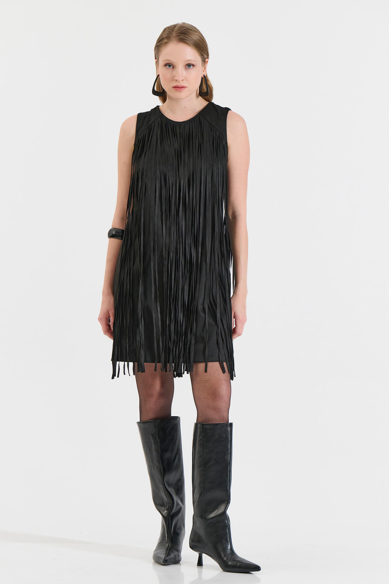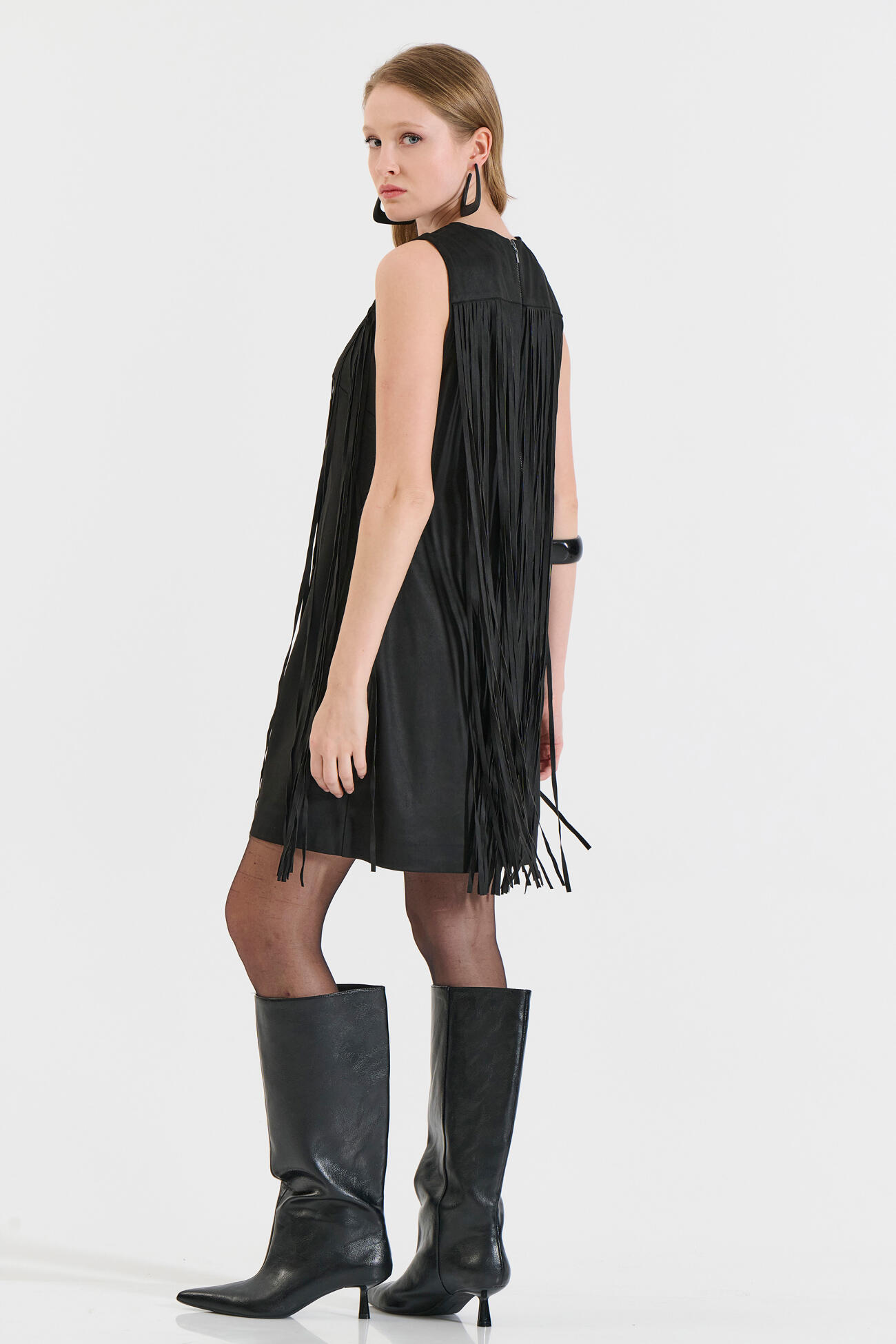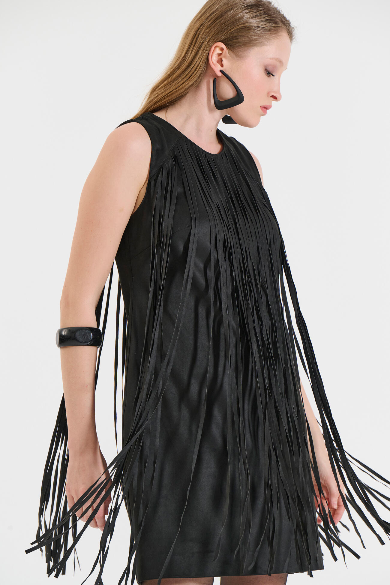 Κομψό mini φόρεμα με υφή σουέτ, με εντυπωσιακά κάθετα κρόσια που χαρίζουν κίνηση και δυναμισμό. Η sleeveless γραμμή του αναδεικνύει τη σιλουέτα, ενώ η υφή του προσδίδει boho-chic χαρακτήρα. Ιδανικό για statement εμφανίσεις από το πρωί έως το βράδυ.