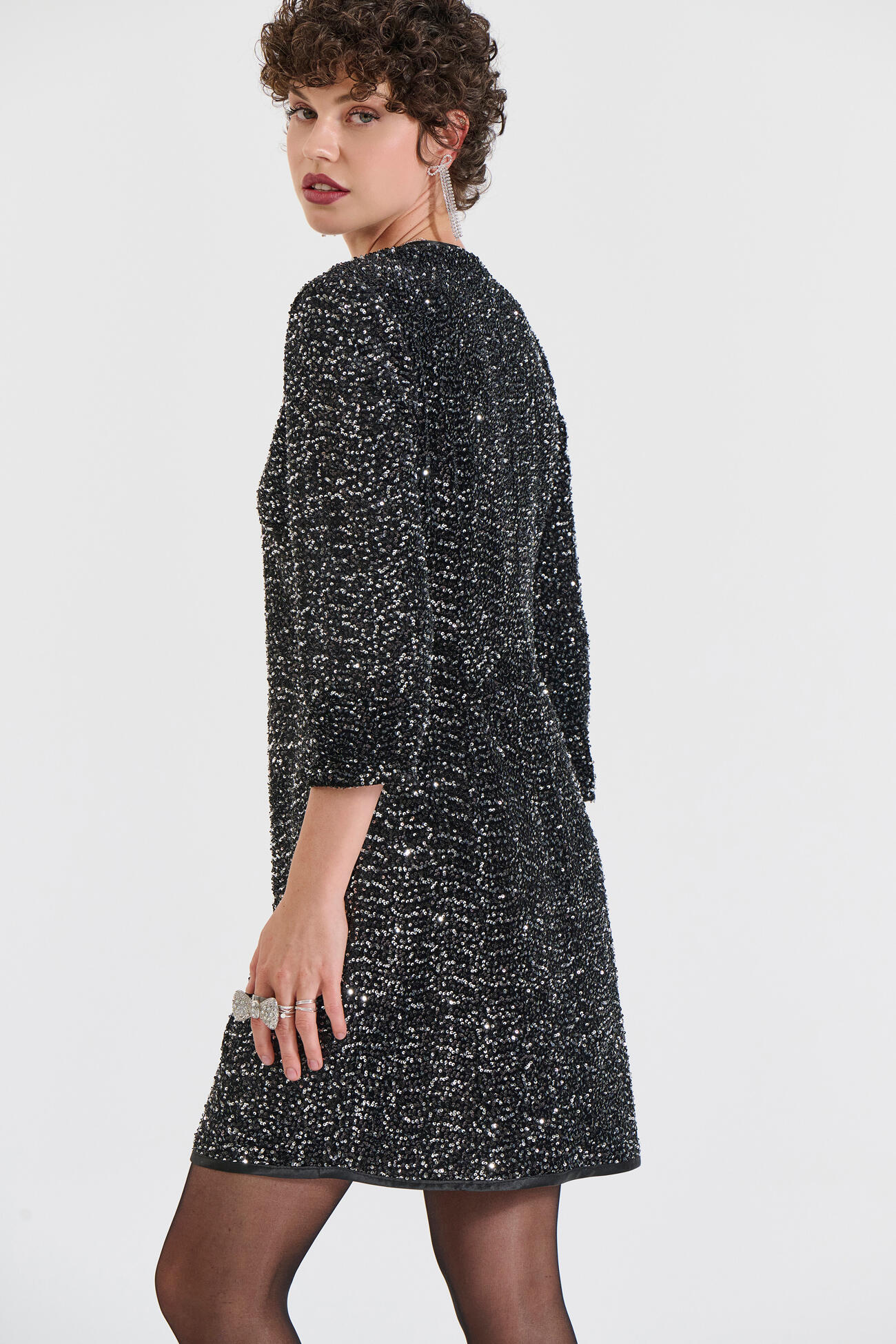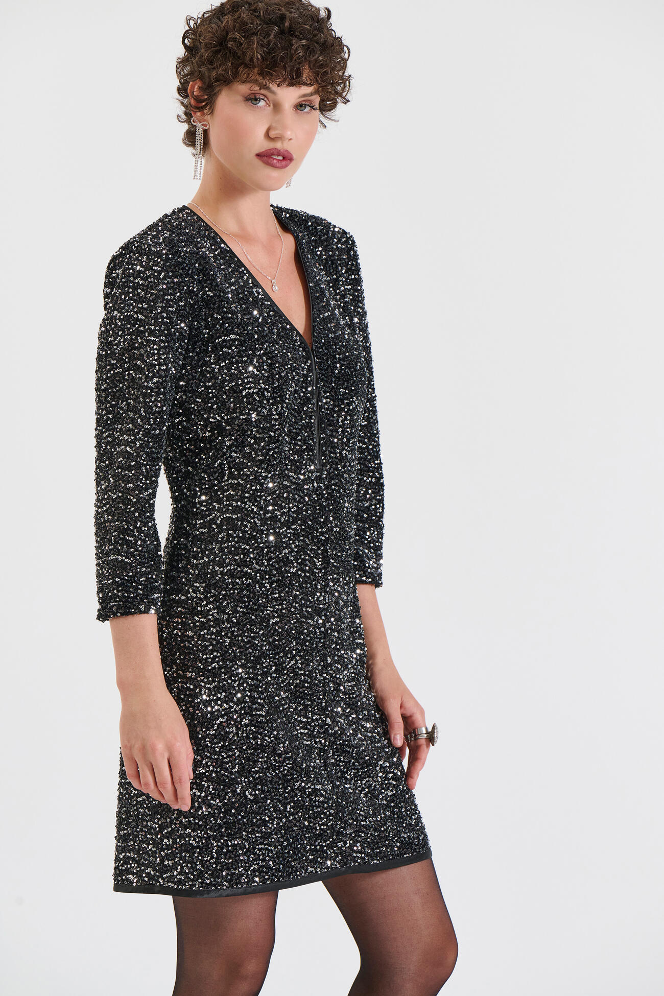 Εντυπωσιακό φόρεμα με παγιέτες που δημιουργούν εκθαμβωτική λάμψη σε κάθε κίνηση. Διαθέτει V ντεκολτέ με διακοσμητικό φερμουάρ που προσθέτει σύγχρονη, statement πινελιά. Η ίσια γραμμή και τα 3/4 μανίκια προσφέρουν άνεση και κομψότητα.