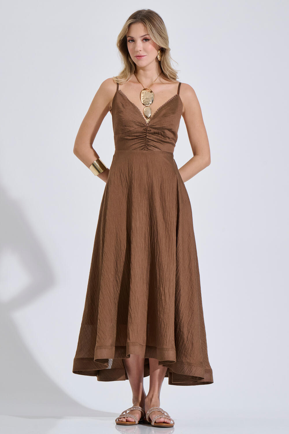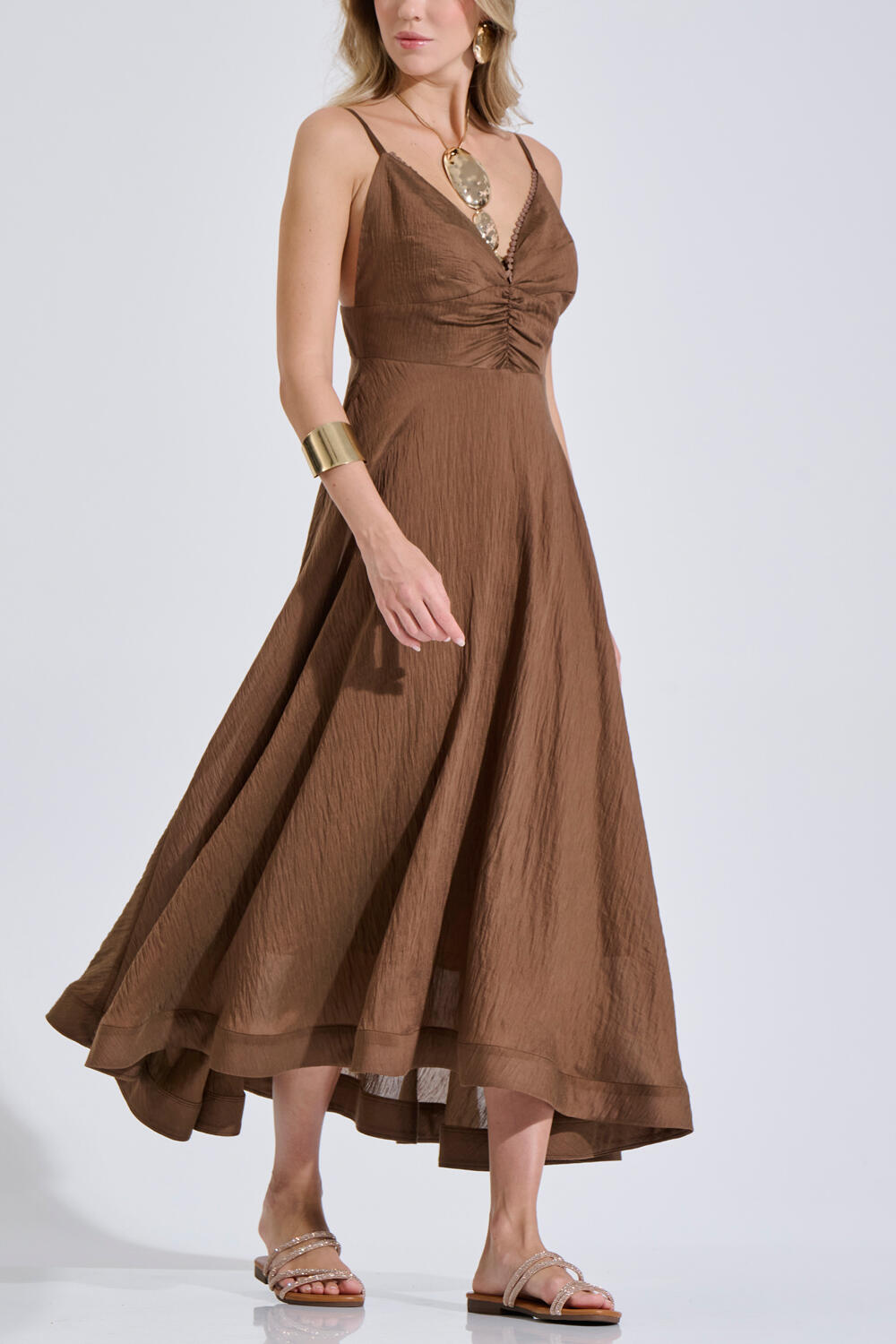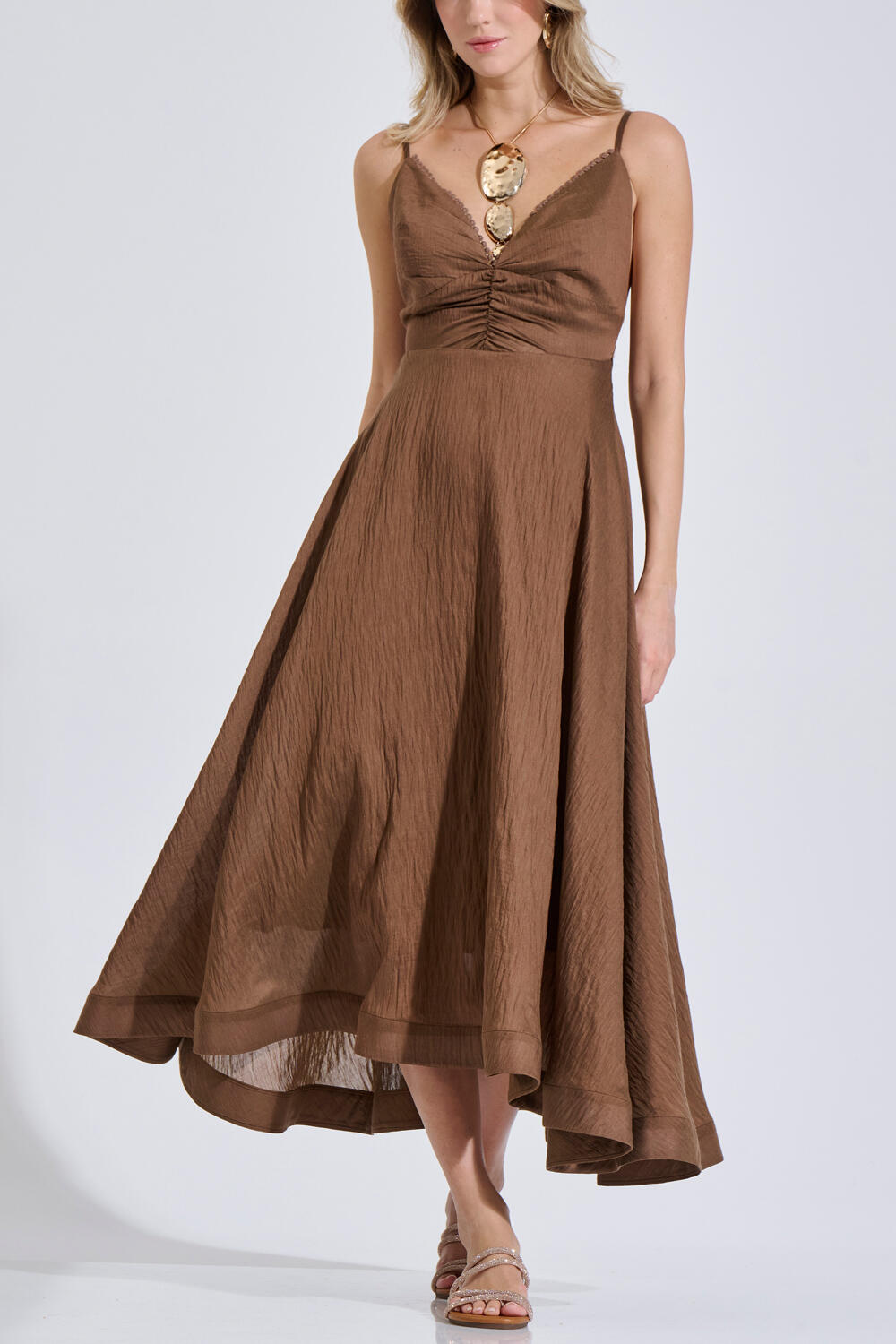 Αέρινο Μίντι φόρεμα με λεπτές τιράντες και V λαιμόκοψη. Το μπούστο διαθέτει σούρες ενώ το τελείωμα της λαιμόκοψης διακοσμείται με μικρό ρέλι. Η γραμμή ανοίγει απαλά προς τα κάτω, χαρίζοντας κίνηση και κομψότητα σε κάθε βήμα. Διαθέτει πλαϊνές τσέπες για πρακτικότητα, ενώ στο πίσω μέρος η σφηκοφωλιά εξασφαλίζει άνετη εφαρμογή.Φοριέται μόνο του ή σε σετ με την εσάρπα 10-150325-0 και το μπολερό 10-150326-0 για ένα ολοκληρωμένο σύνολο.