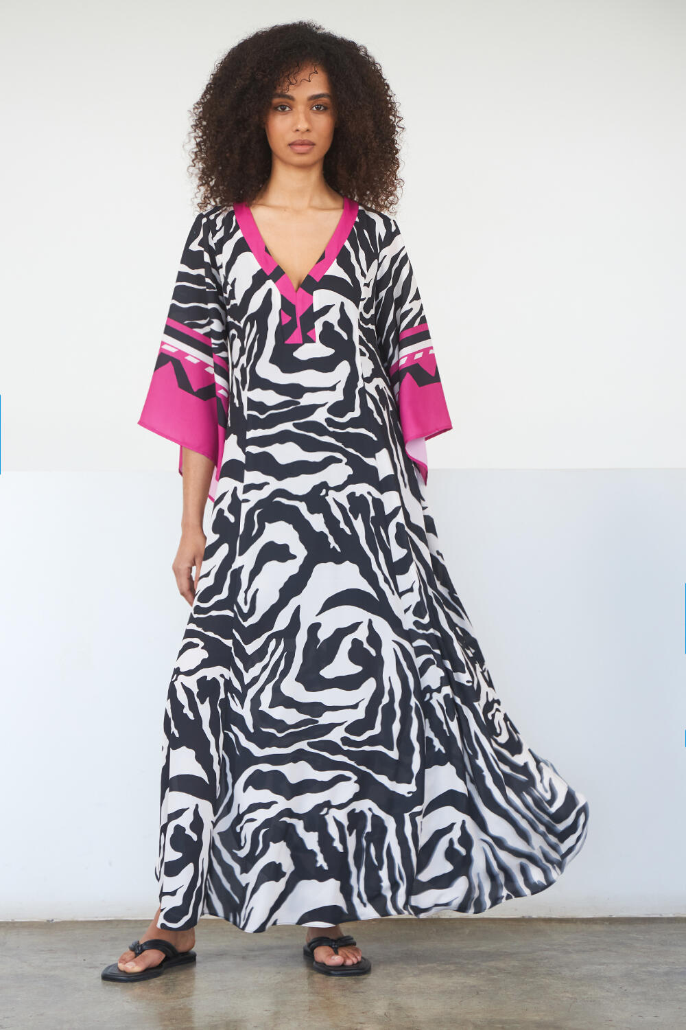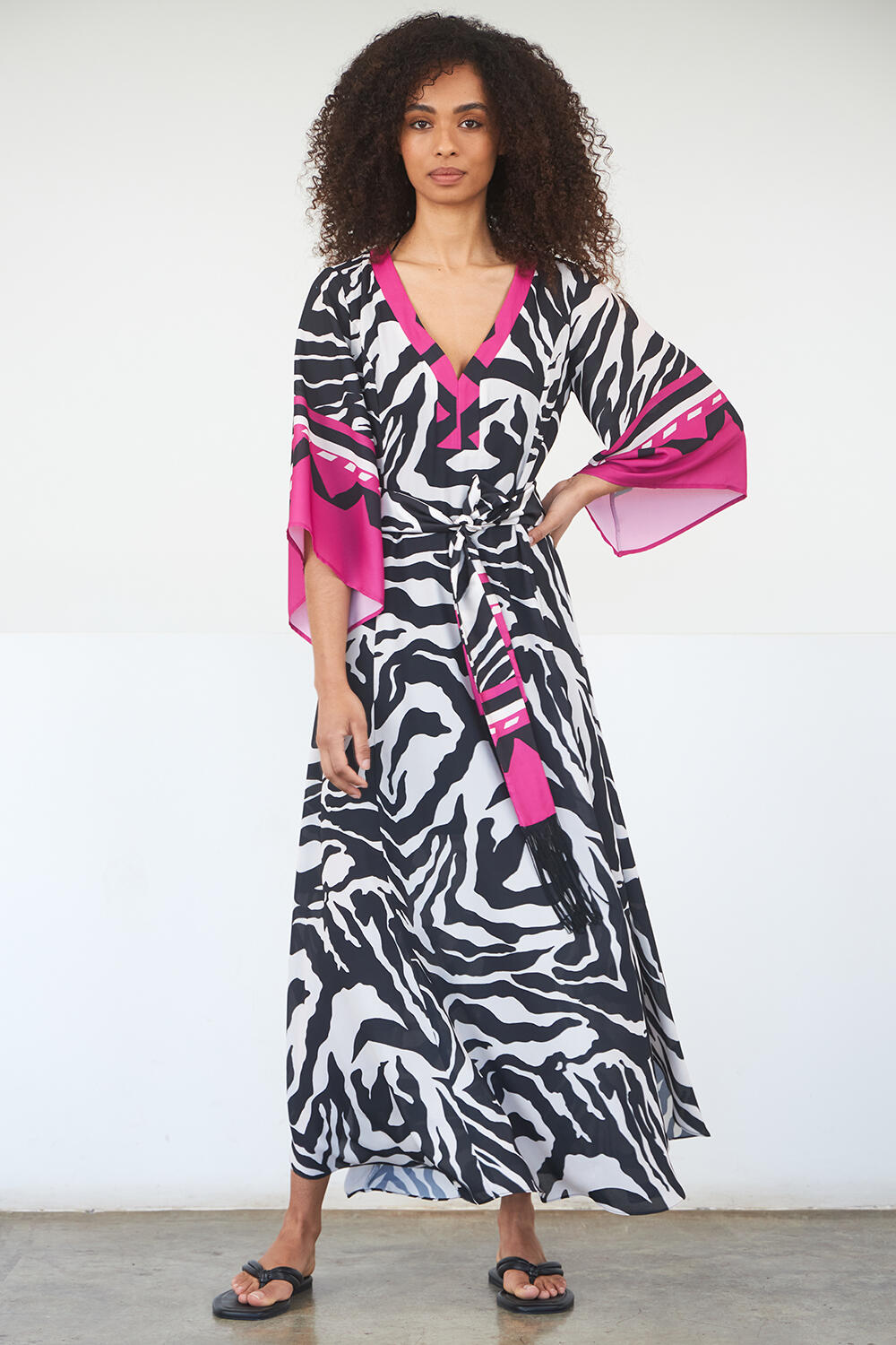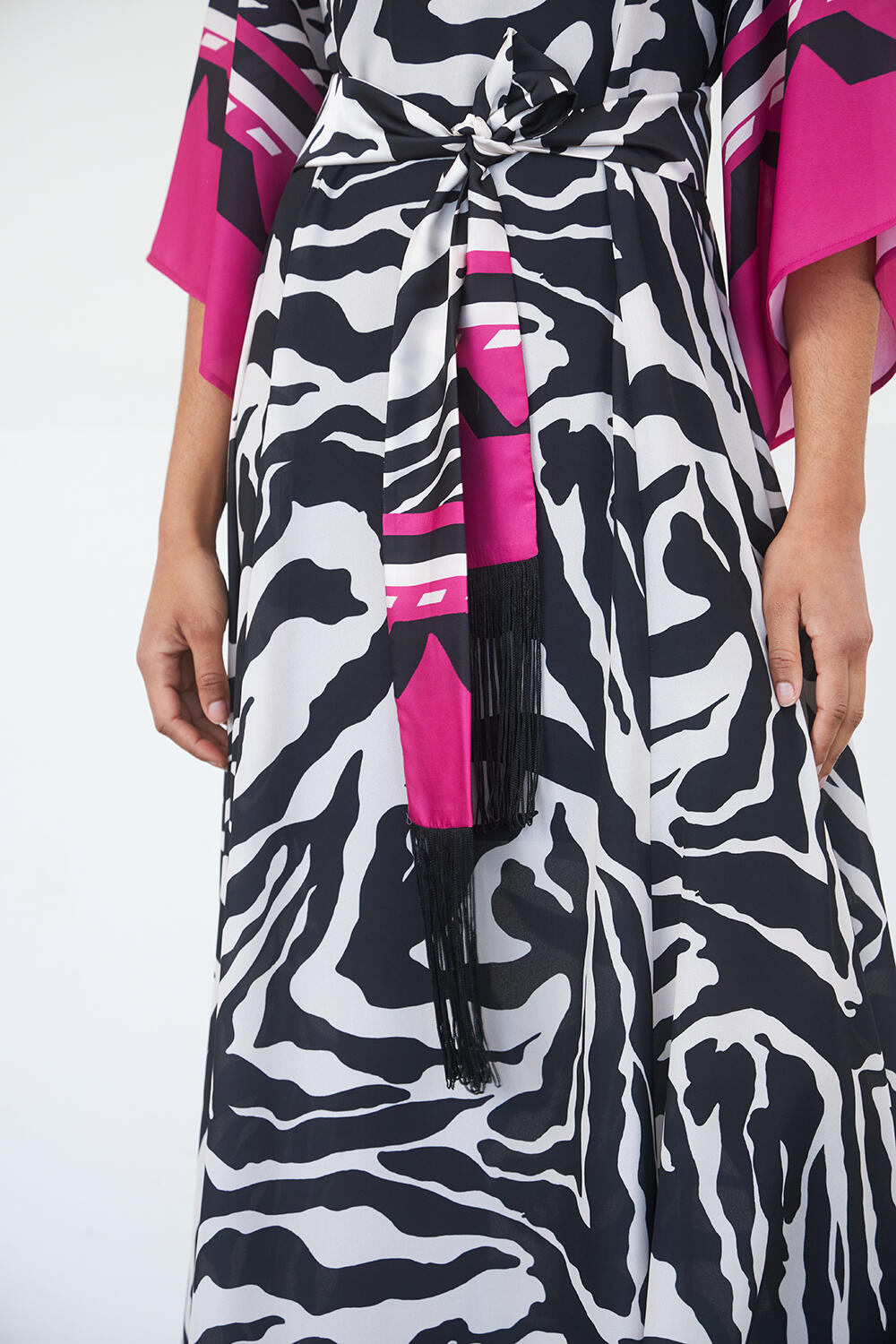 Φόρεμα σε στυλ τουνικ με συνδυασμό χρωμάτων, μανίκια πεταλούδα και αποσπώμενη ζώνη με τελείωμα με κρόσι. Σε εντυπωσιακό animal print σχέδιο.