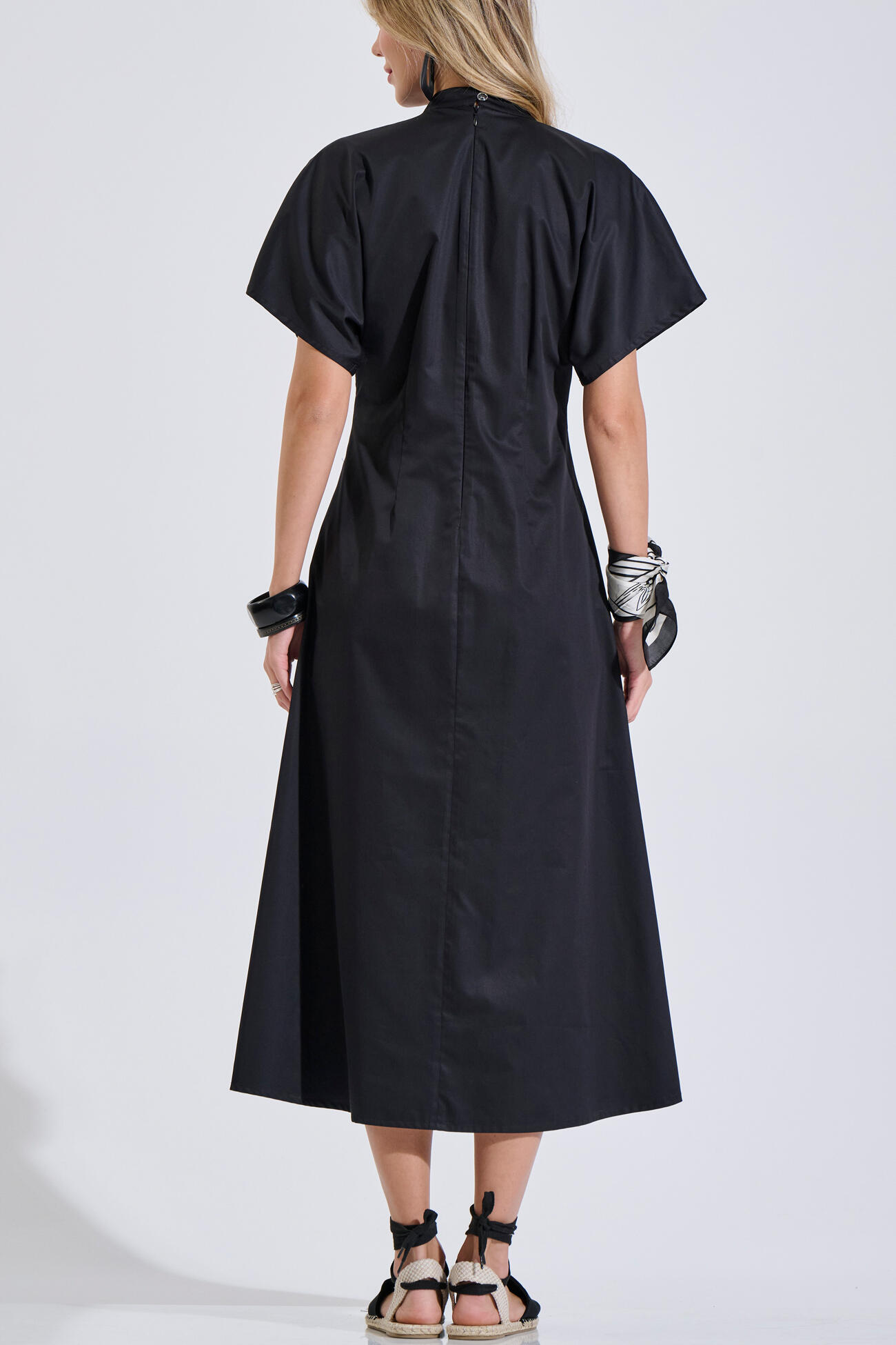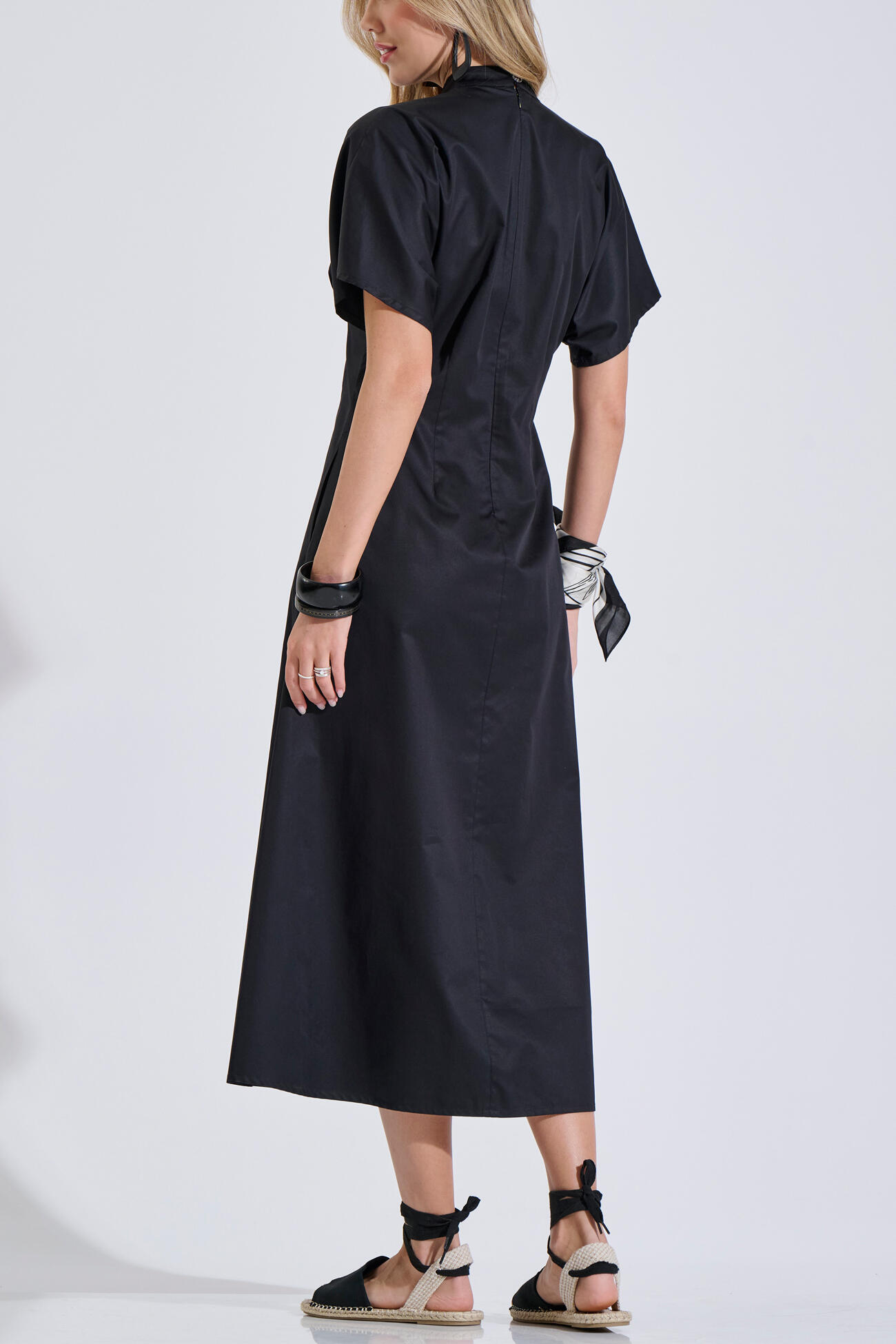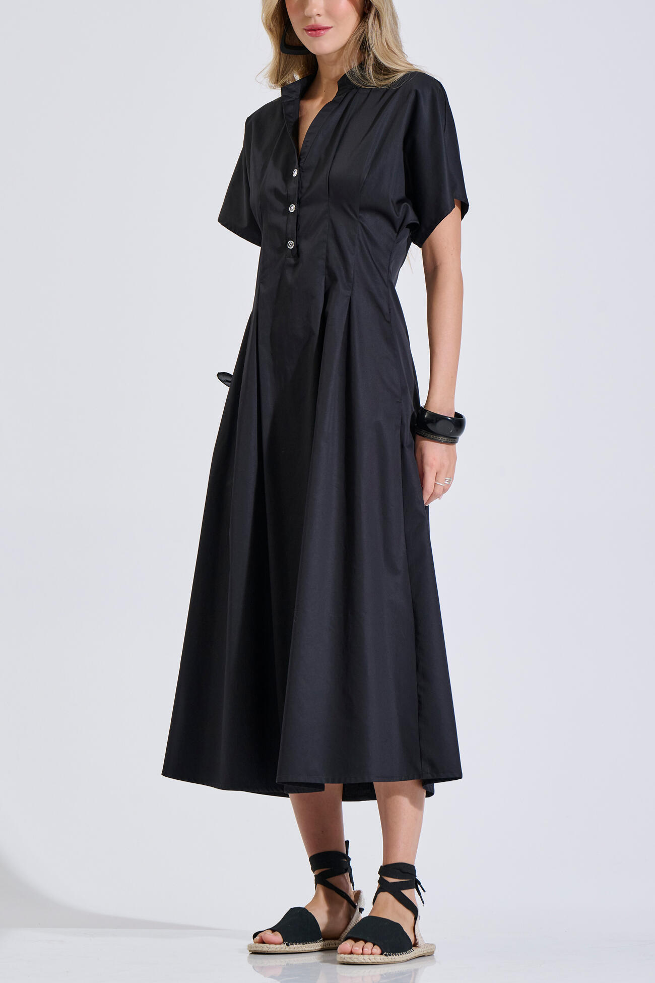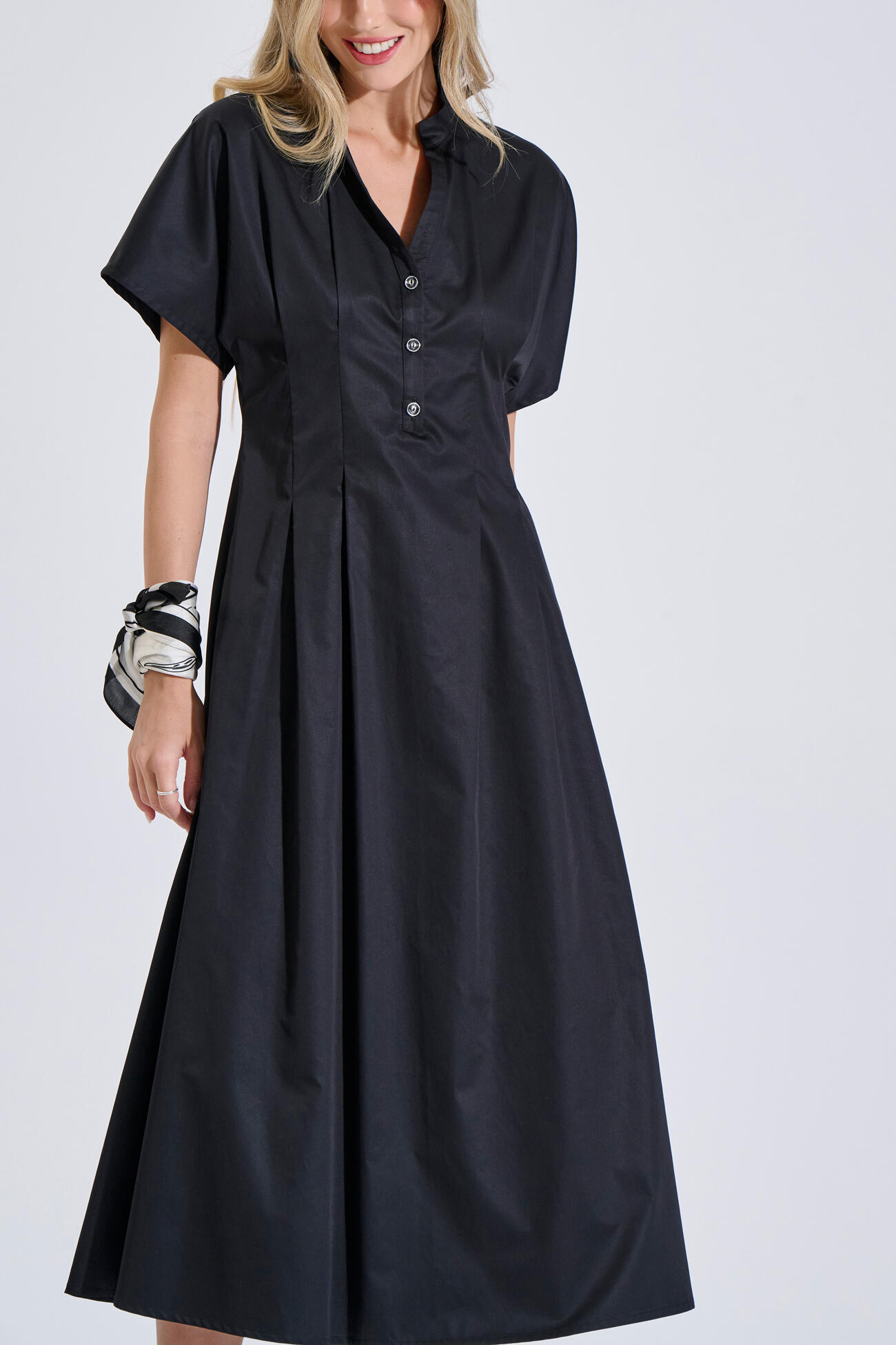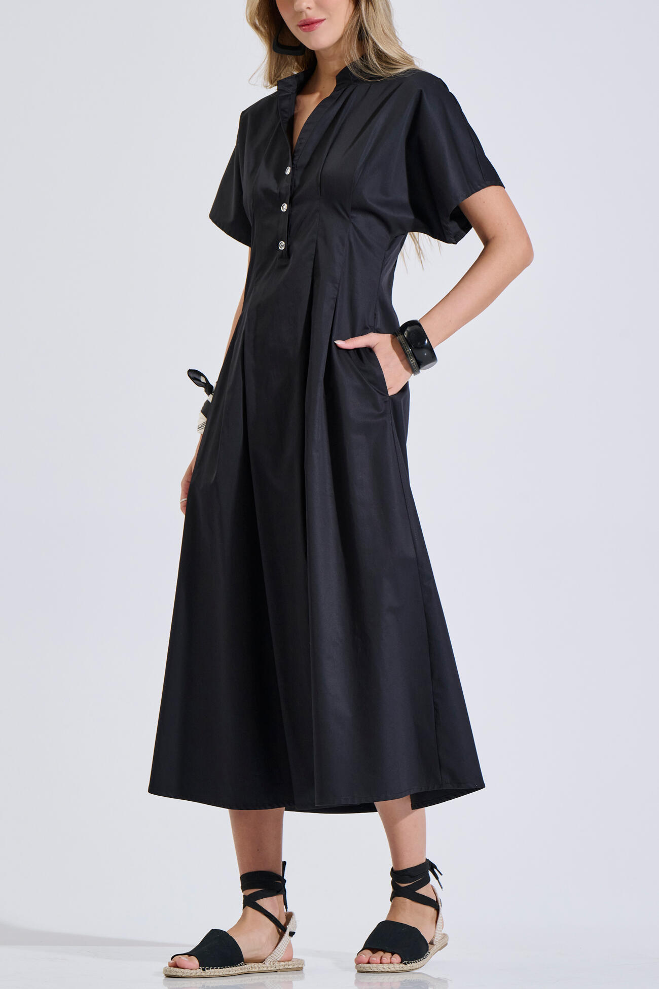 Βαμβακερό φόρεμα με V λαιμόκοψη και πατιλέτα με κουμπιά στο μπροστινό μέρος. Διαθέτει κοντό μανίκι, πιέτες, πλαϊνές τσέπες και κλείσιμο με φερμουάρ στο πίσω μέρος. Ιδανική επιλογή για καθημερινά και πιο προσεγμένα looks.