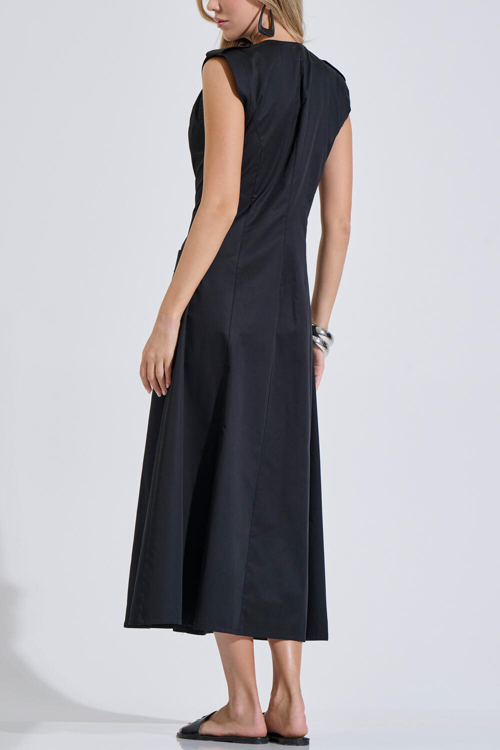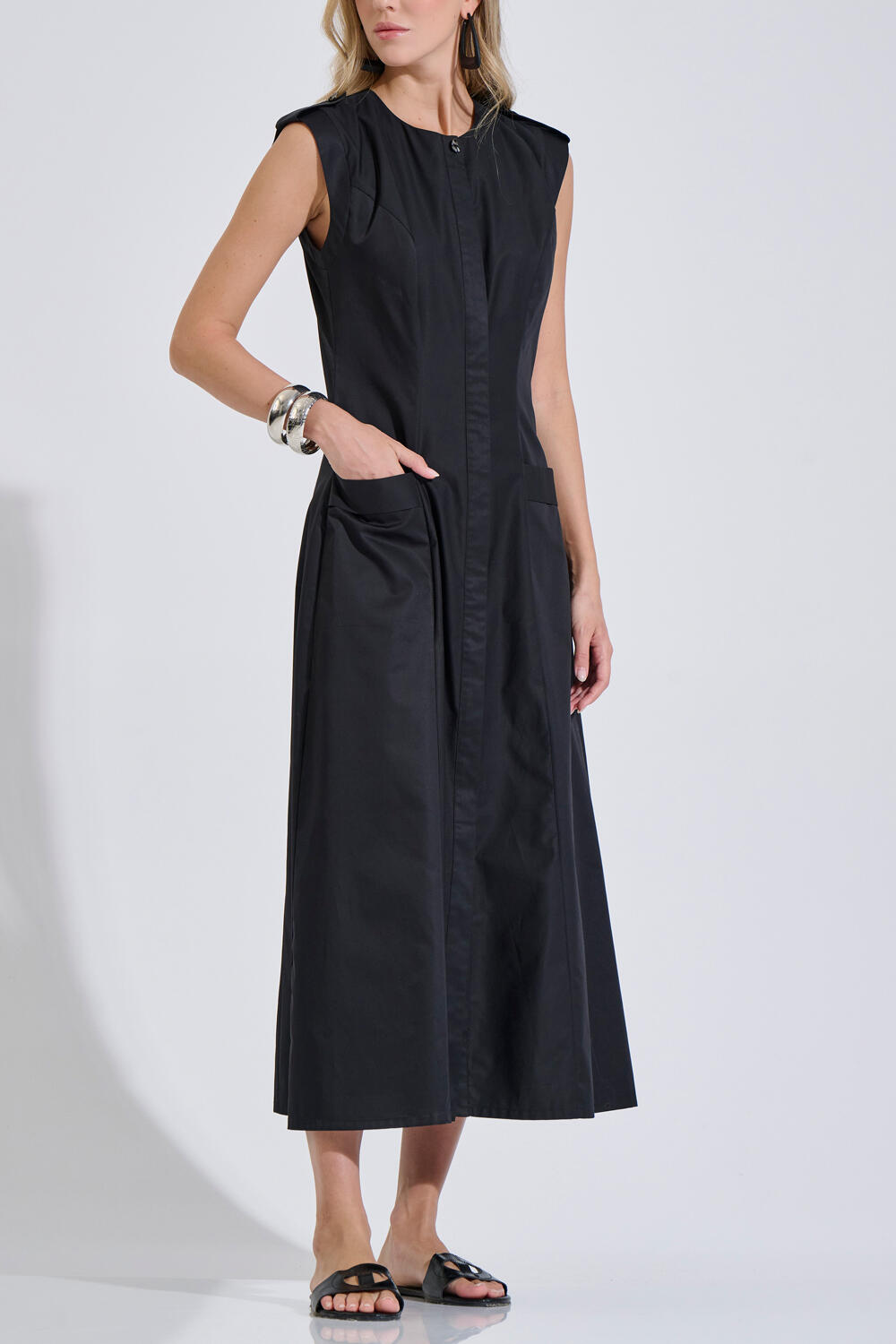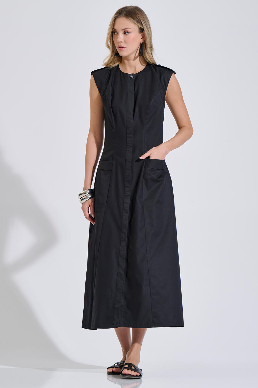 Βαμβακερό μίντι φόρεμα σε κομψή γραμμή με στρογγυλή λαιμόκοψη. Διαθέτει μπροστινό κλείσιμο με κρυφή πατιλέτα και διακοσμητικό κουμπί στο επάνω μέρος. Στους ώμους υπάρχουν διακριτικές επωμίδες ενώ οι πλαϊνές τσέπες χαρίζουν πρακτικότητα. Η γραμμή ανοίγει απαλά προς τα κάτω, δημιουργώντας κίνηση και κομψότητα σε κάθε εμφάνιση.