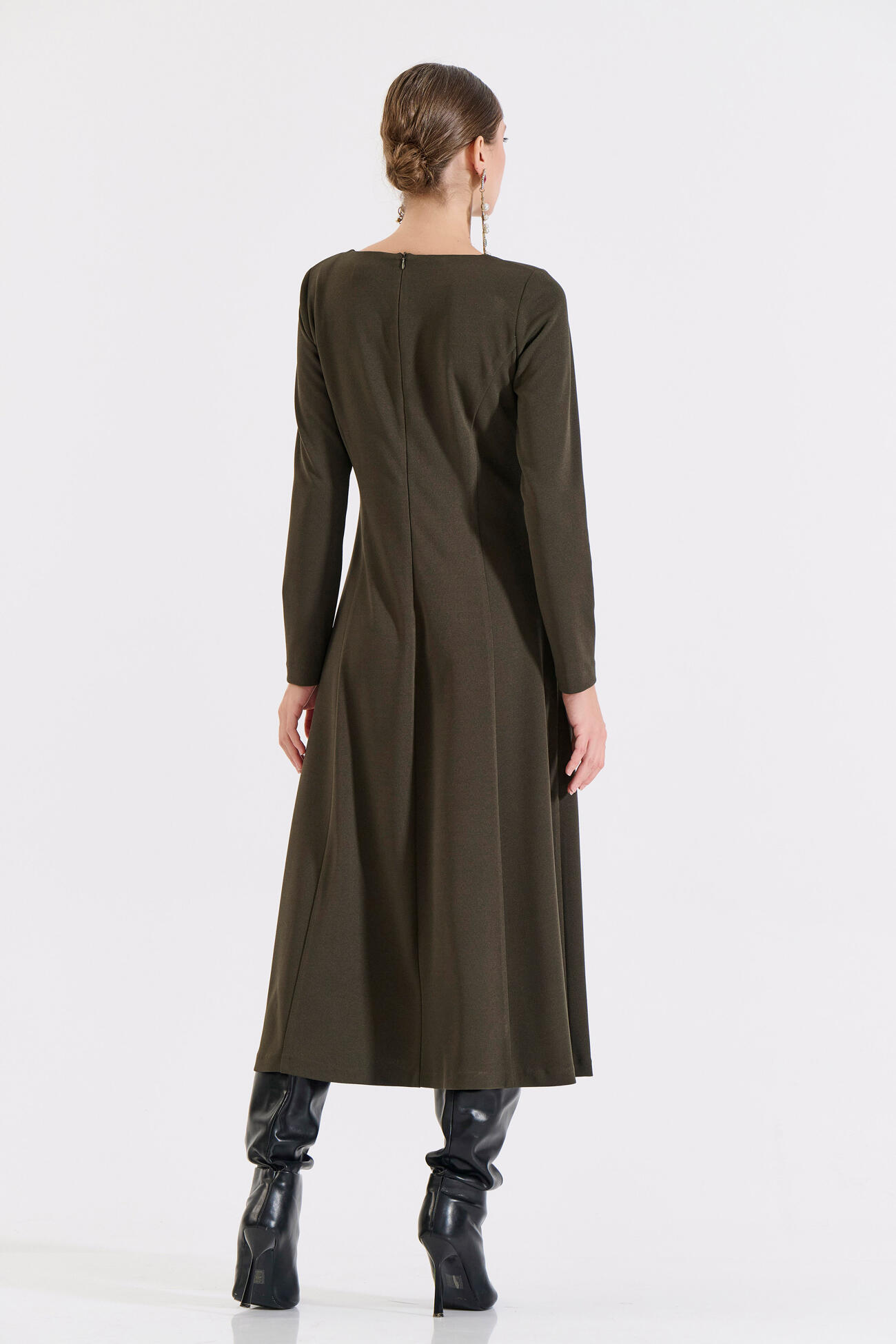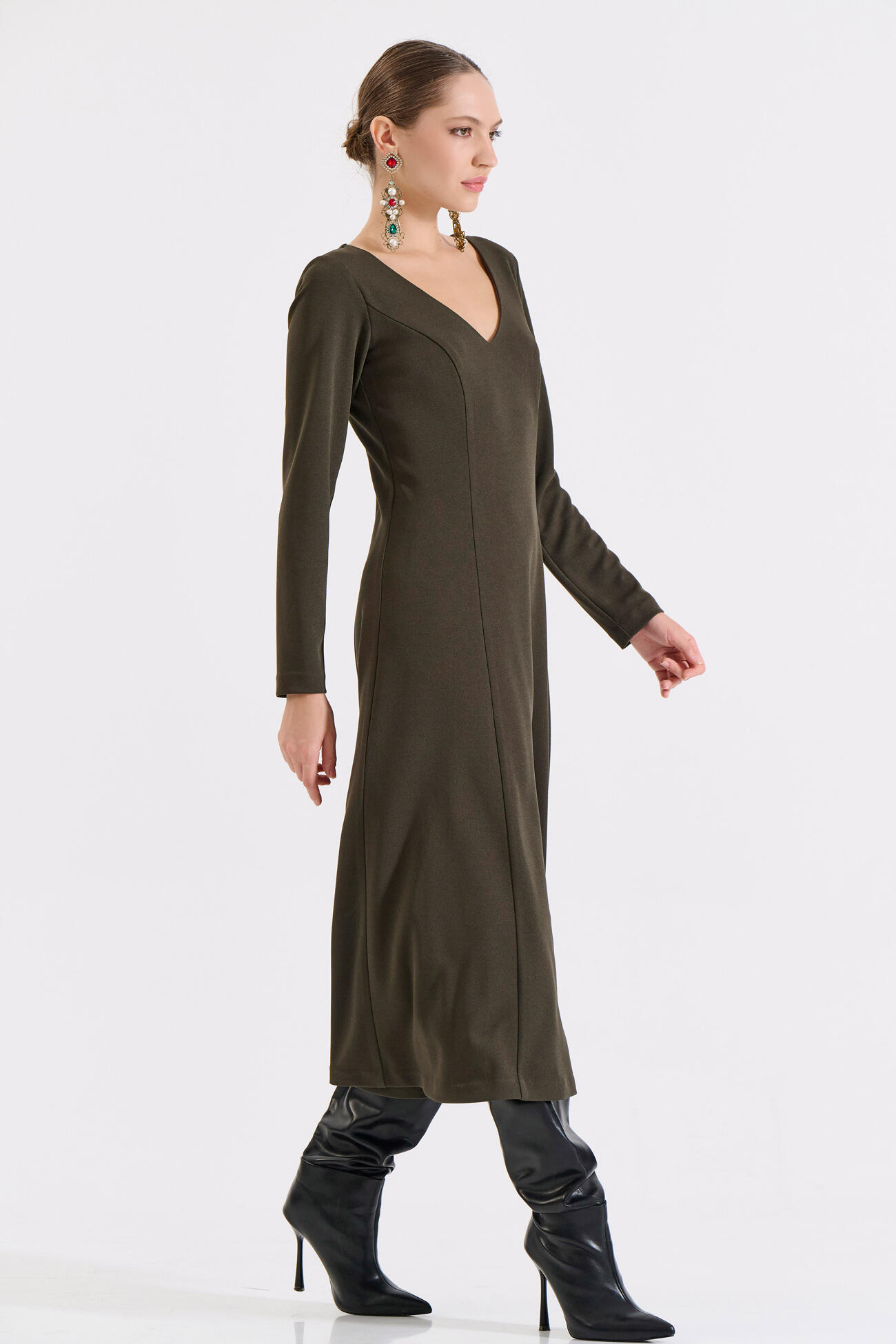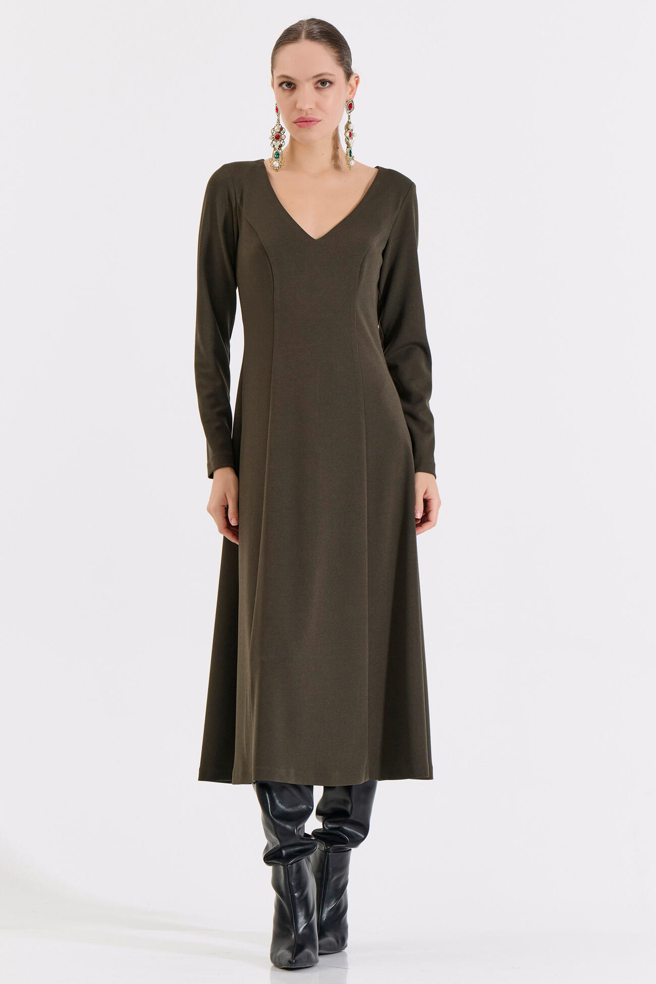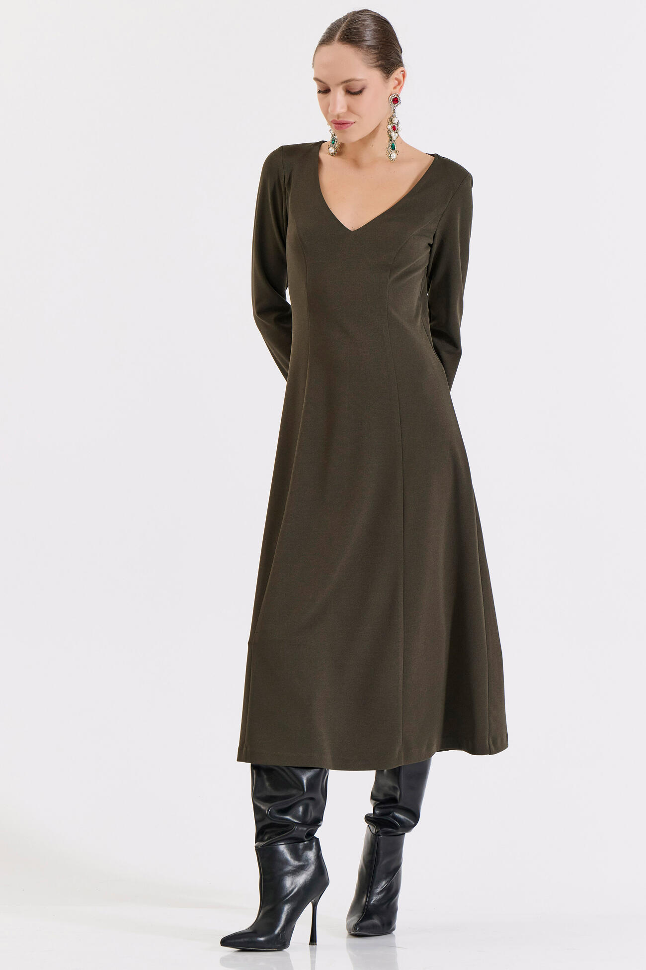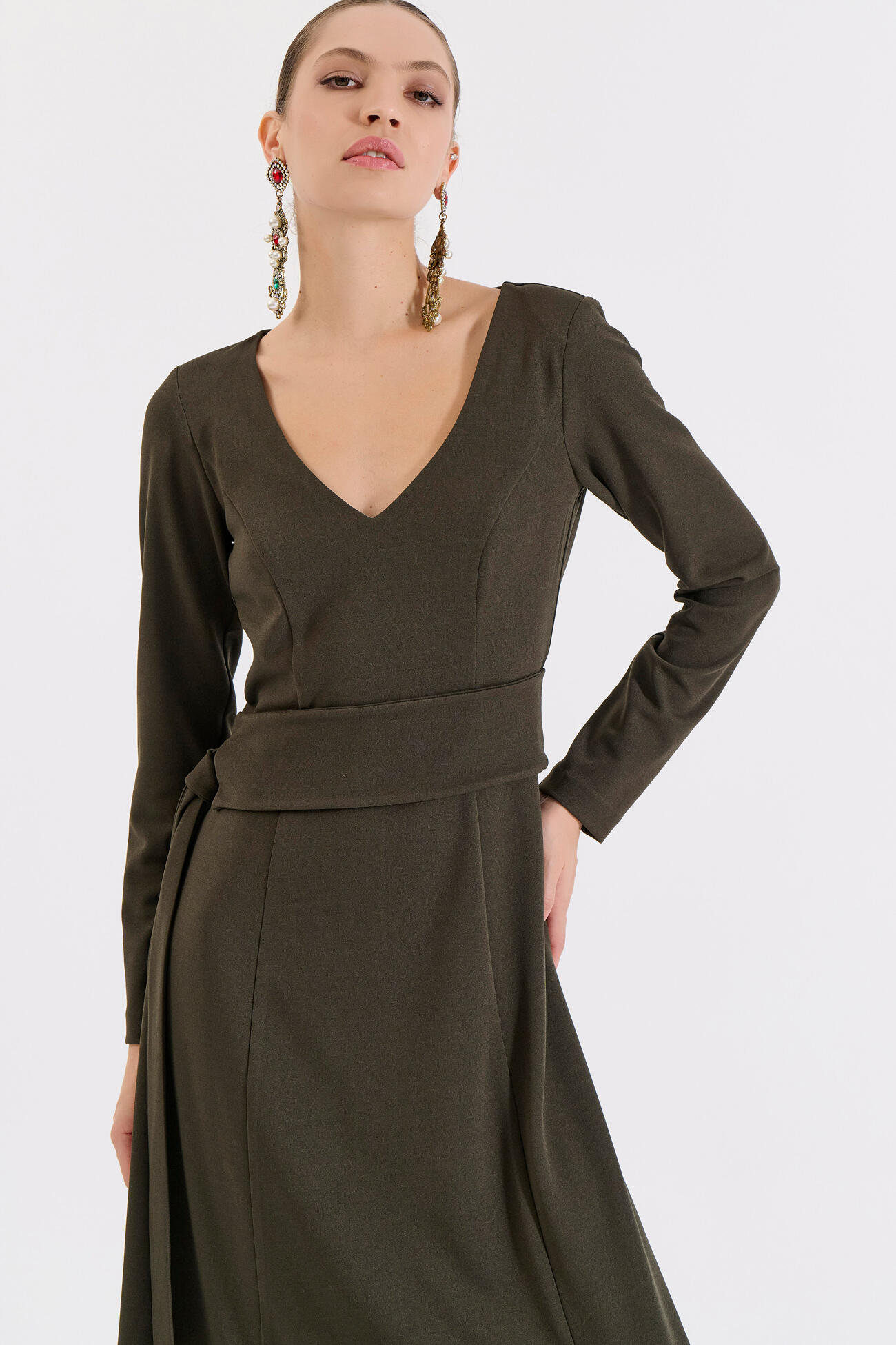 Μακρύ Κλος Φόρεμα με V Ντεκολτέ και Ζώνη
