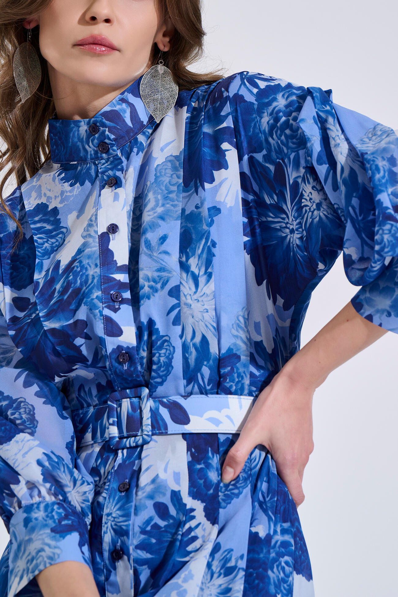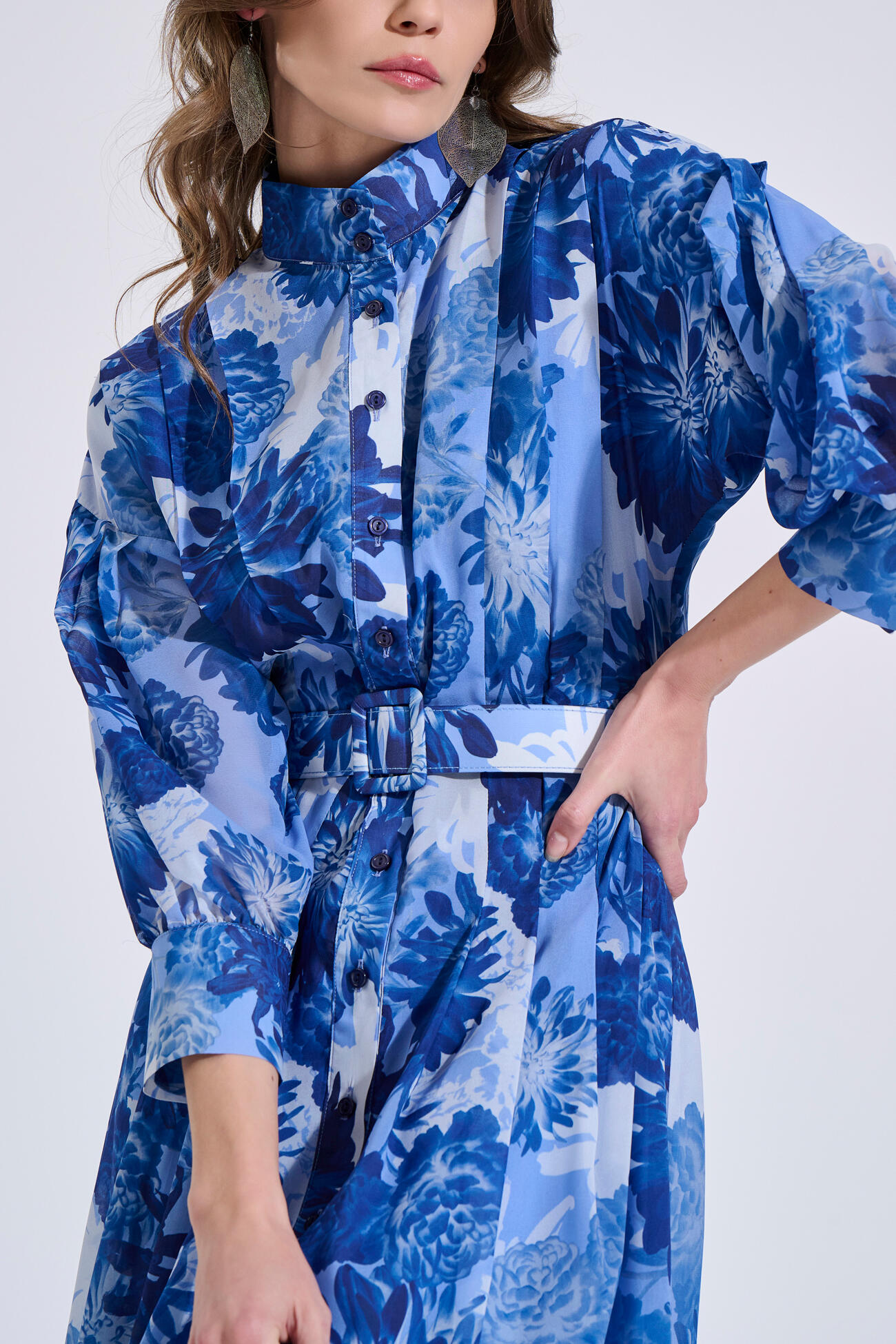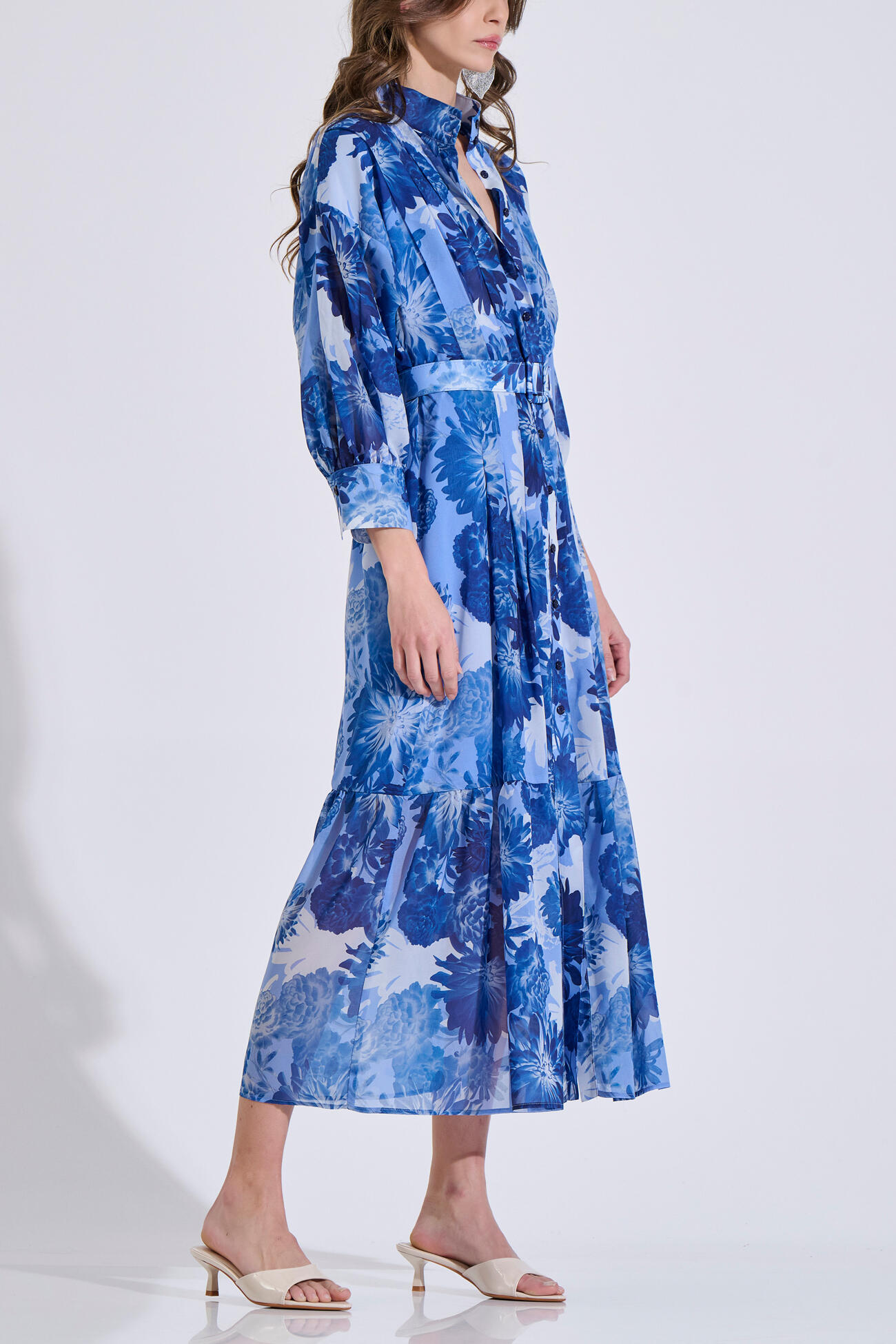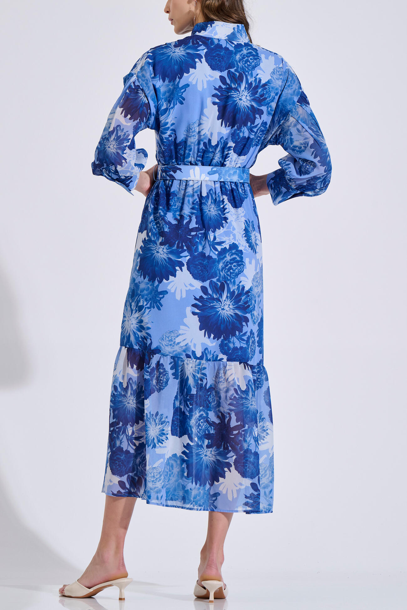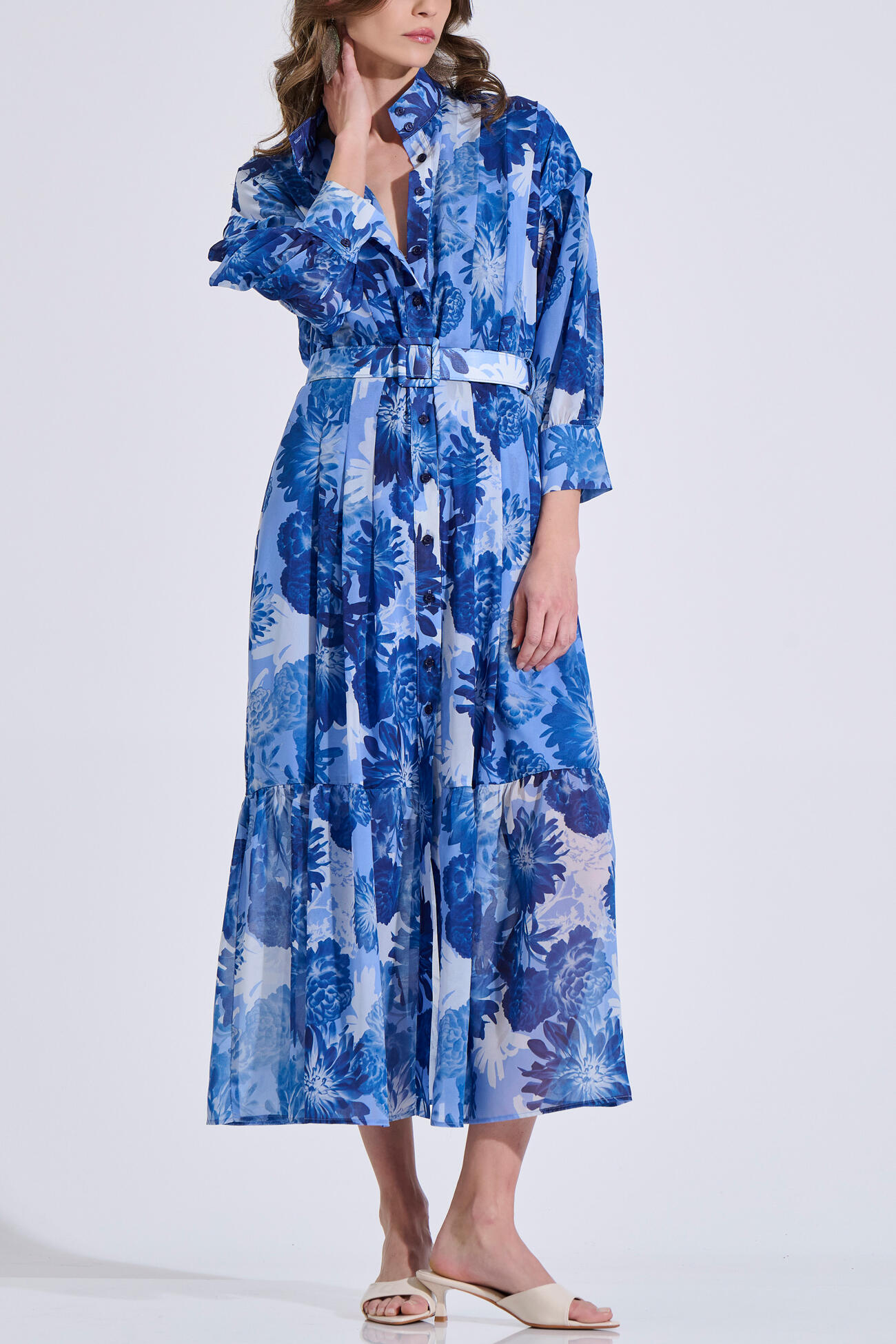 Μακρύ σεμιζιέ φόρεμα με floral μοτίβο σε αέρινη γραμμή. Διαθέτει Mao γιακά, μπροστινό κλείσιμο με κουμπιά και πιέτες που χαρίζουν κομψή κίνηση στο ύφασμα.