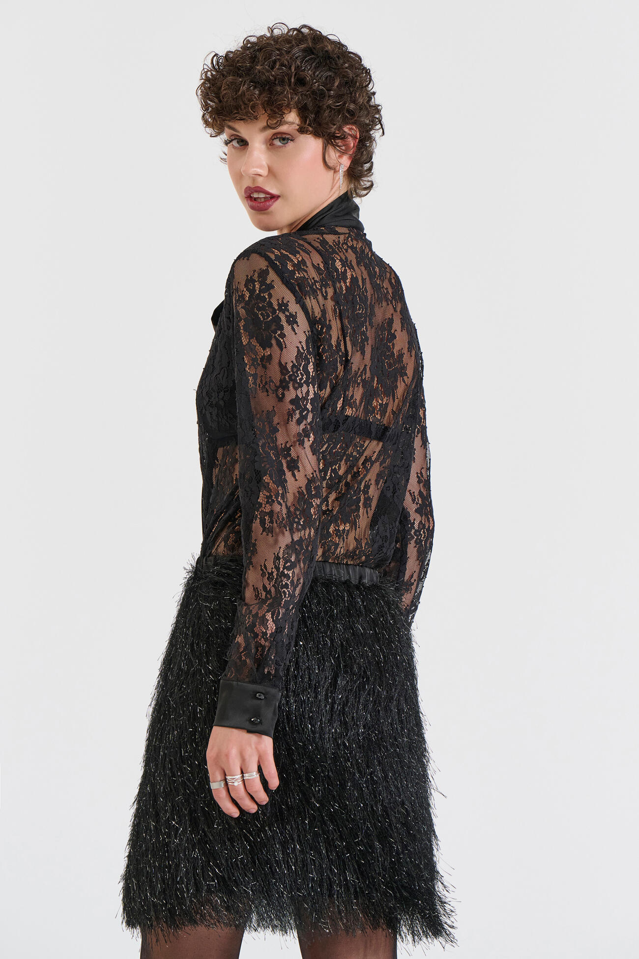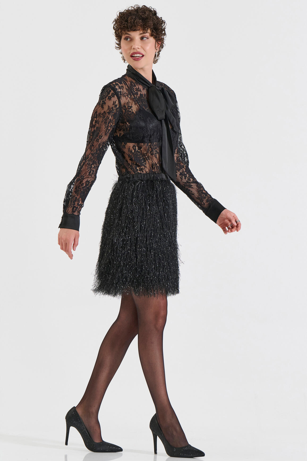 Εντυπωσιακό μίνι φόρεμα που συνδυάζει ρομαντική δαντέλα στο επάνω μέρος με φούστα τύπου κρόσια που χαρίζει κίνηση και λάμψη σε κάθε βήμα. Η δαντέλα προσφέρει θηλυκότητα και refined αισθητική, ενώ ο φιόγκος στον λαιμό δημιουργεί ένα statement, elegant τελείωμα. Η φούστα με υφή κρόσιας προσθέτει glam διάθεση, ιδανική για βραδινές.