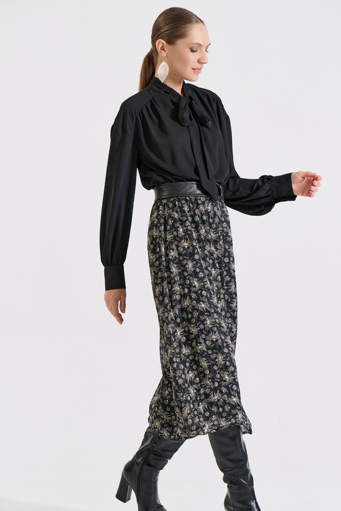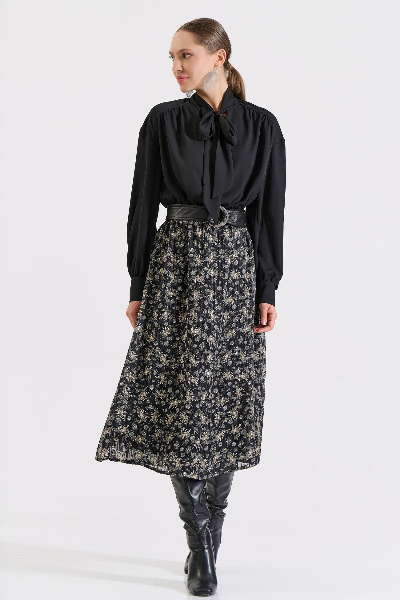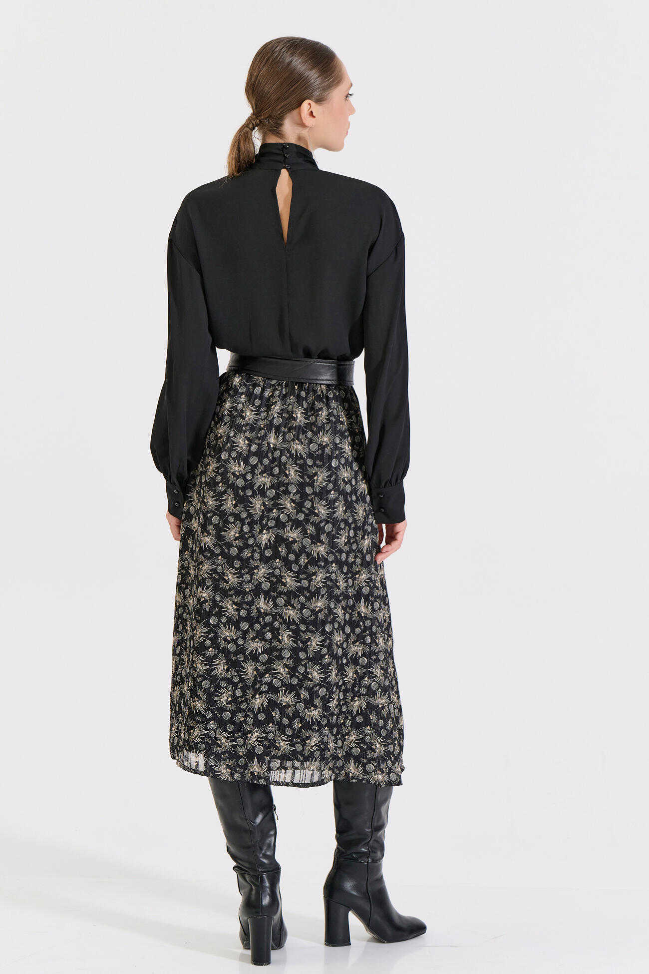 Μίντι φόρεμα με μονόχρωμο επάνω μέρος και εμπριμέ φούστα. Διαθέτει λάστιχο στη μέση που προσφέρει άνετη εφαρμογή και ζώνη από δερματίνη που αναδεικνύει τη σιλουέτα. Το δέσιμο φιόγκο στη λαιμόκοψη και τα μακριά μανίκια ολοκληρώνουν το κομψό και θηλυκό στυλ του.