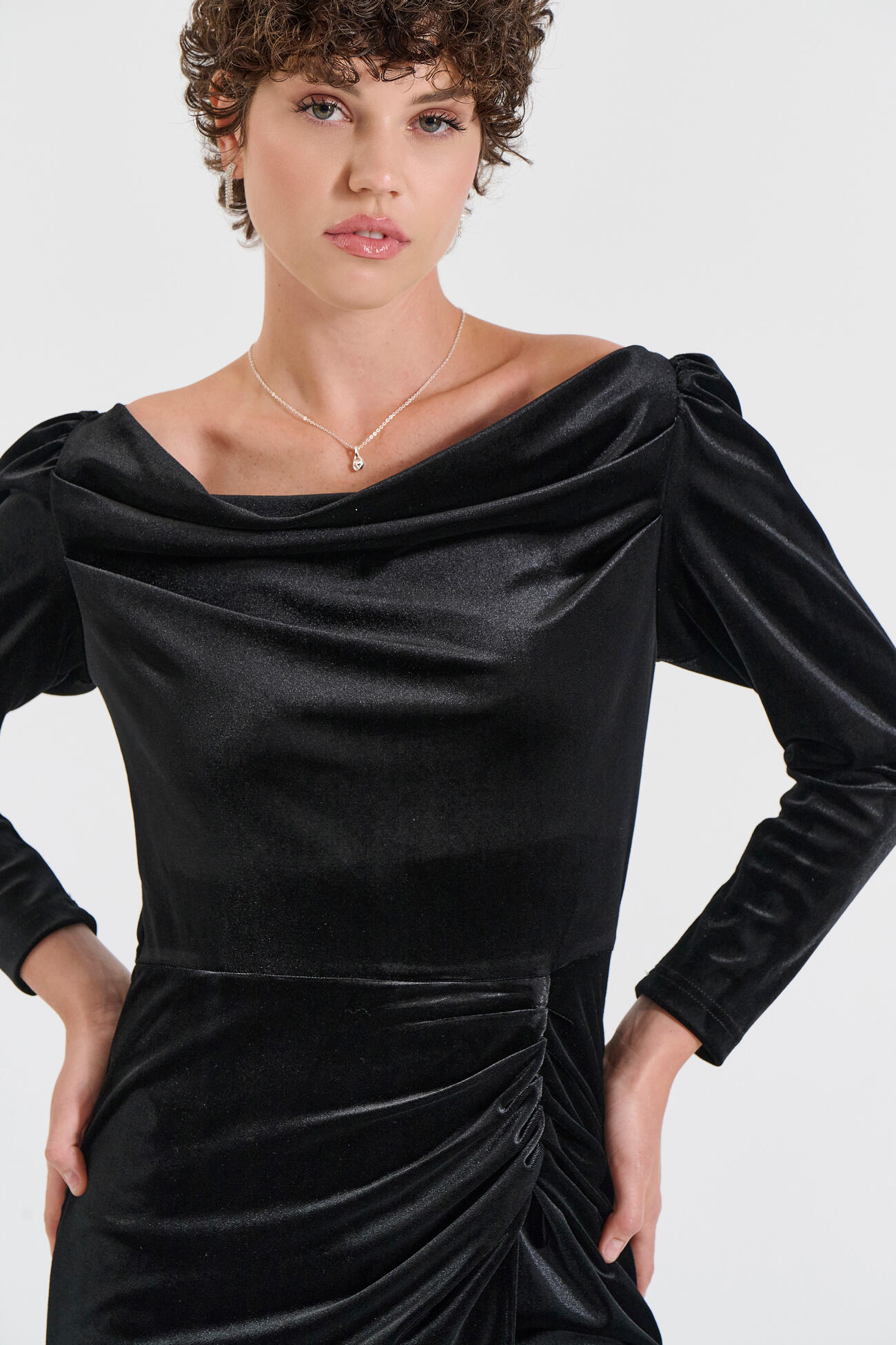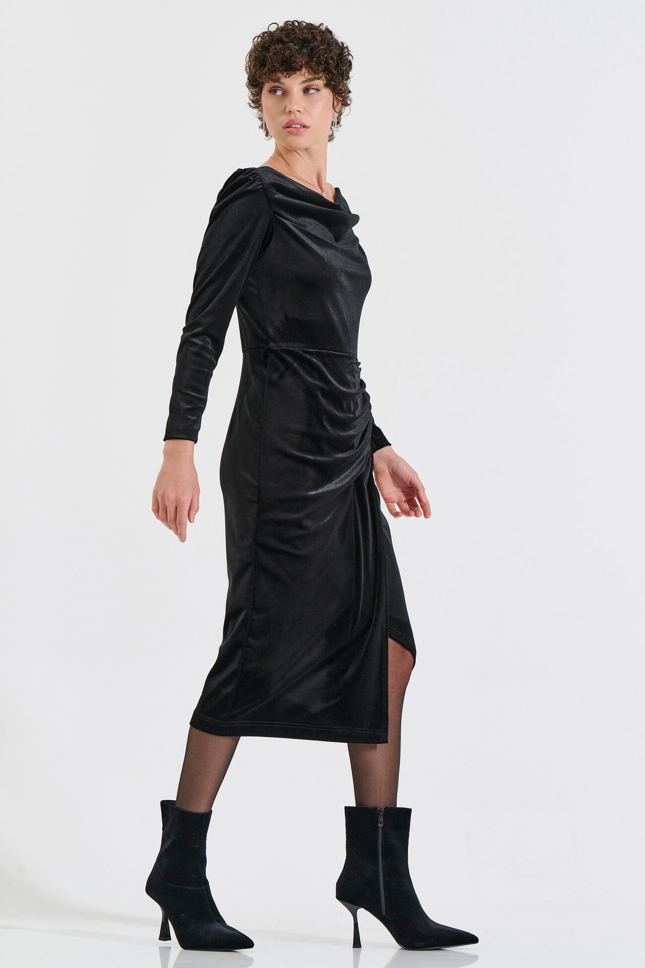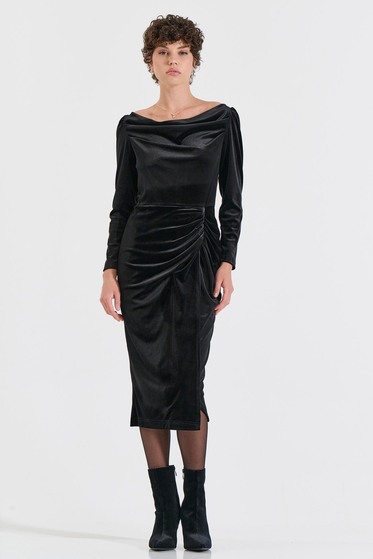 Κομψό μίντι φόρεμα από απαλό βελούδο που χαρίζει elegant λάμψη και θηλυκό χαρακτήρα. Διαθέτει ιδιαίτερη draped λαιμόκοψη, μακριά μανίκια και σούρες στο πλάι που κολακεύουν τη σιλουέτα και αναδεικνύουν τη μέση. Το διακριτικό άνοιγμα μπροστά προσφέρει άνεση στην κίνηση και προσθέτει modern αισθητική. Ιδανική επιλογή για βραδινές εξόδους και special εμφανίσεις.