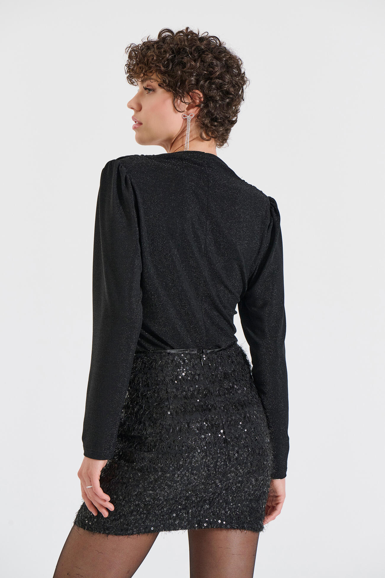Εντυπωσιακή μίνι φούστα με παγιέτες και υφή τύπου κρόσια, που χαρίζει μοναδική λάμψη και κίνηση σε κάθε βήμα.Συνδυάζεται άψογα με elegant tops, σατέν πουκάμισα ή minimal μπλούζες για ένα look που ξεχωρίζει.
