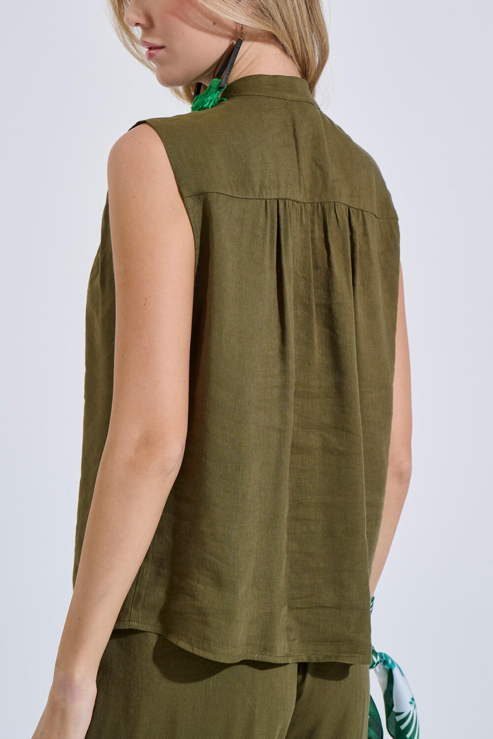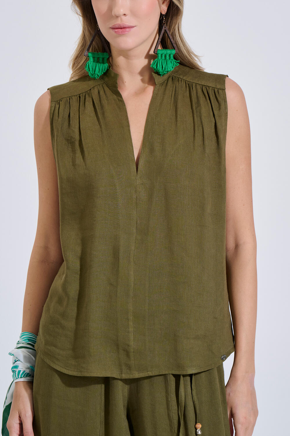 Αμάνικη μπλούζα σε άνετη γραμμή με V λαιμόκοψη. Διαθέτει διακριτικές πιέτες στους ώμους που προσθέτουν λεπτομέρεια στο σχέδιο. Ιδανική επιλογή για καθημερινά αλλά και πιο προσεγμένα looks.