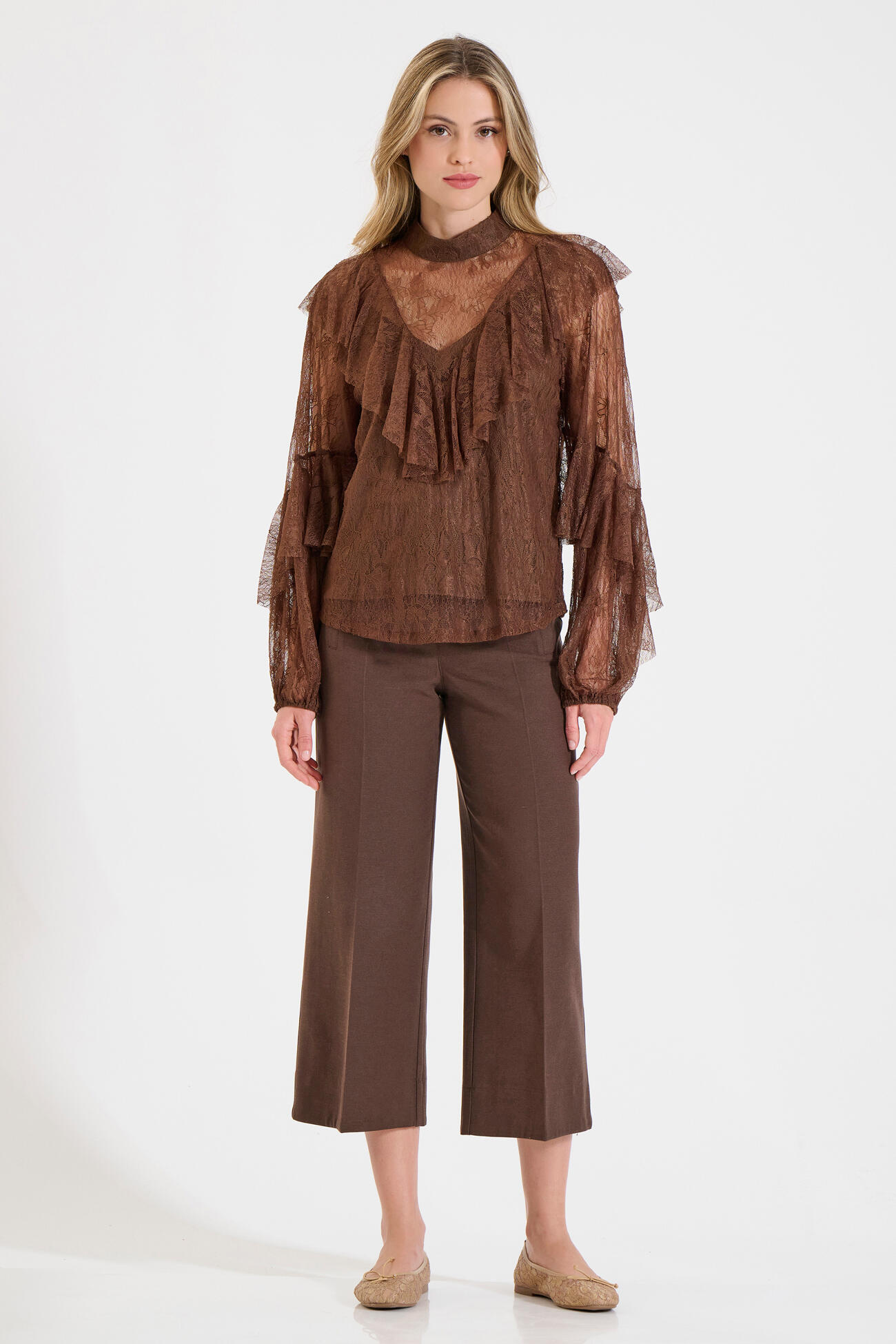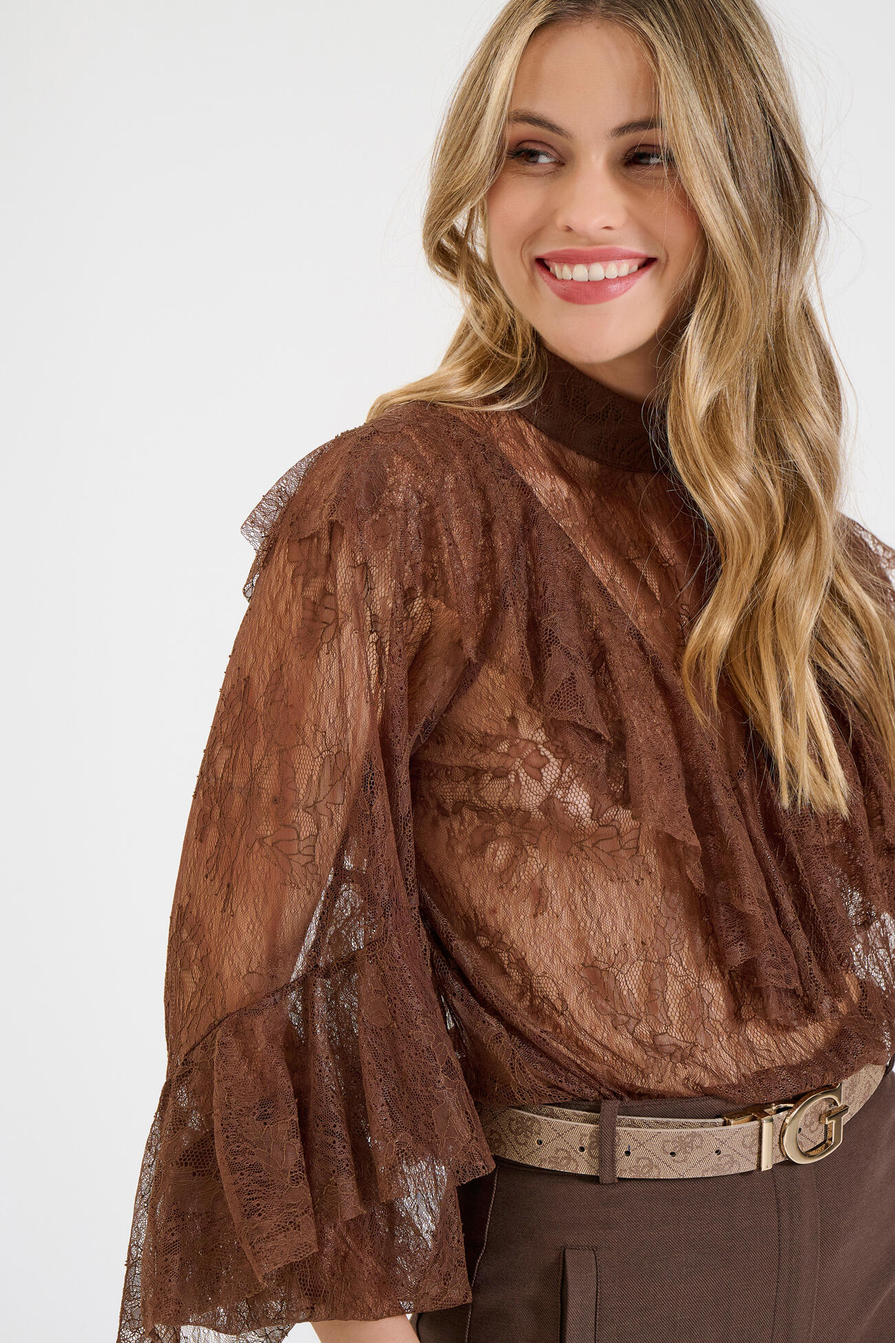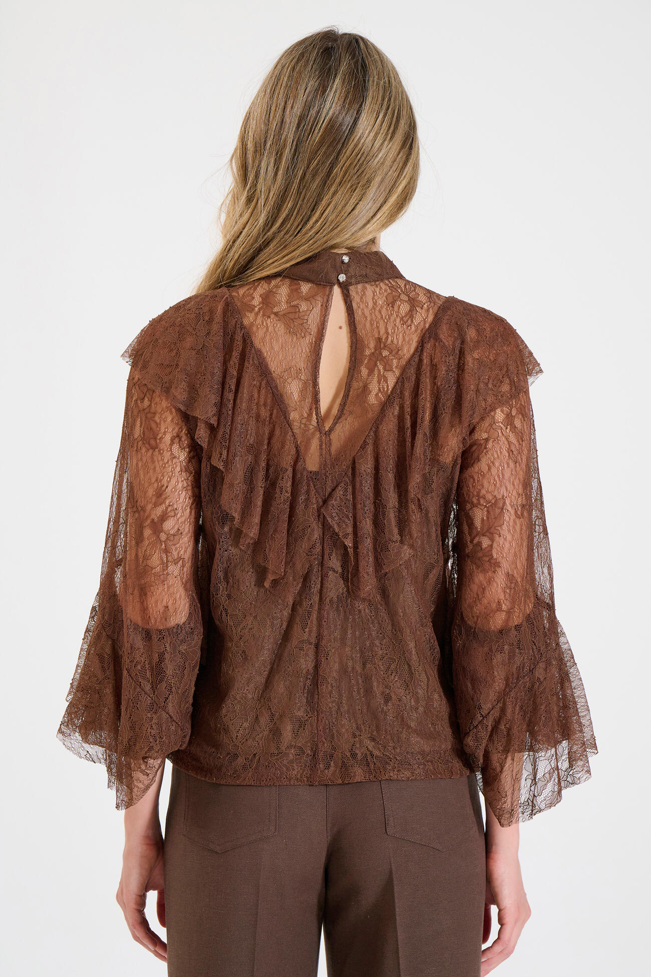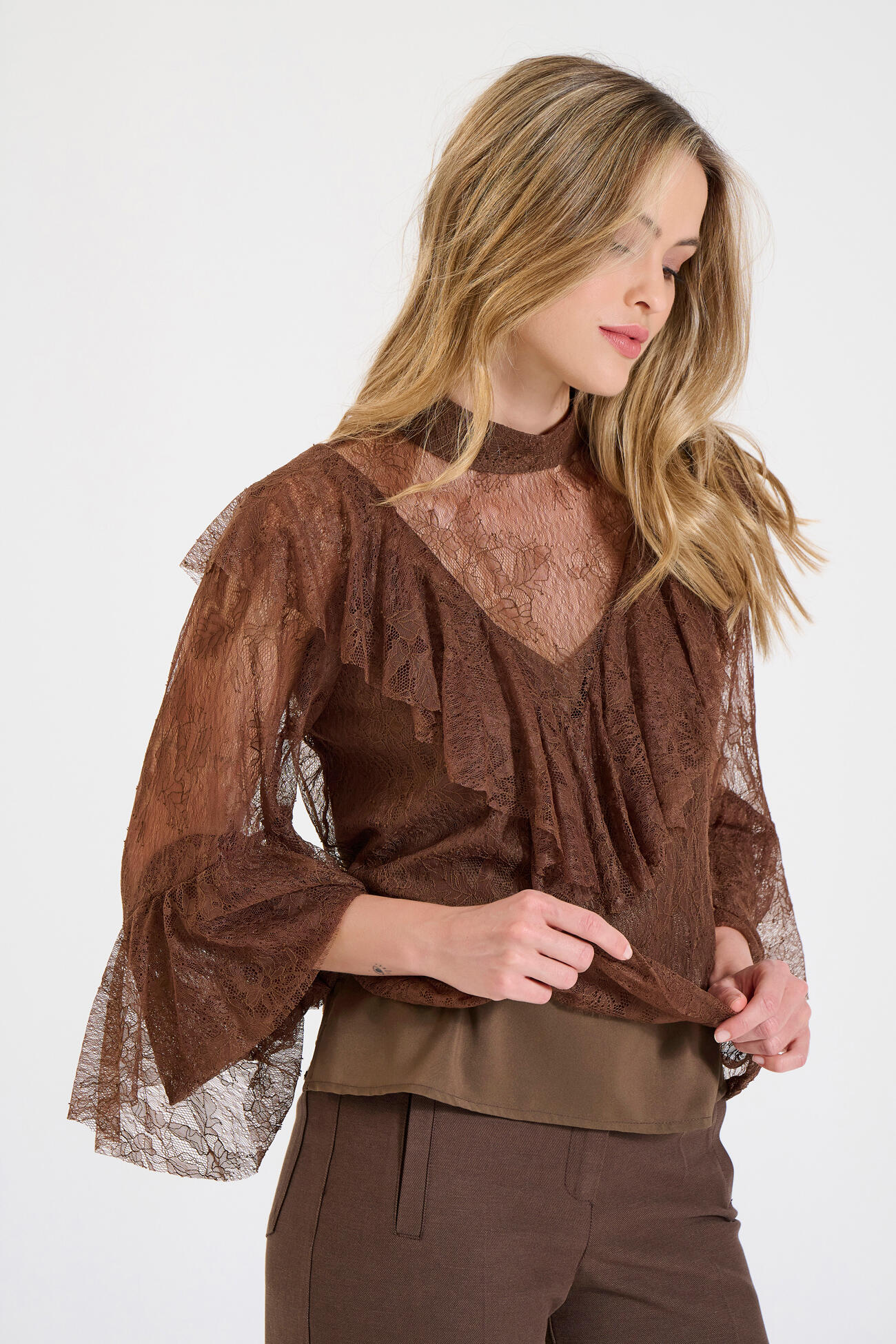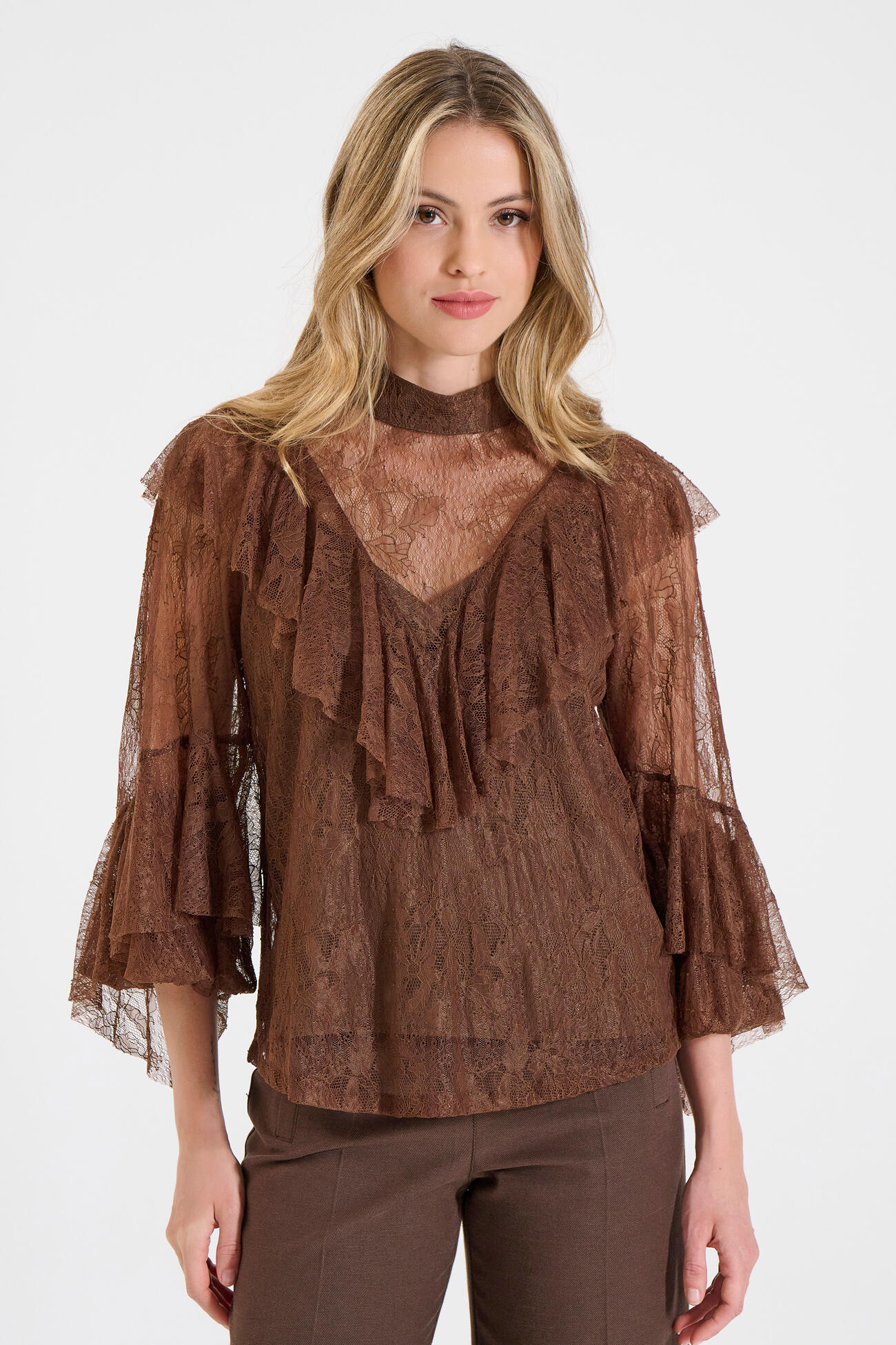 Κομψή δαντελένια μπλούζα με ρομαντικό ύφος και εντυπωσιακά βολάν στο μπροστινό και πίσω μέρος. Διαθέτει αποσπώμενο εσωτερικό τοπ για άψογη εφαρμογή και κάλυψη. Ένα θηλυκό κομμάτι που συνδυάζει διαφάνεια και κομψότητα, ιδανικό για elegant εμφανίσεις από το πρωί έως το βράδυ.