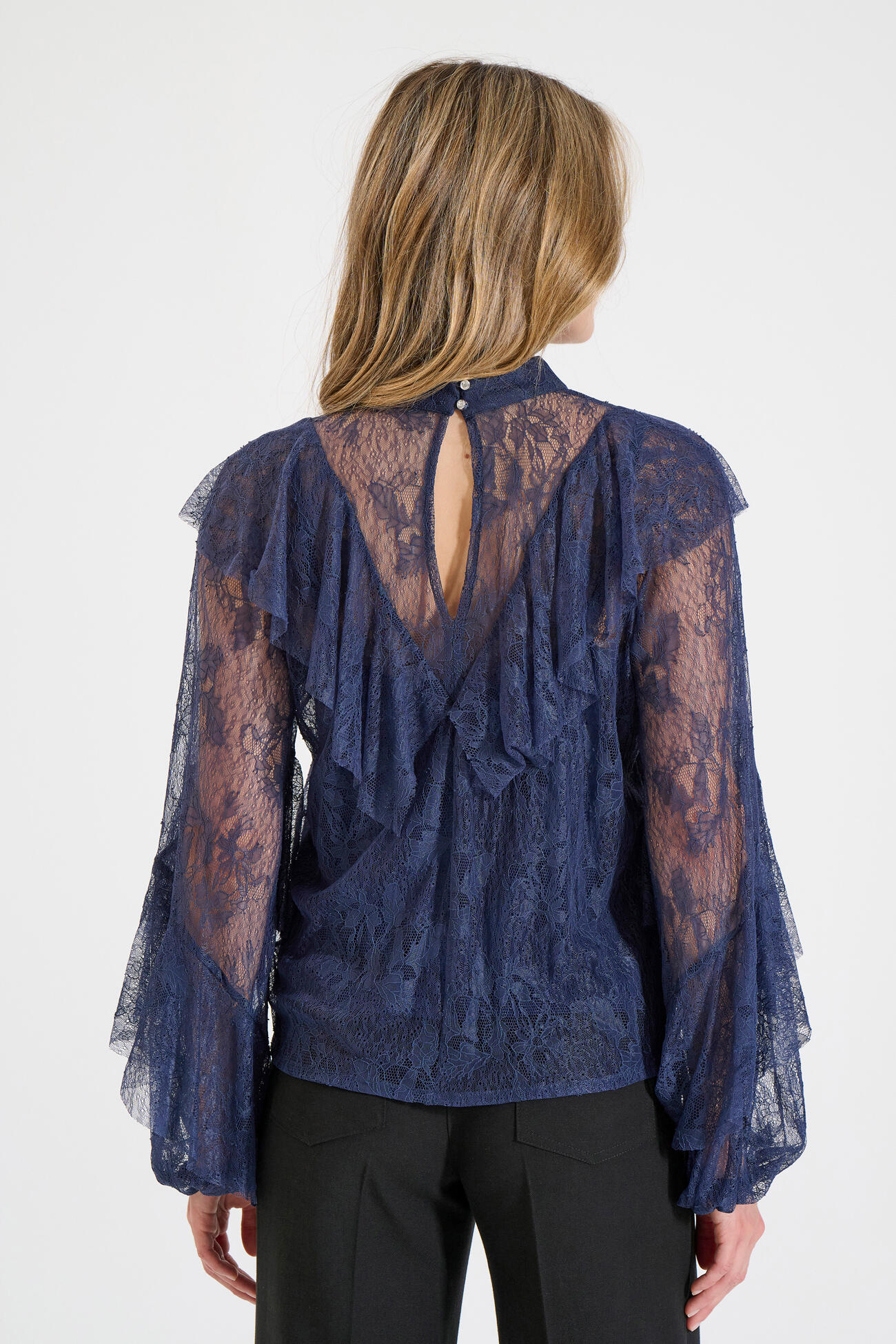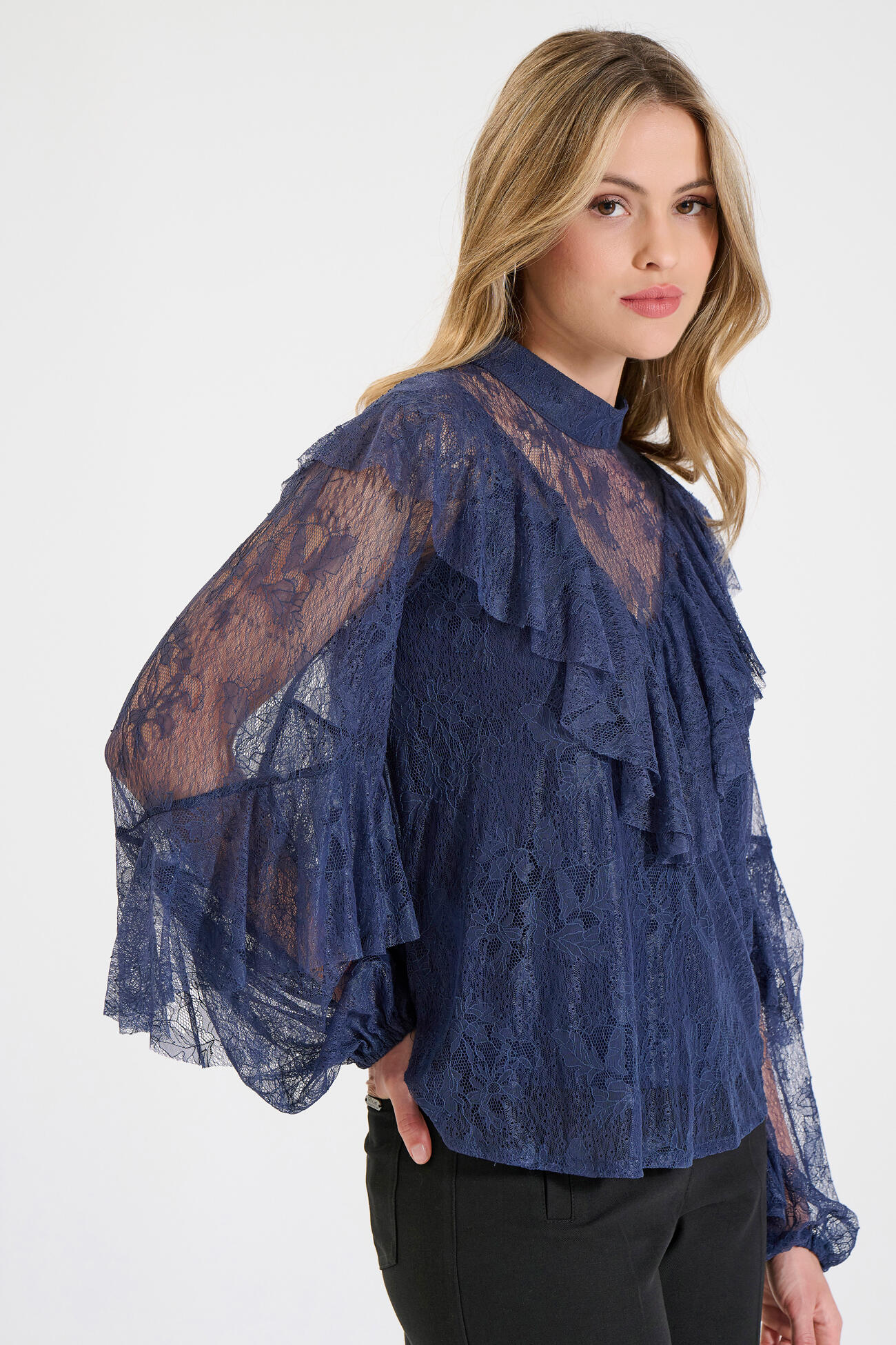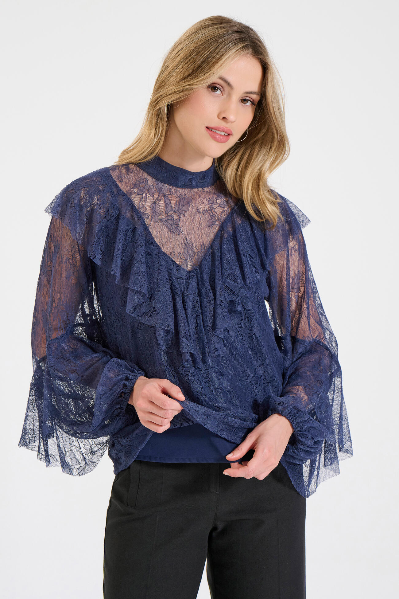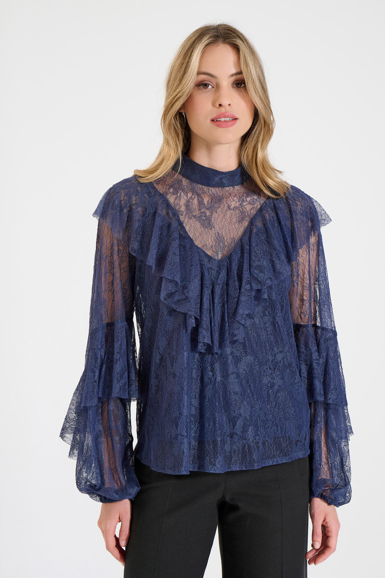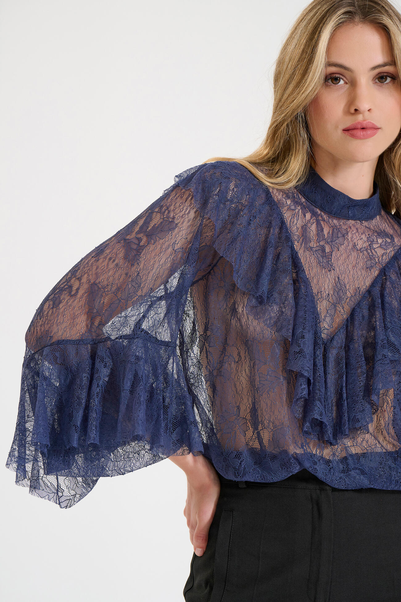 Κομψή δαντελένια μπλούζα με ρομαντικό ύφος και εντυπωσιακά βολάν στο μπροστινό και πίσω μέρος. Διαθέτει αποσπώμενο εσωτερικό τοπ για άψογη εφαρμογή και κάλυψη. Ένα θηλυκό κομμάτι που συνδυάζει διαφάνεια και κομψότητα, ιδανικό για elegant εμφανίσεις από το πρωί έως το βράδυ.