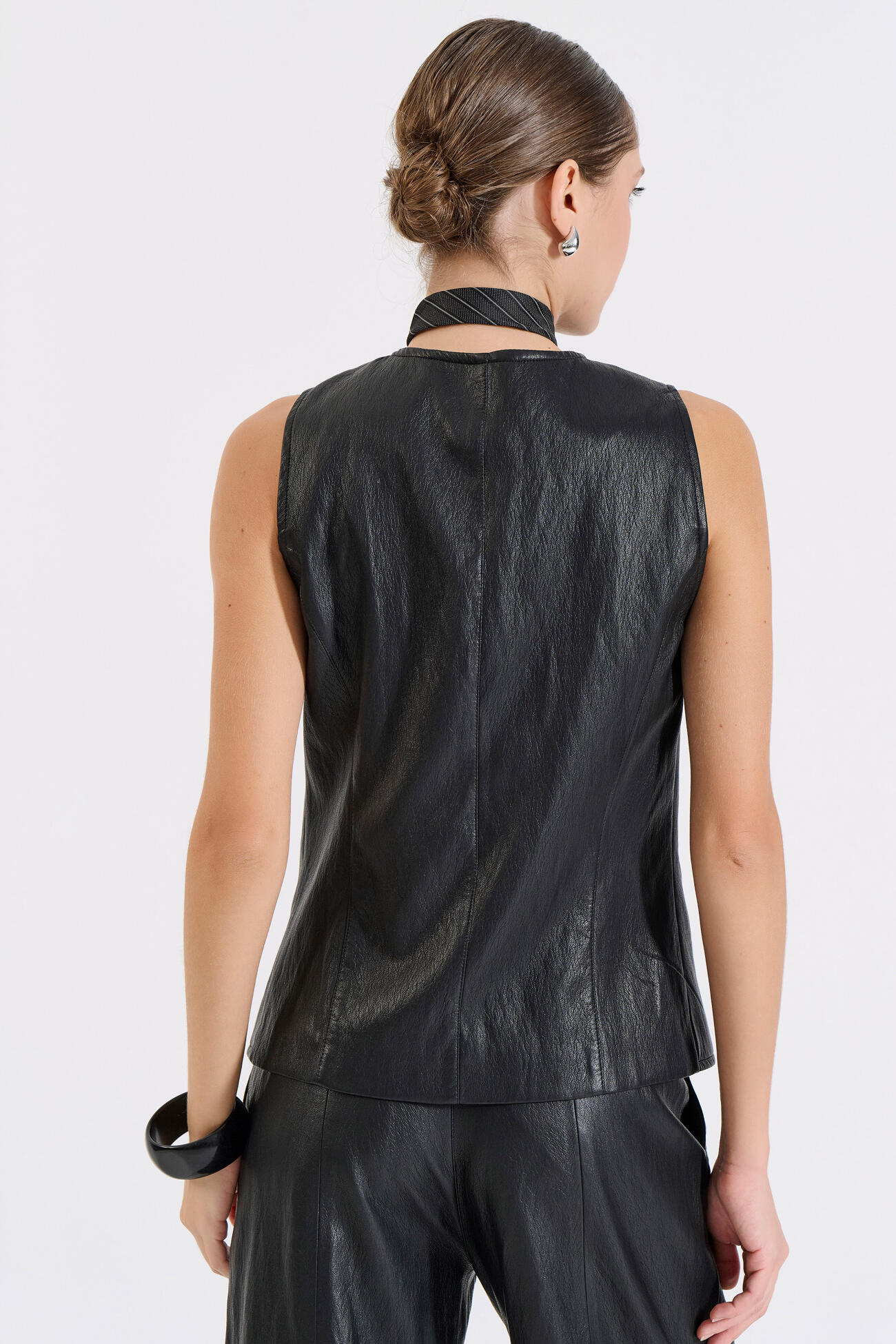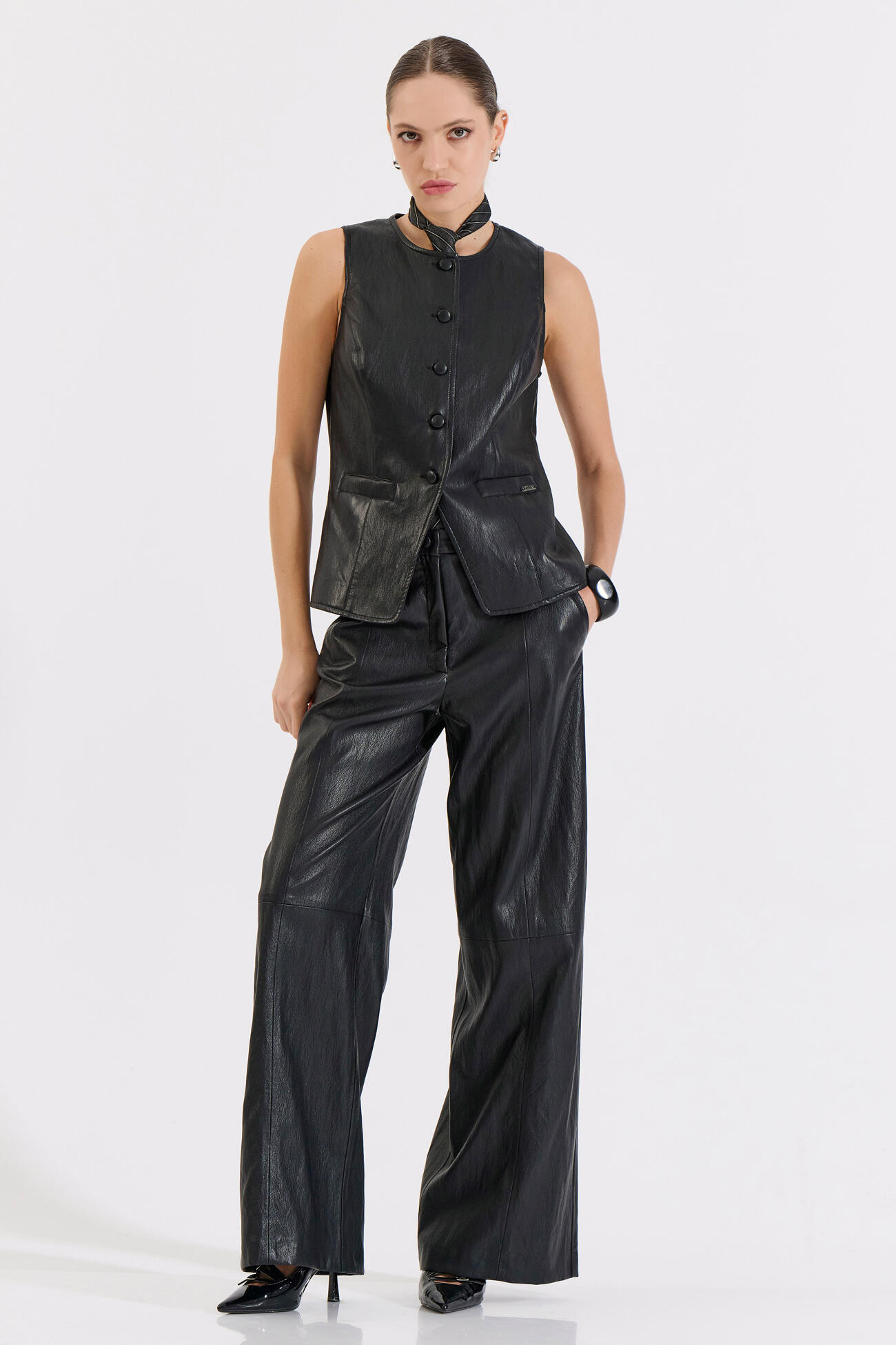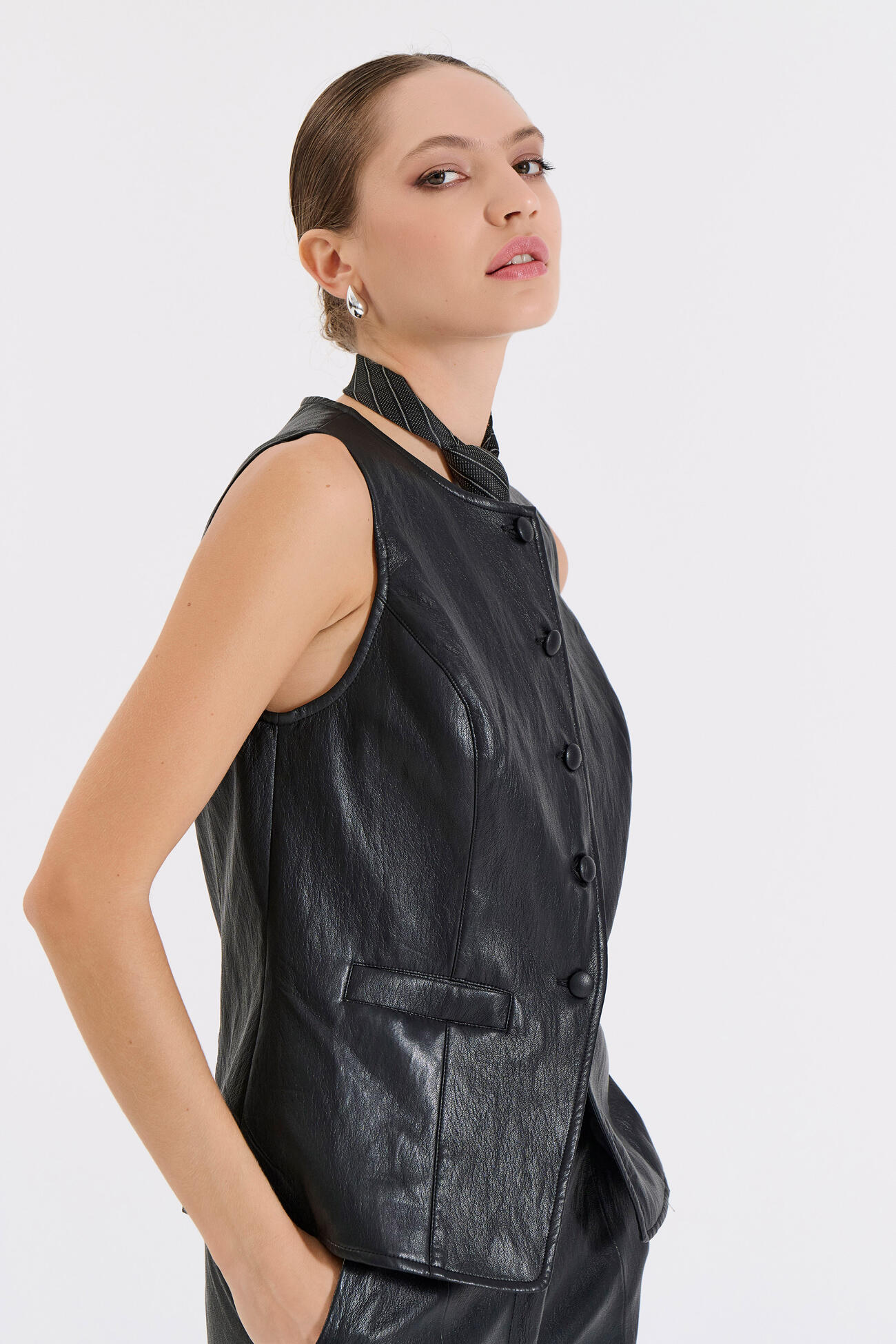 Μοντέρνο γυναικείο γιλέκο από δερματίνη, με στρογγυλή λαιμόκοψη και μπροστινό κλείσιμο με κουμπιά. Διαθέτει τσέπες και ίσια γραμμή που προσφέρει διαχρονική κομψότητα.