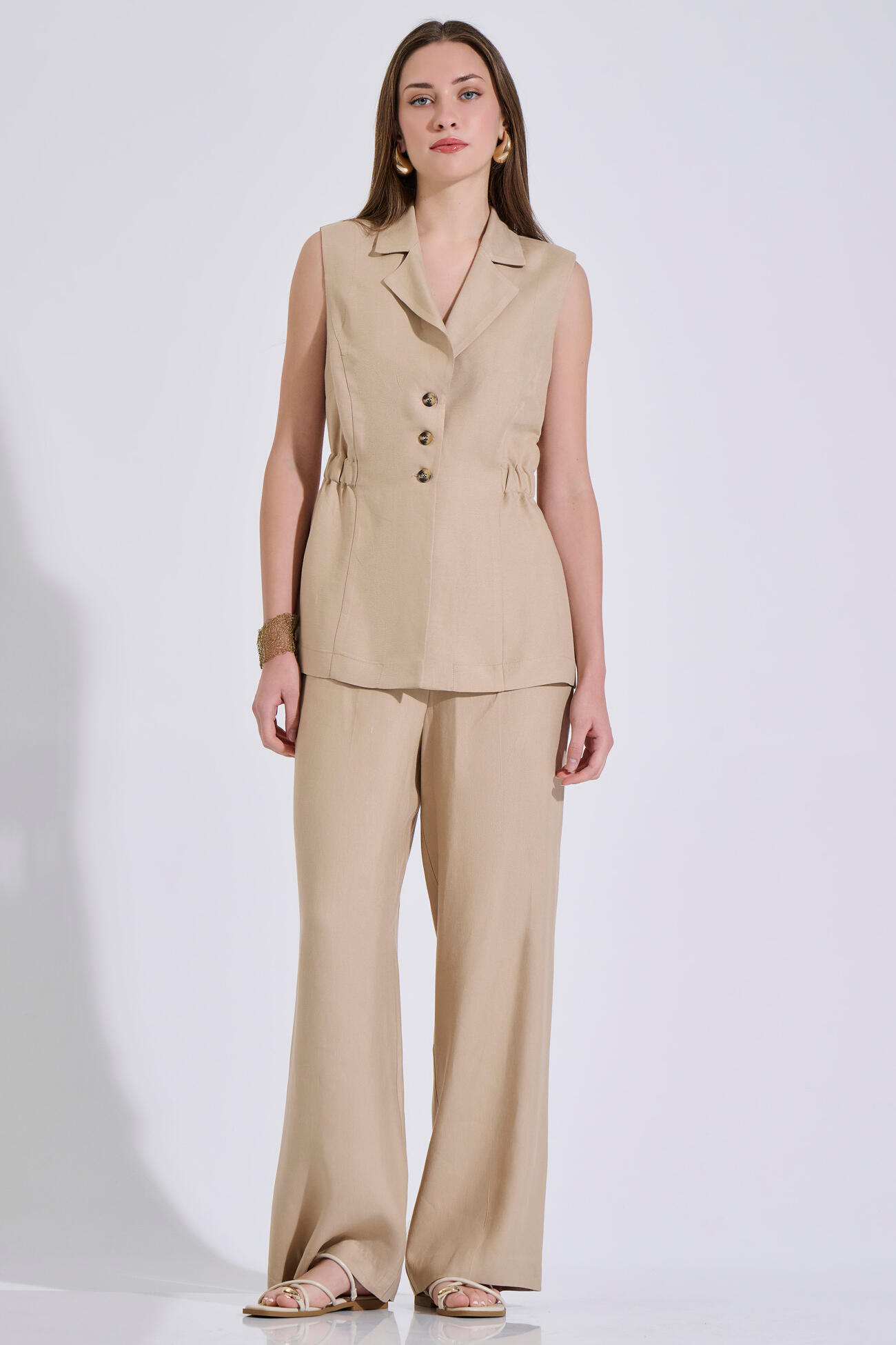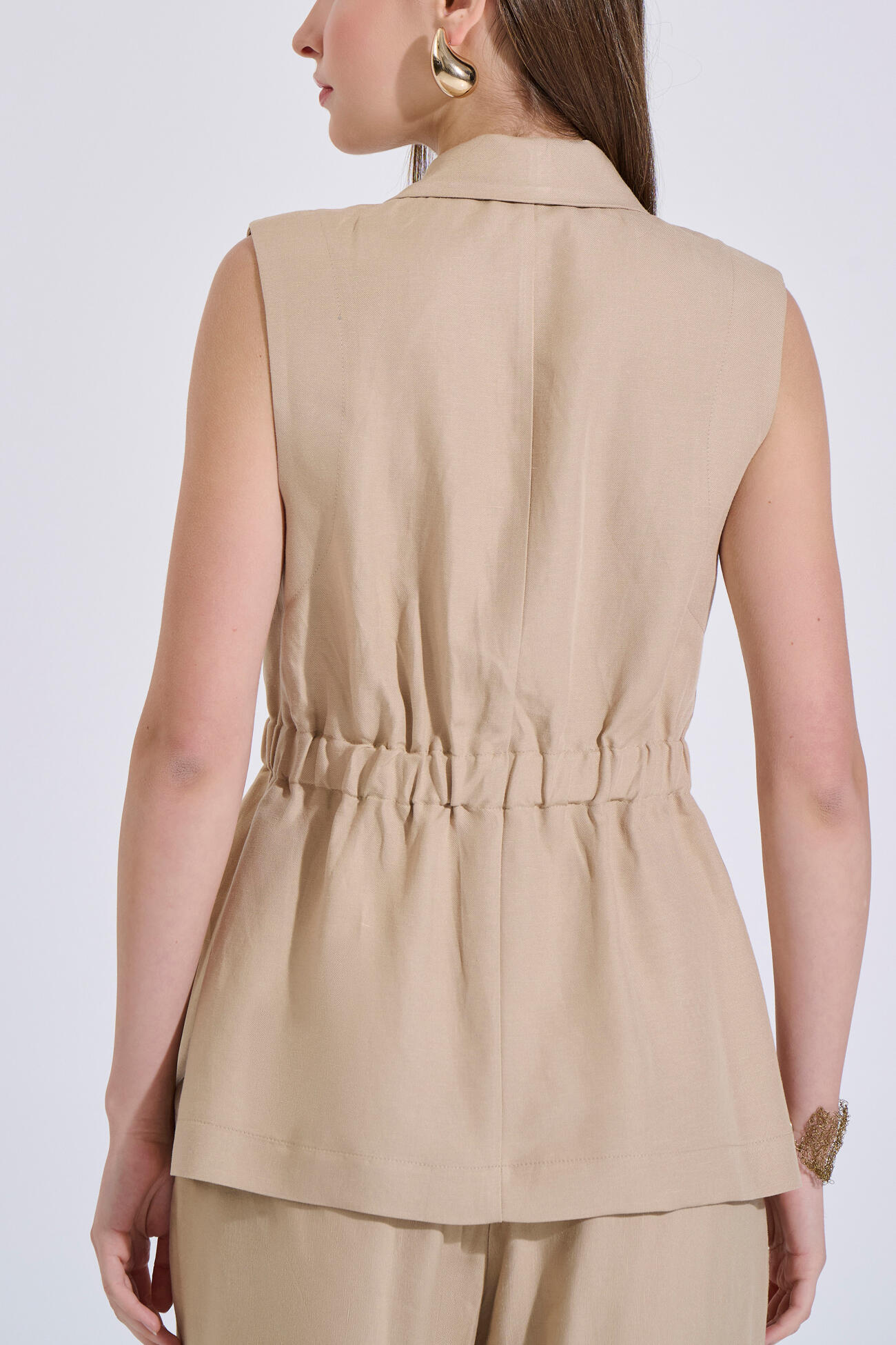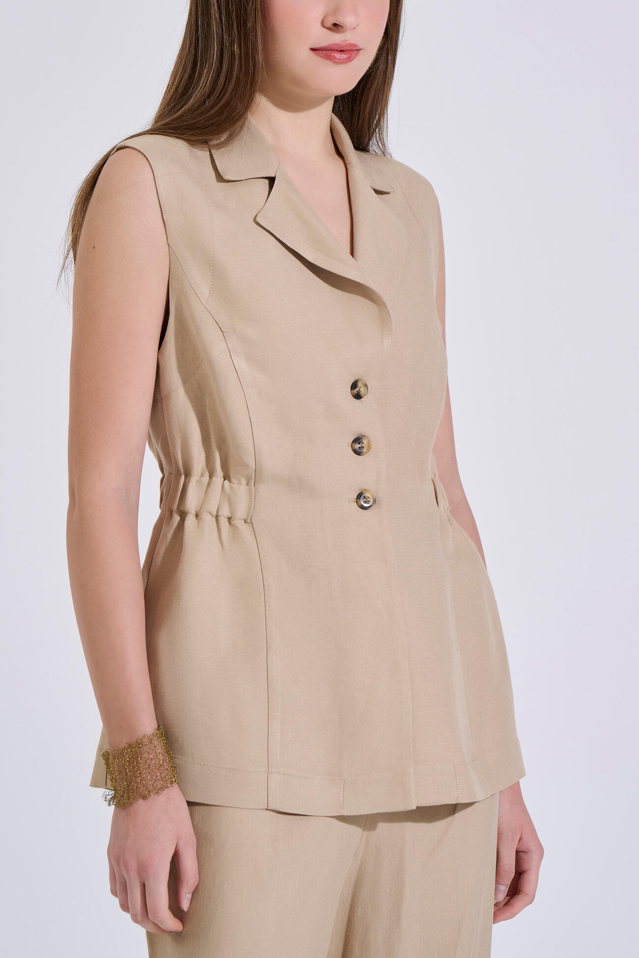 Γιλέκο σε κομψή γραμμή με γιακά με πέτο και μπροστινό κλείσιμο με κουμπιά. Διαθέτει λάστιχο στη μέση που προσαρμόζει την εφαρμογή και αναδεικνύει τη σιλουέτα.
