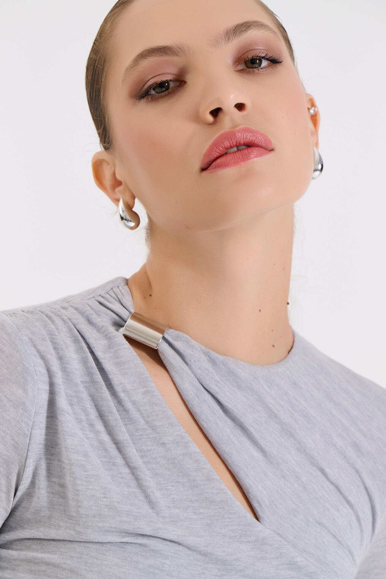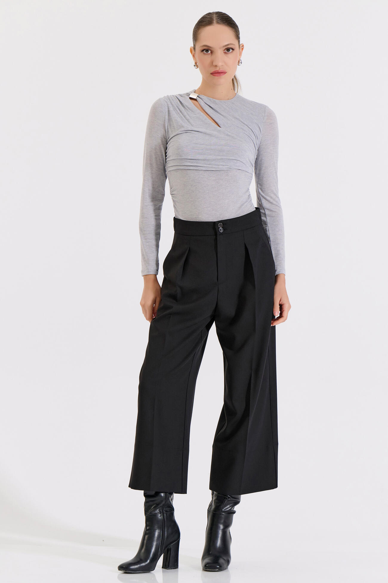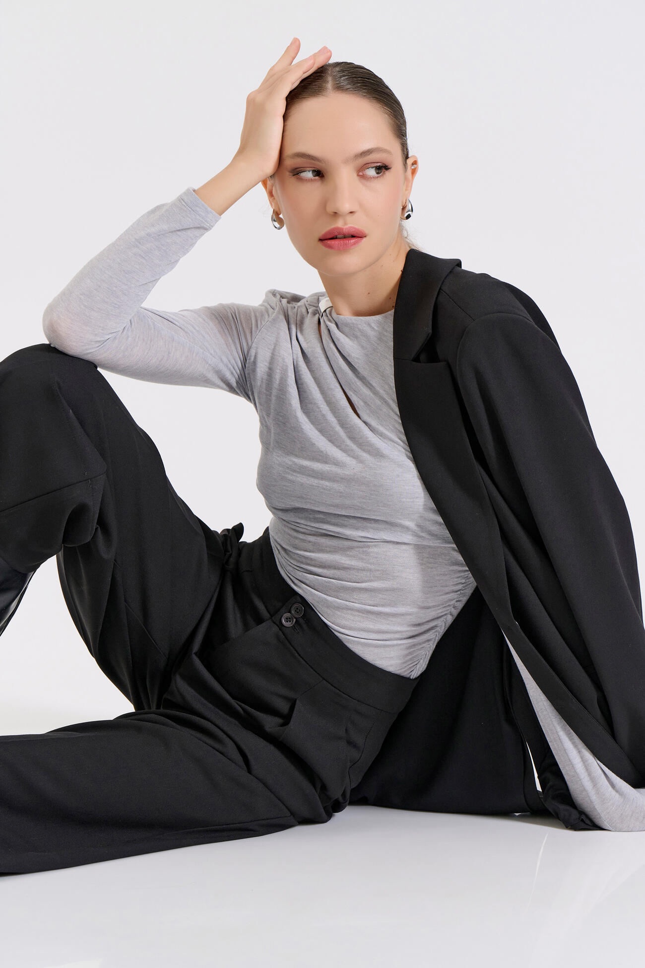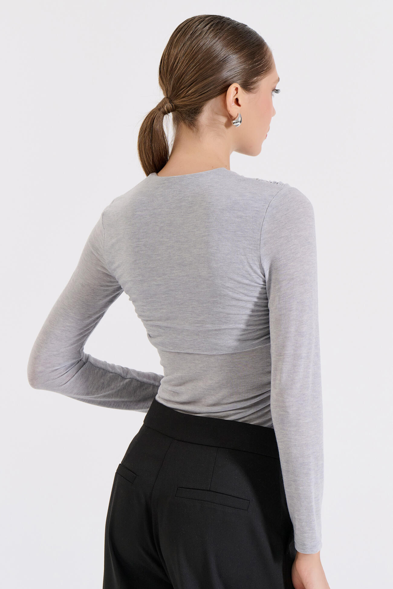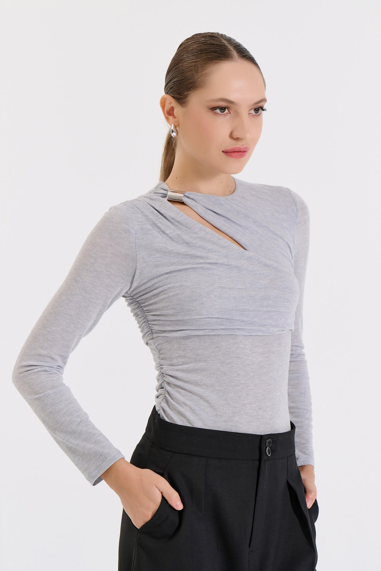 Κομψή μακρυμάνικη μπλούζα με μοντέρνο άνοιγμα στη λαιμόκοψη και διακριτική μεταλλική λεπτομέρεια που αναβαθμίζει το look. Οι σούρες στα πλαϊνά αγκαλιάζουν τη σιλουέτα, χαρίζοντας θηλυκότητα και σύγχρονο στυλ.