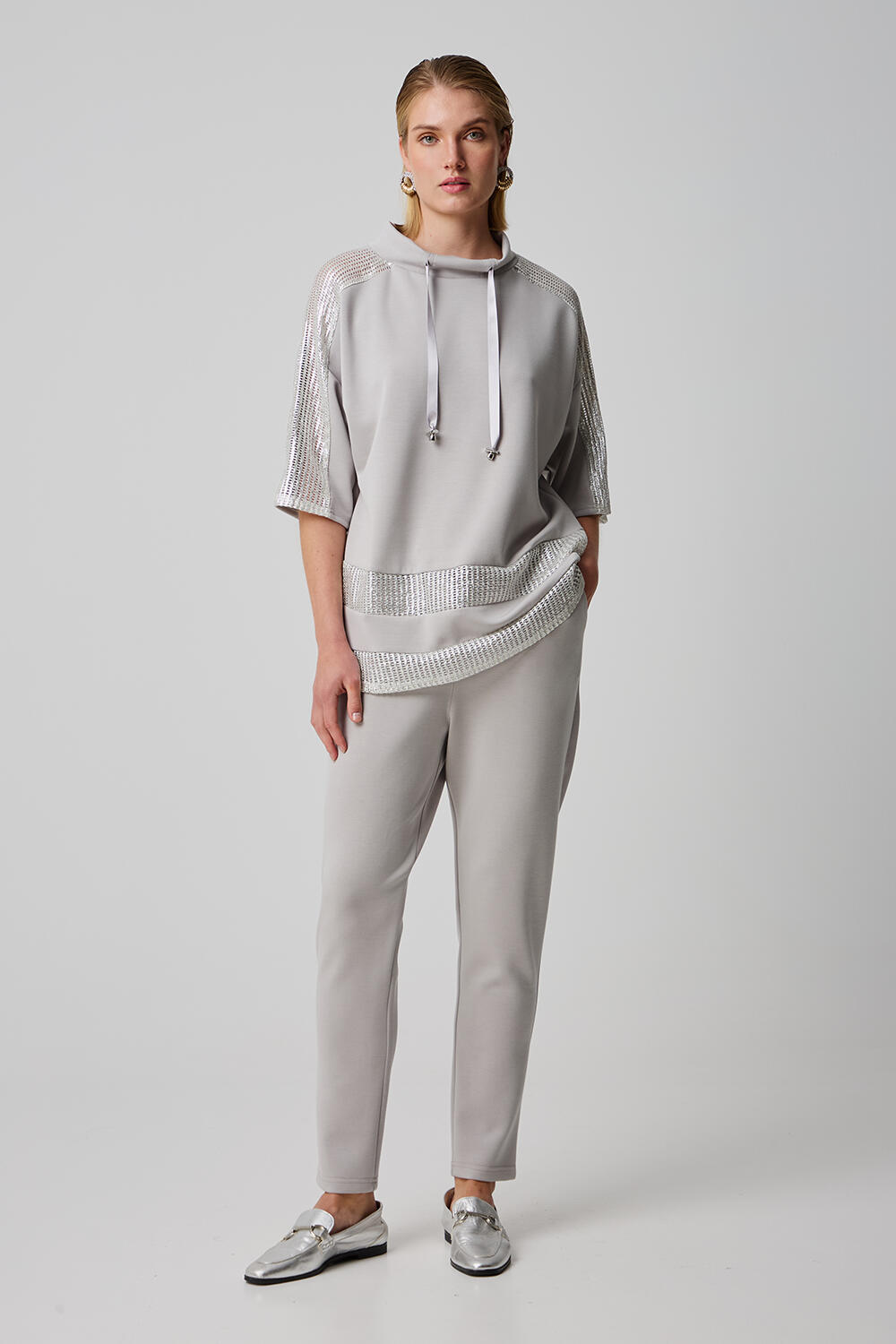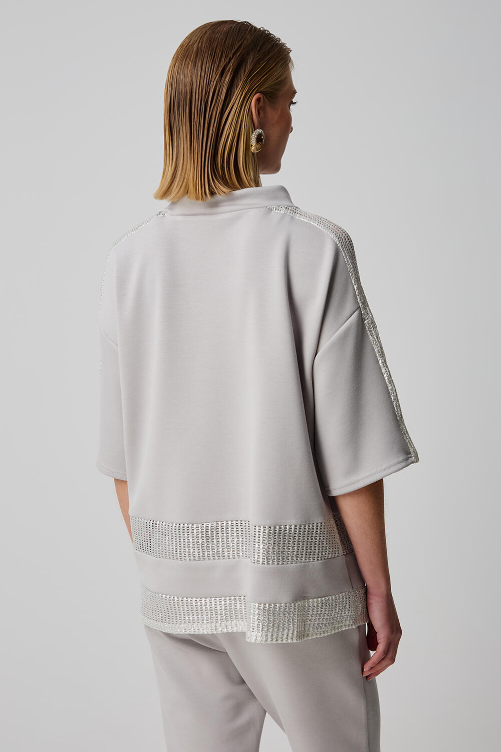 Μπλούζα φούτερ σε συνδυασμό υφασμάτων με φάσα δίχτυ, χαλαρή ζιβάγκο λαιμόκοψη. Συνδυάστε τη με τη 10-240027-0 και 10-240028-0 φόρμα παντελόνι.