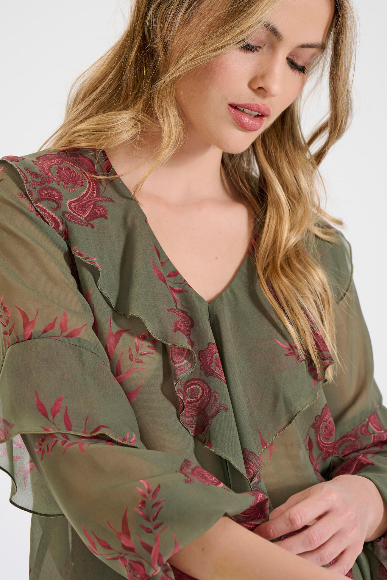Μια κομψή και αέρινη μπλούζα που αποπνέει διακριτική πολυτέλεια. Το φίνο, διάφανο ύφος της αναδεικνύεται μέσα από το εκλεπτυσμένο εμπριμέ μοτίβο, ενώ οι βολάν λεπτομέρειες στη λαιμόκοψη και στα μανίκια προσθέτουν κίνηση και ρευστότητα. Ιδανική για ιδιαίτερες περιστάσεις ή βραδινές εμφανίσεις, συνδυάζεται μοναδικά με tailored παντελόνια ή εκλεπτυσμένες φούστες, δημιουργώντας ένα polished και διαχρονικά κομψό σύνολο.