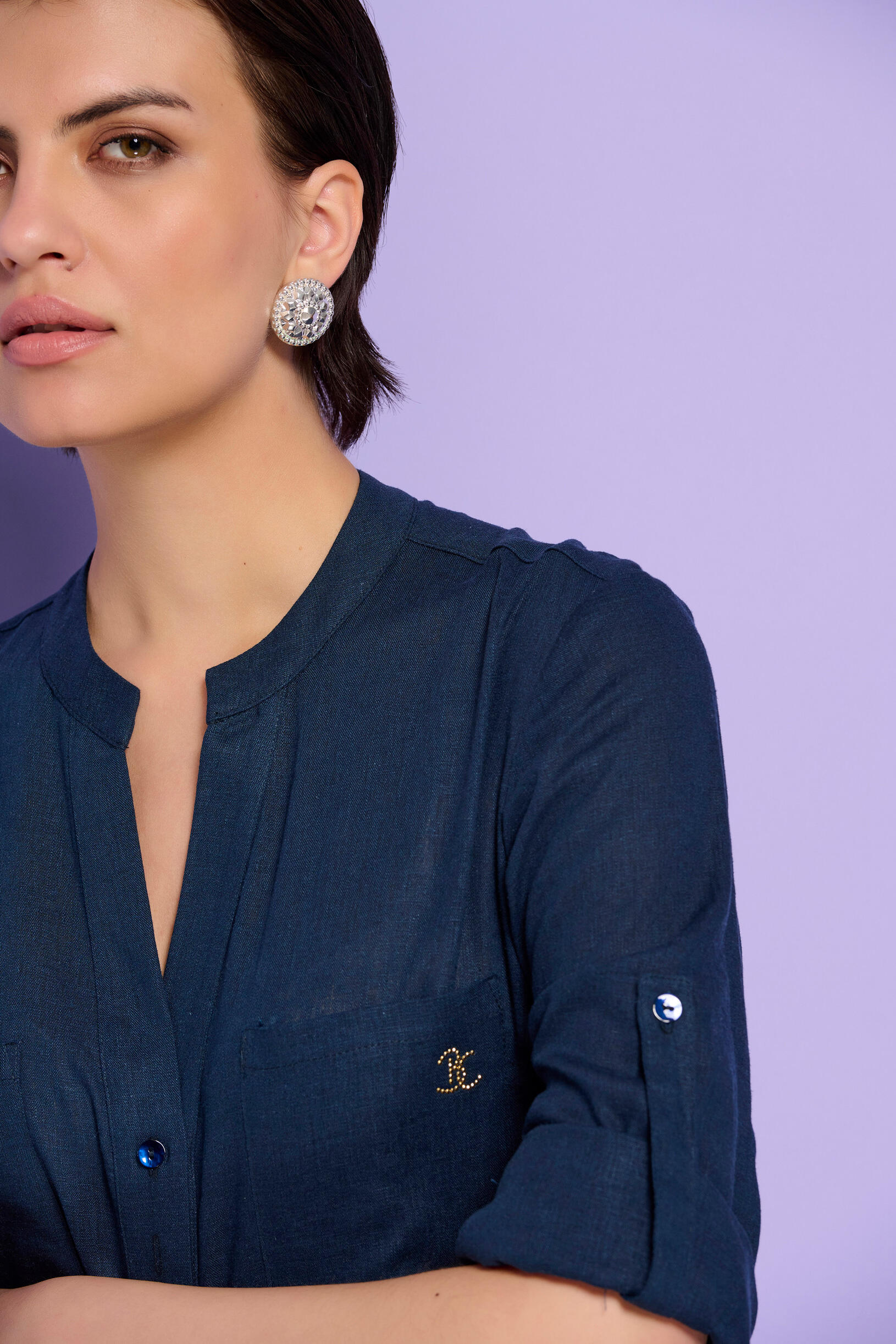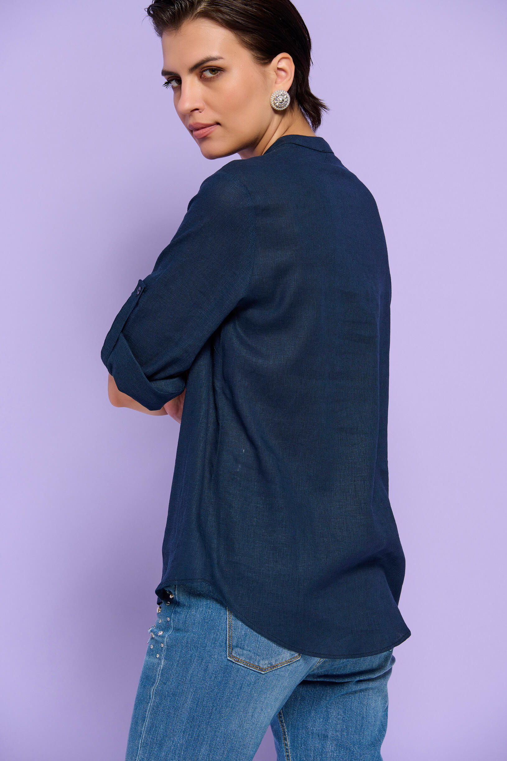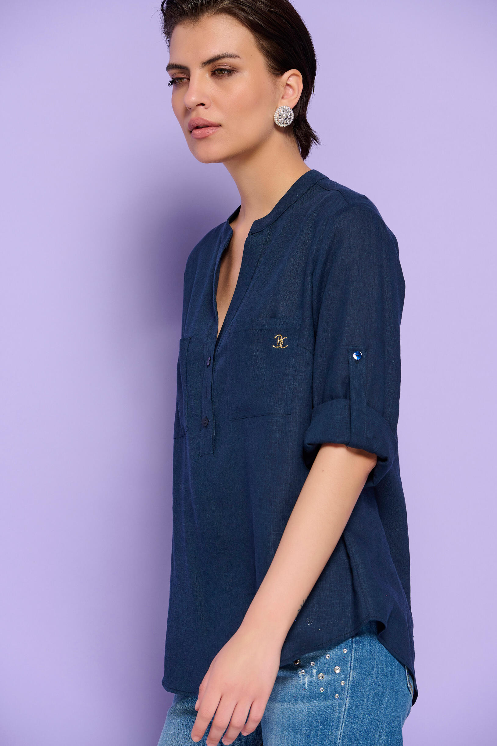 Μπλούζα με λινό και γυριστά μανίκια Κωδικός 10-280476-0 Περιγραφή Μπλούζα με λινό, μάο γιακά και γυριστά 3/4 μανίκια. Ντεκολτέ σε σχήμα V, κλείσιμο με κουμπιά μπροστά. Σύνθεση 55% linen 45% rayon