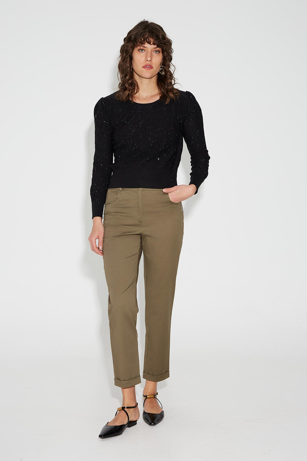 Μπλούζα πλεκτή με μικρή παγιέτα Κωδικός 20-190090-0 Περιγραφή Πλεκτή μπλούζα με μικρή παγιέτα, στρογγυλή λαιμόκοψη και σούρες στους ώμους. Σύνθεση 47% viscose 35% polyester 18% nylon