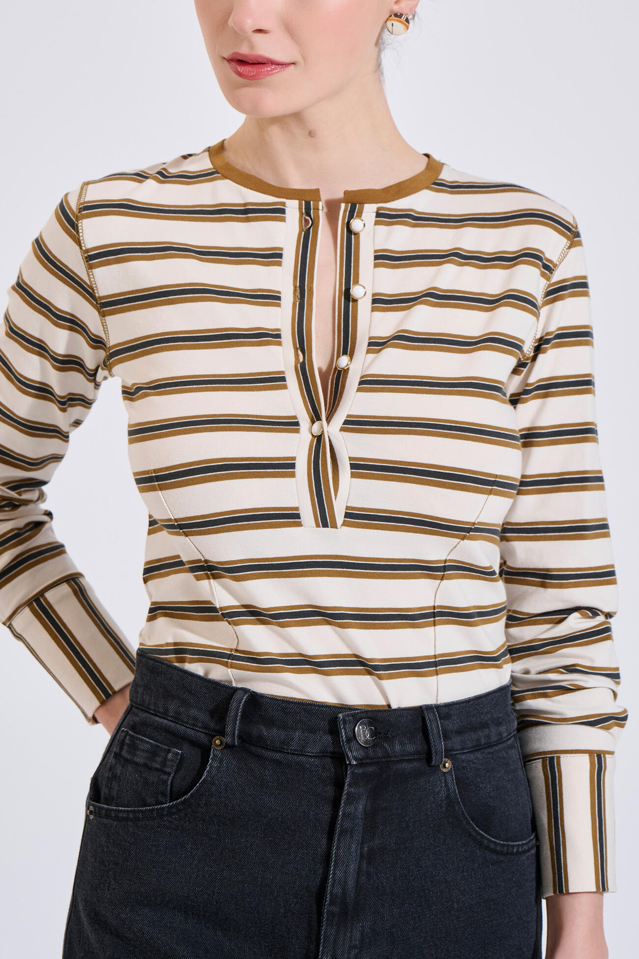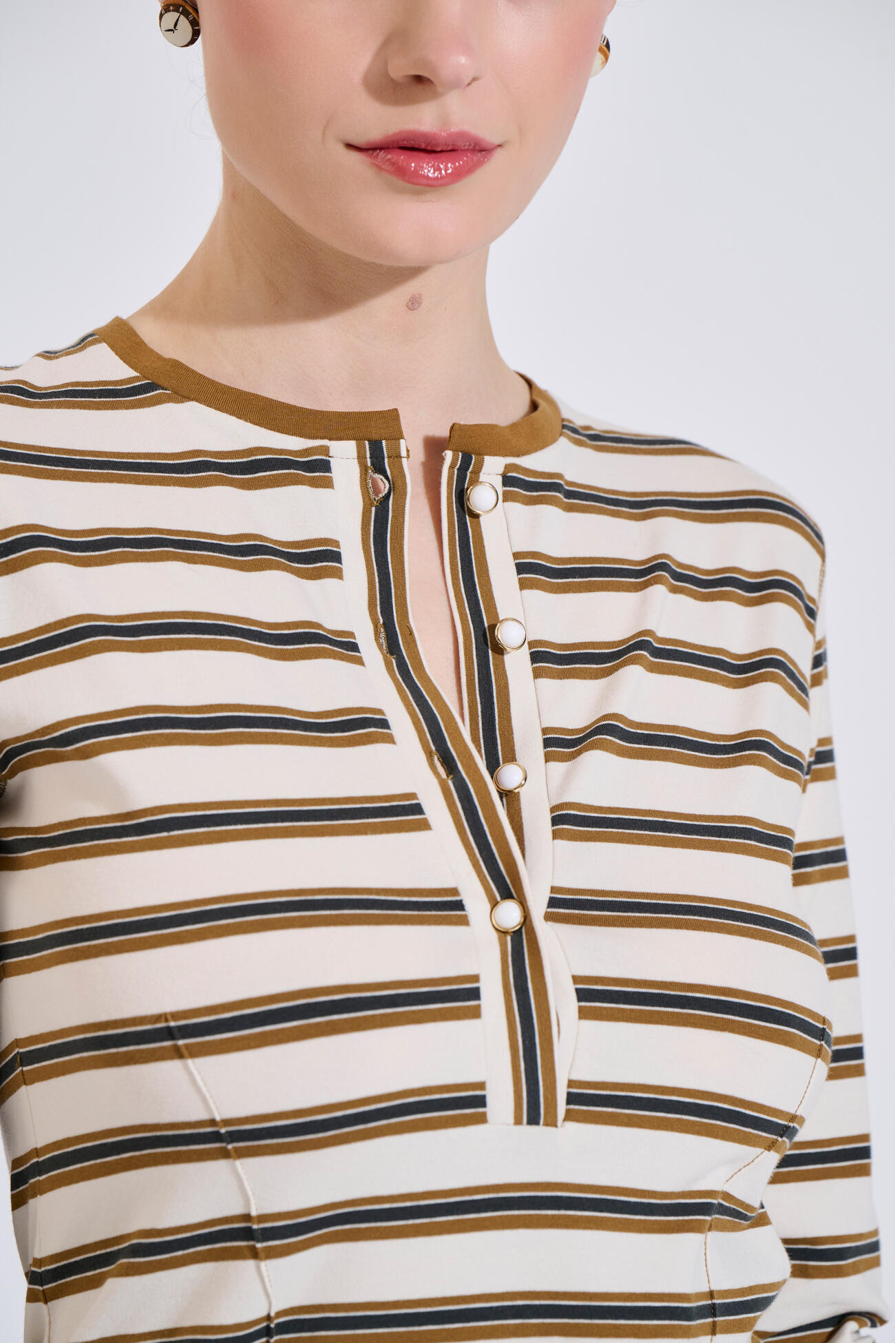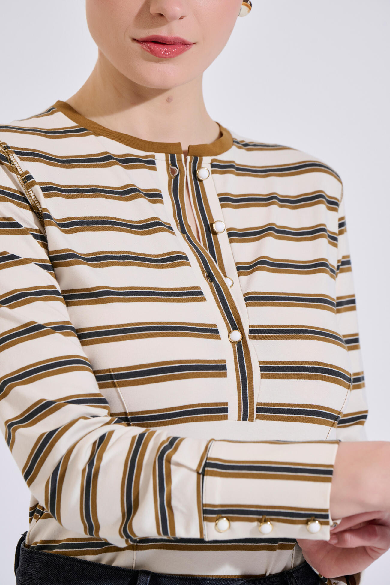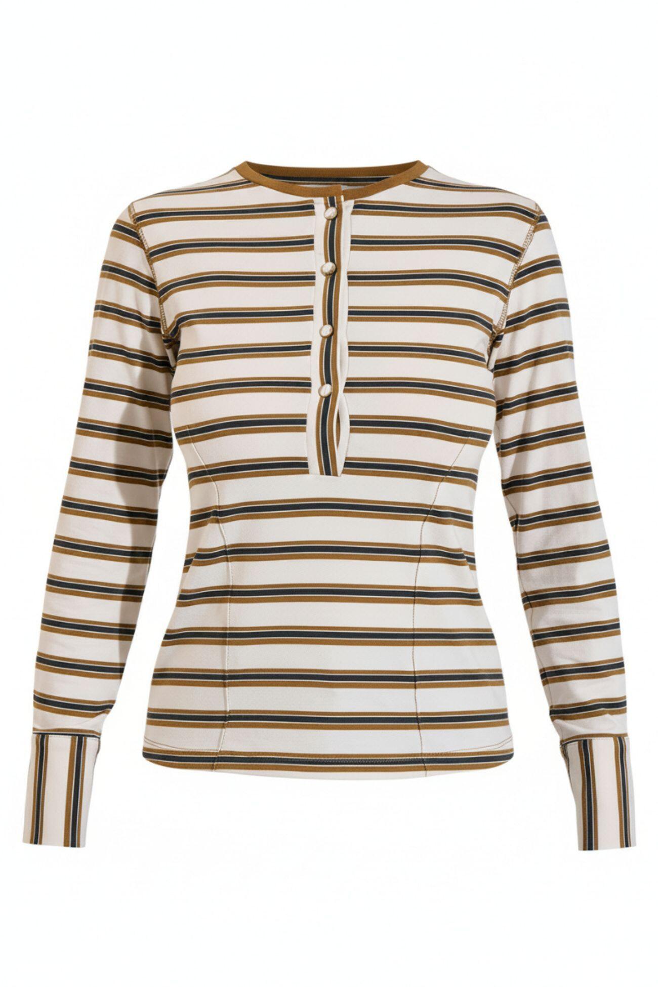 Εφαρμοστή μπλούζα με βαμβάκι, ριγέ σχέδιο, κουμπιά στο ντεκολτέ και στις μανσέτες. Άνετη και κομψή επιλογή για καθημερινές εμφανίσεις.