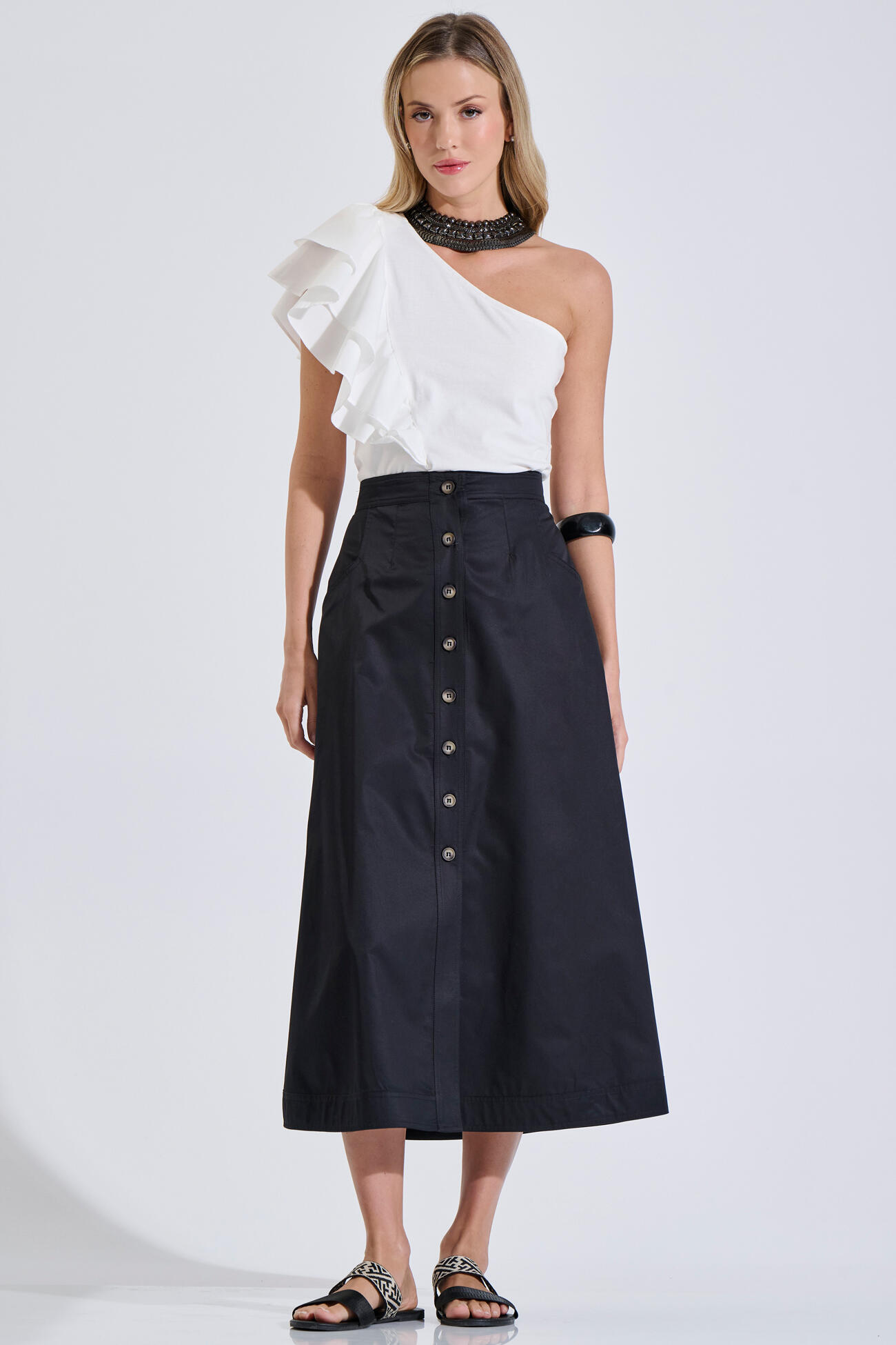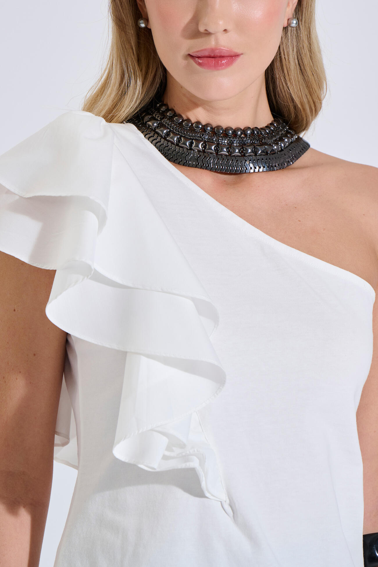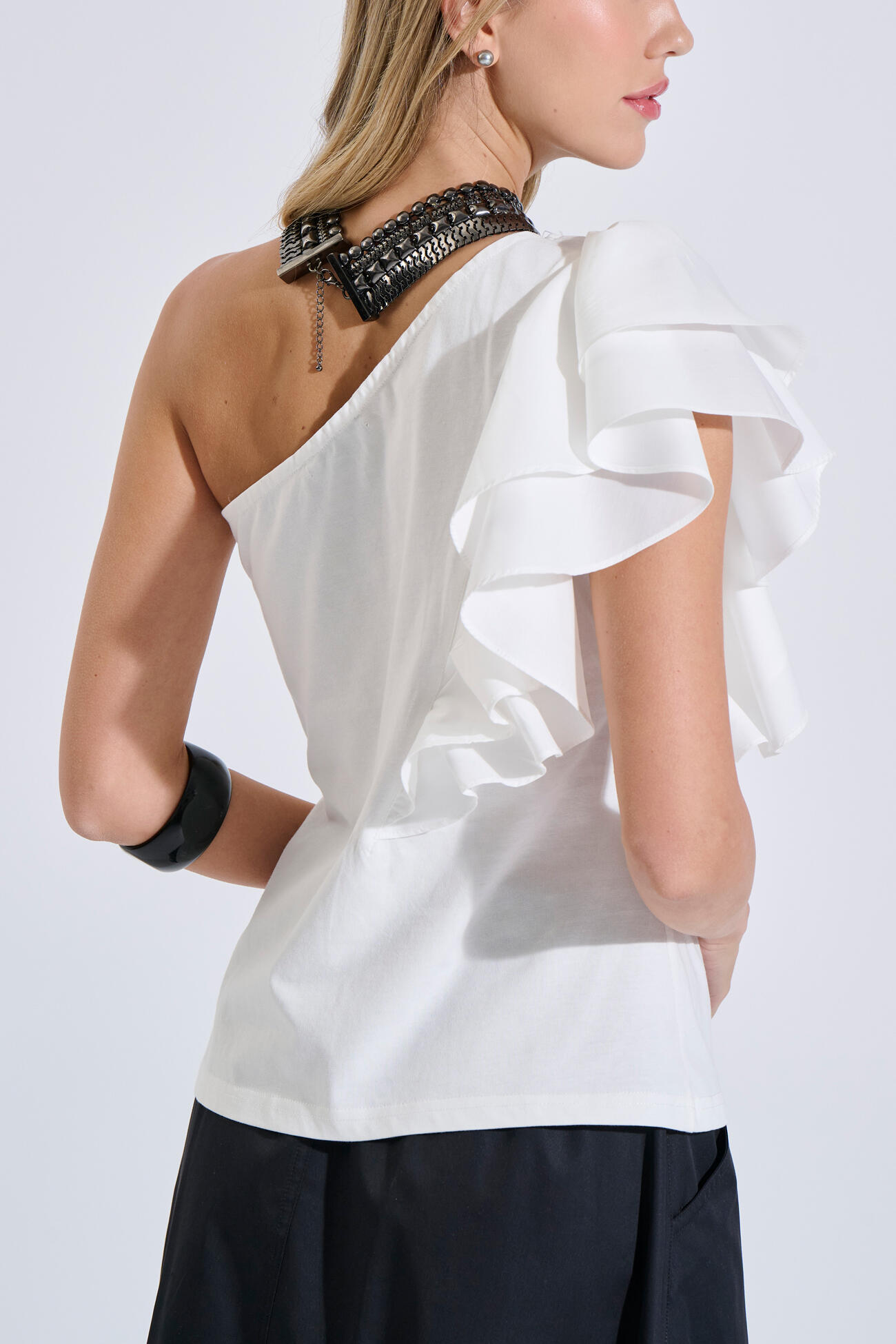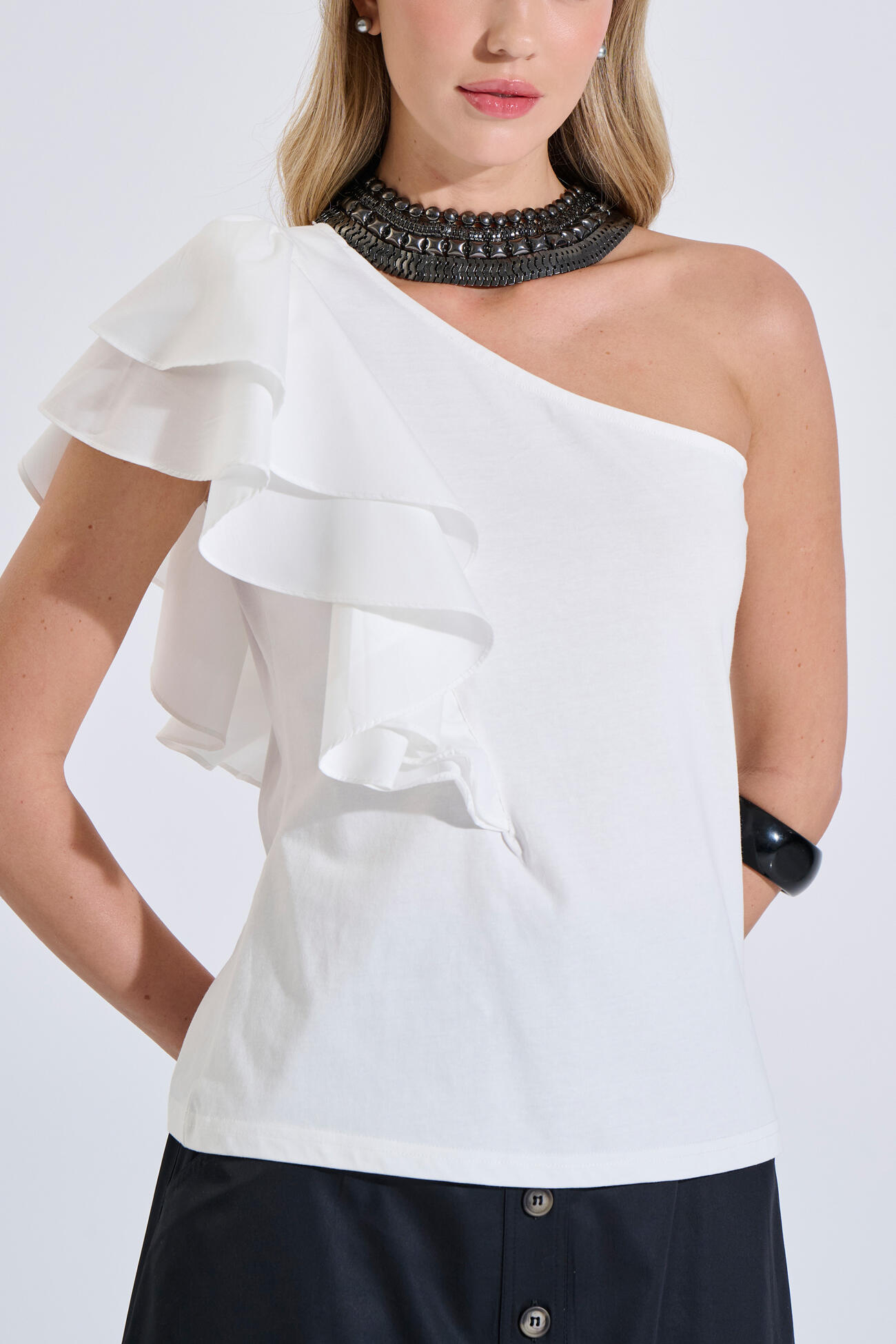 Μπλούζα βαμβακερή σε κομψή γραμμή με έναν ώμο. Διαθέτει συνδυασμό δύο υφασμάτων και διπλό βολάν που χαρίζει κίνηση και θηλυκότητα στο σύνολο. Ιδανική επιλογή για εμφανίσεις με ιδιαίτερο χαρακτήρα.